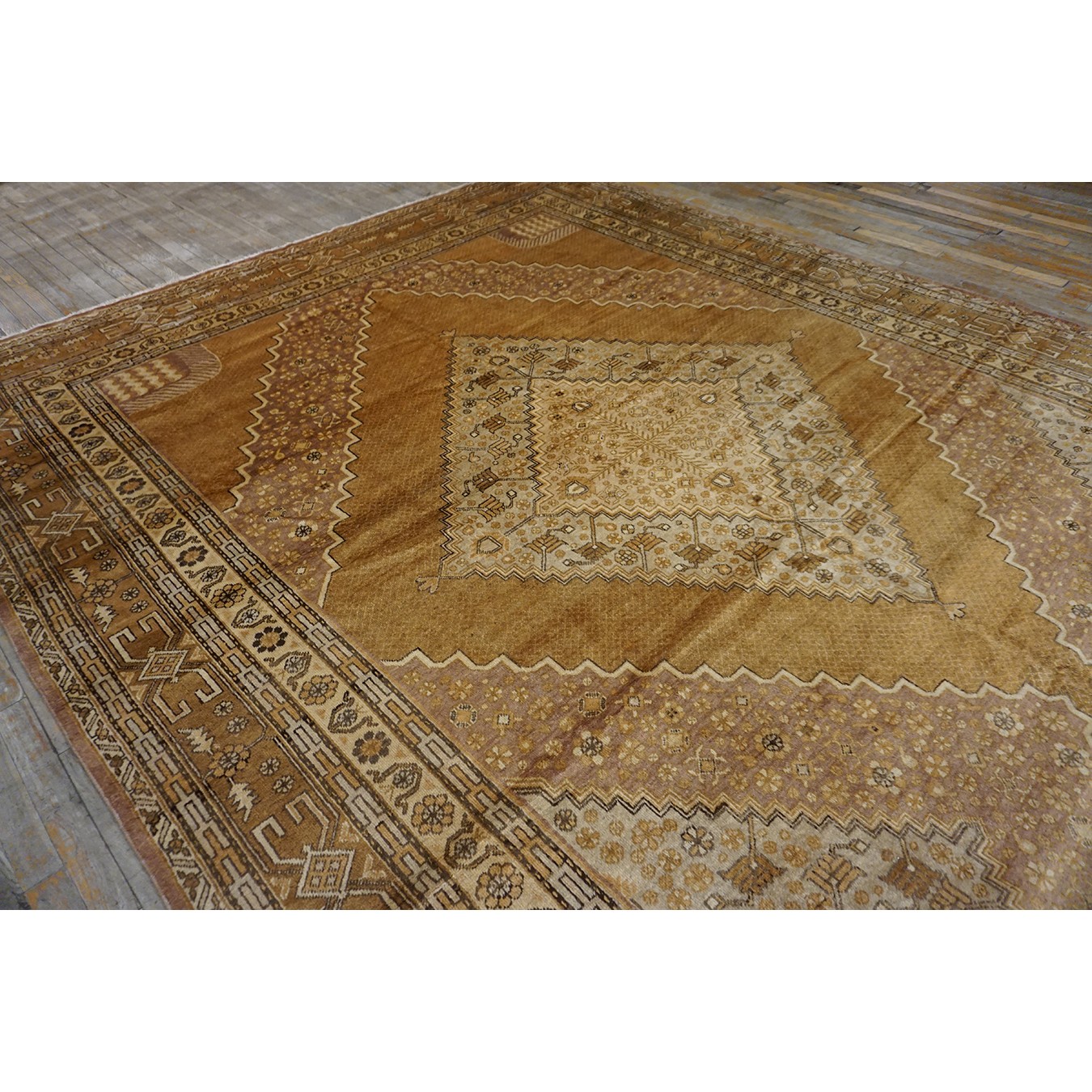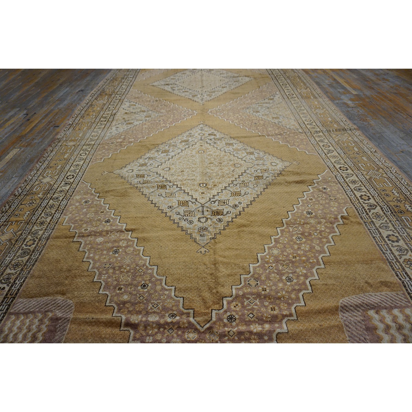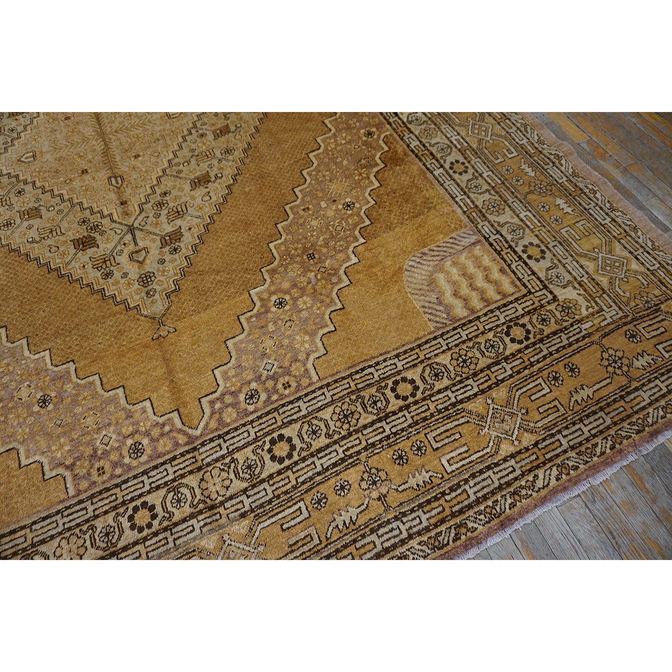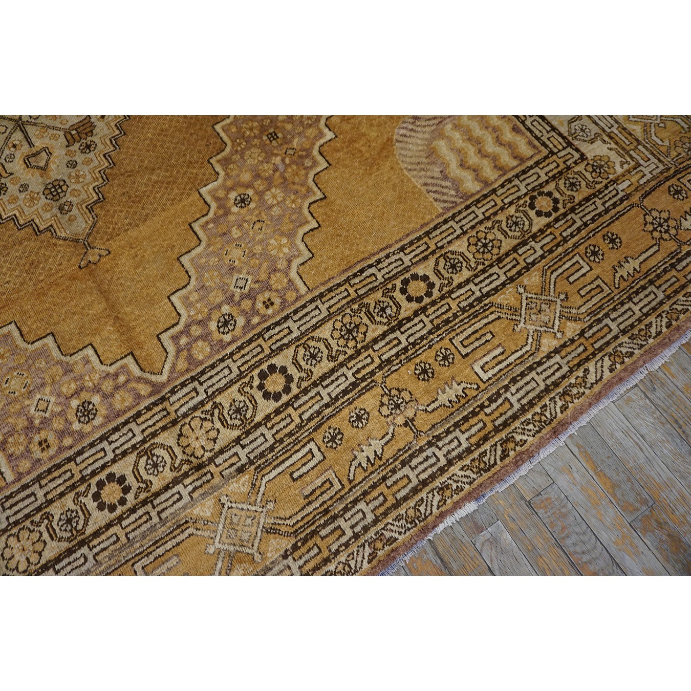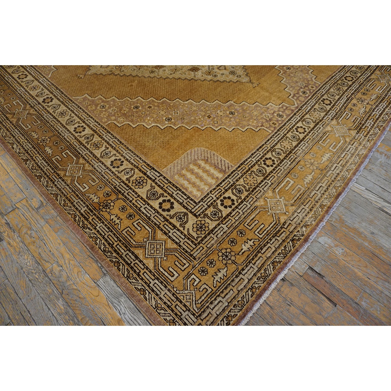 DescriptionChineseCarpets made in China proper. See entries Ningshia, Peking, Art Deco. KhotanThe innermost of the trio of Silk Road cities (with Kashgar and Yarkand), Khotan weaves carpets mostly in the 6 x 12 size with recognizable Chinese iconography, but with central Asian elements and in brighter colors with distinct wool and handle. Later examples use synthetic dyes which have been treated to mellow the colors. Although this later period is not collectible, it is much in demand decoratively. A few smaller rugs and chair seat (2 square) are also encountered. | |