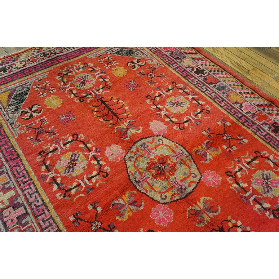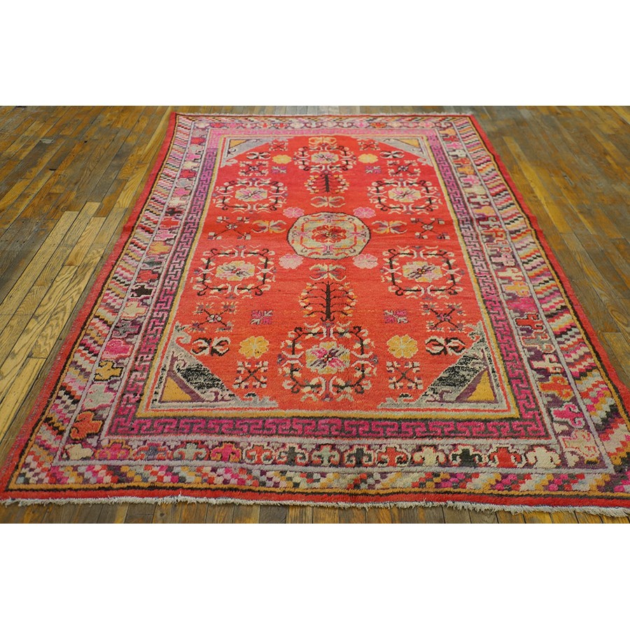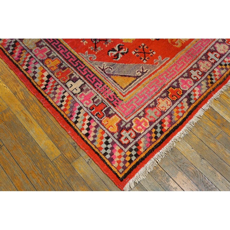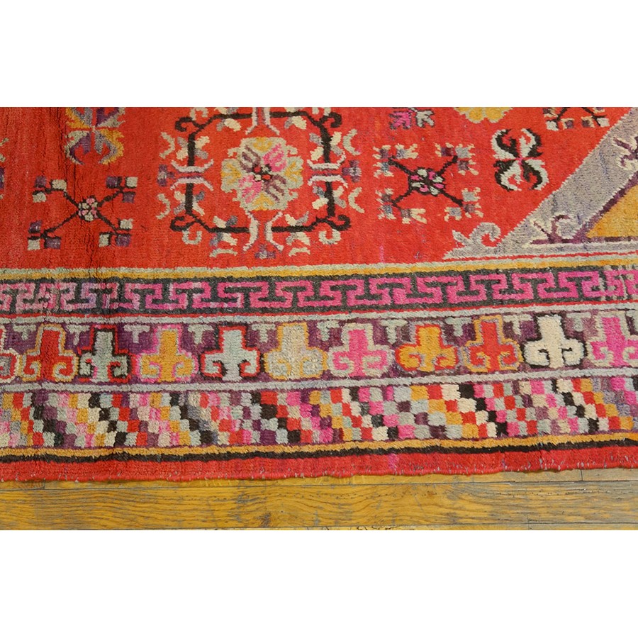 DescriptionChineseCarpets made in China proper. See entries Ningshia, Peking, Art Deco. KhotanThe innermost of the trio of Silk Road cities (with Kashgar and Yarkand), Khotan weaves carpets mostly in the 6 x 12 size with recognizable Chinese iconography, but with central Asian elements and in brighter colors with distinct wool and handle. Later examples use synthetic dyes which have been treated to mellow the colors. Although this later period is not collectible, it is much in demand decoratively. A few smaller rugs and chair seat (2 square) are also encountered. | |