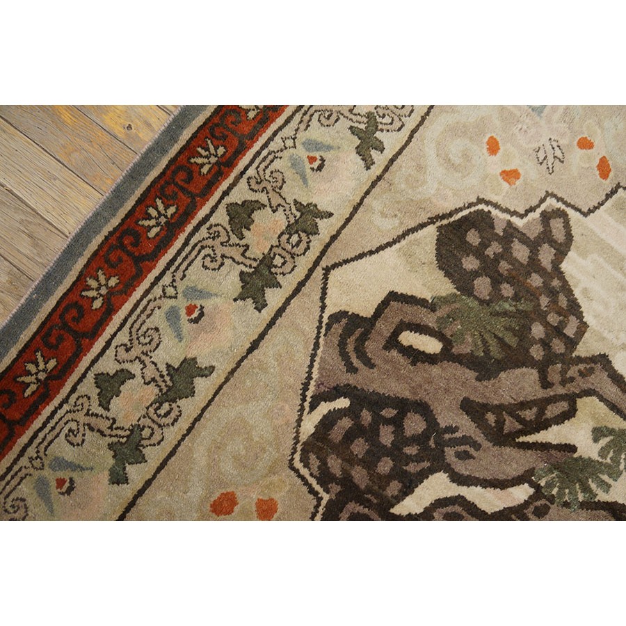 DescriptionChineseCarpets made in China proper. See entries Ningshia, Peking, Art Deco. KhotanThe innermost of the trio of Silk Road cities (with Kashgar and Yarkand), Khotan weaves carpets mostly in the 6 x 12 size with recognizable Chinese iconography, but with central Asian elements and in brighter colors with distinct wool and handle. Later examples use synthetic dyes which have been treated to mellow the colors. Although this later period is not collectible, it is much in demand decoratively. A few smaller rugs and chair seat (2 square) are also encountered. | |