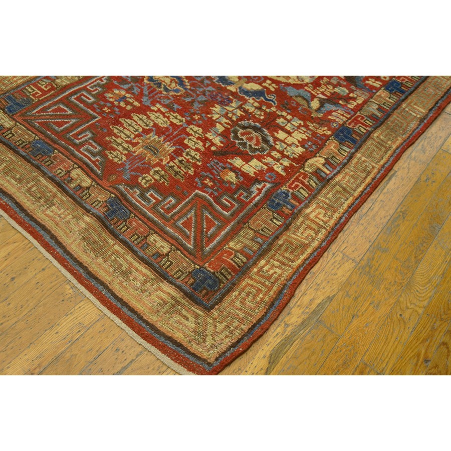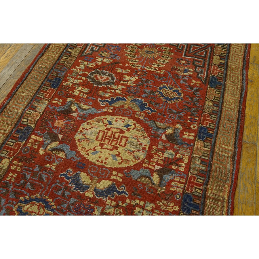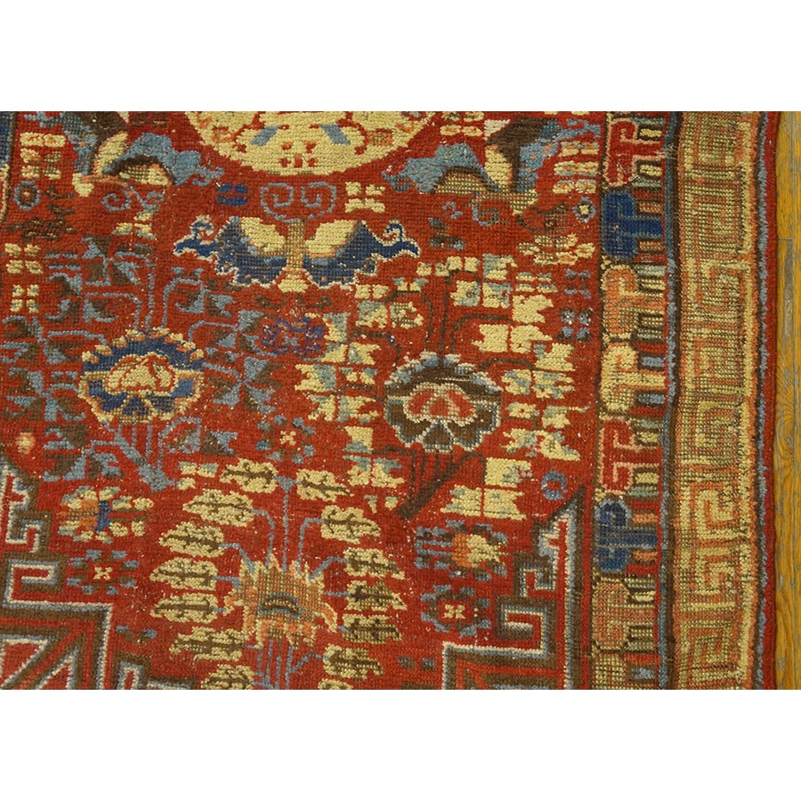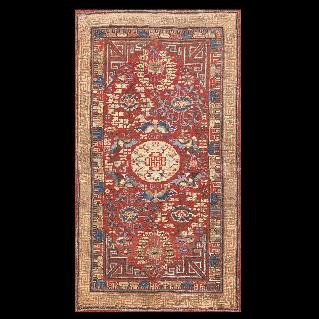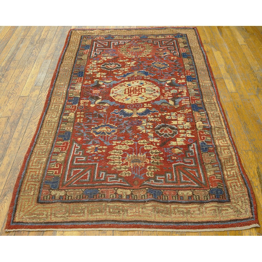 DescriptionChineseCarpets made in China proper. See entries Ningshia, Peking, Art Deco. KhotanThe innermost of the trio of Silk Road cities (with Kashgar and Yarkand), Khotan weaves carpets mostly in the 6 x 12 size with recognizable Chinese iconography, but with central Asian elements and in brighter colors with distinct wool and handle. Later examples use synthetic dyes which have been treated to mellow the colors. Although this later period is not collectible, it is much in demand decoratively. A few smaller rugs and chair seat (2 square) are also encountered. | |