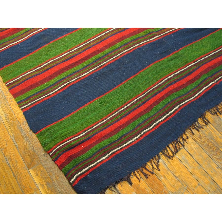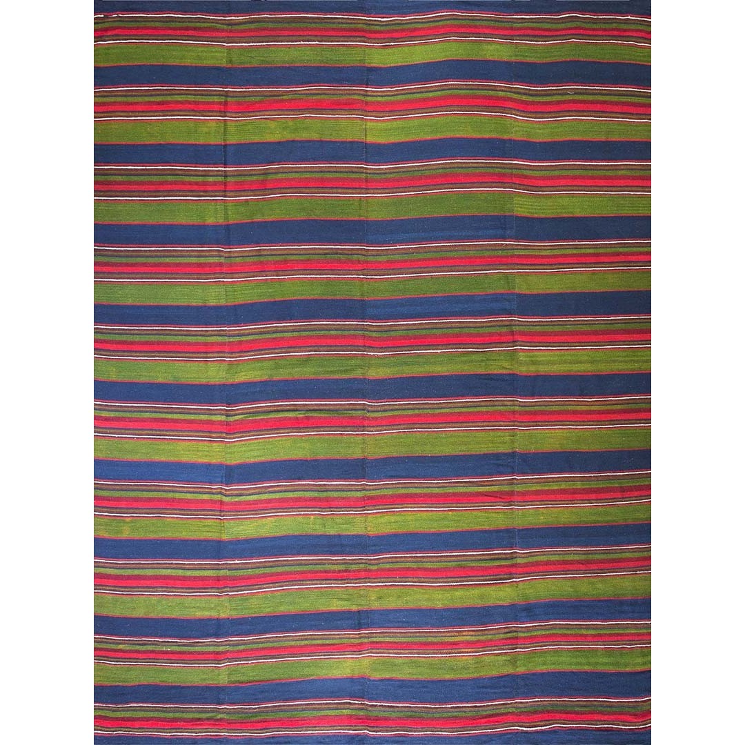Woven in one piece, with horizontal stripes of medium blue, red, orange, ivory and black, this village flat-woven carpet looks totally up-to-date although in fact it was woven c. 1930. Room size old kilims are uncommon and this one is in top condition, with no disturbing patches or reweaves.