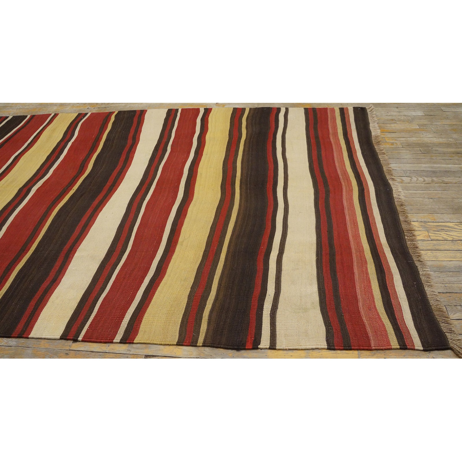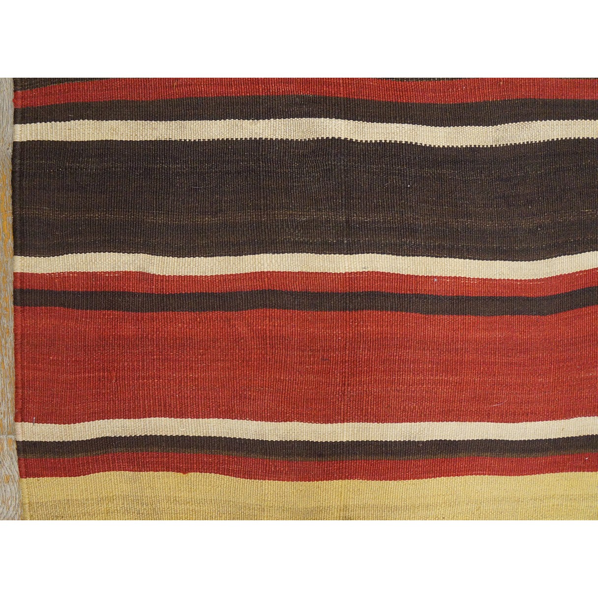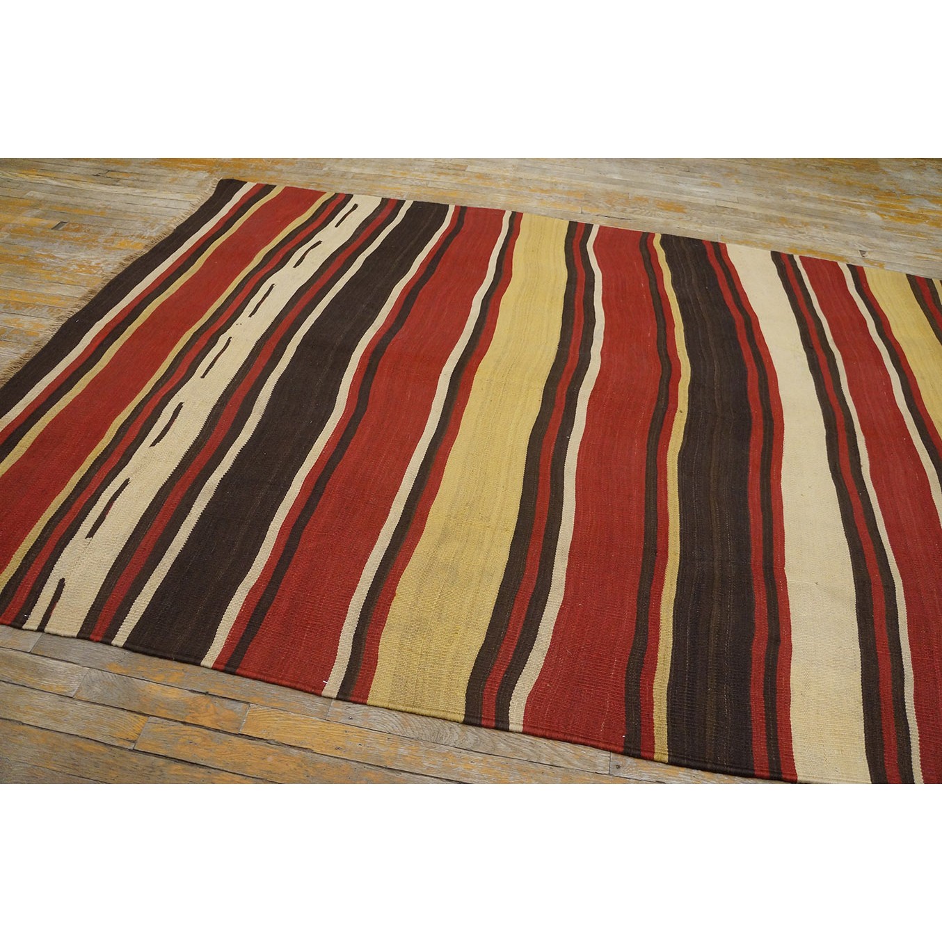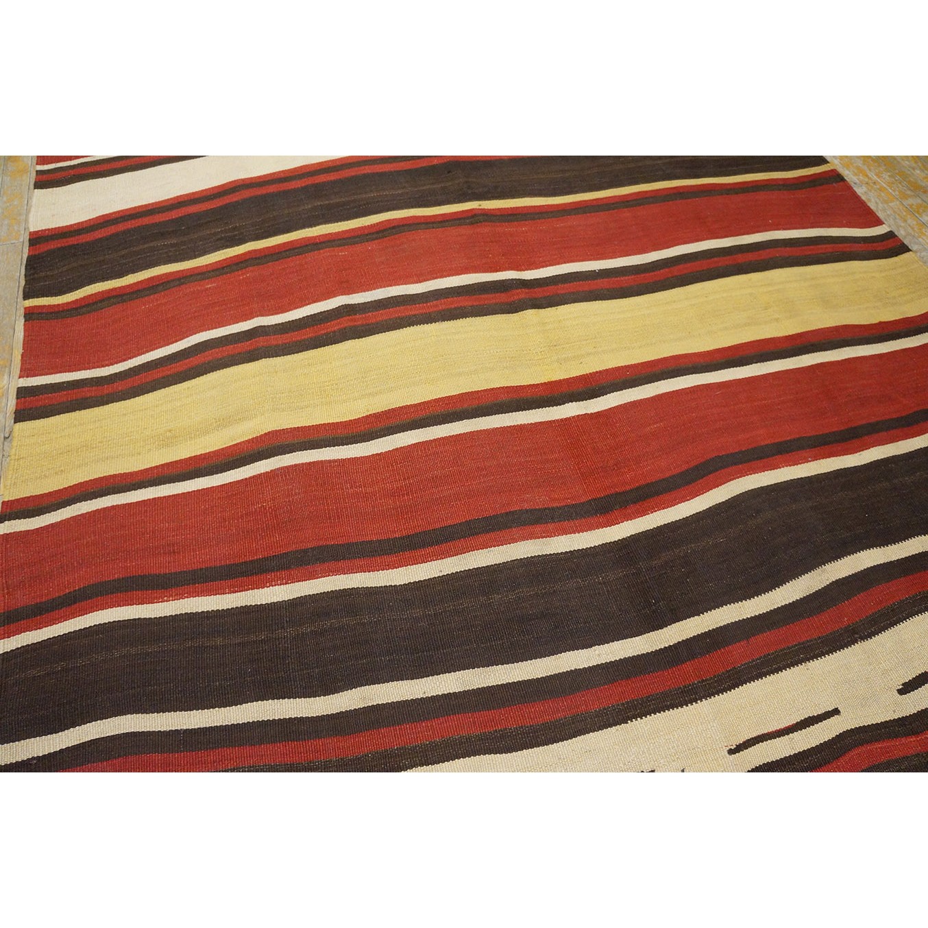 A colorful variety of stripes wanders erratically across this early 20th century tribal weaving. Pale yellow, madder red, dark brown and ivory in non-repeating order provide an informal and wholly contemporary look. There are no repairs to mar the tonal flow across the rug.