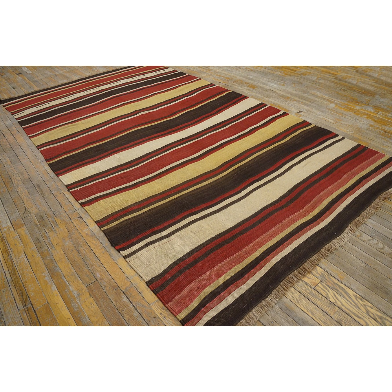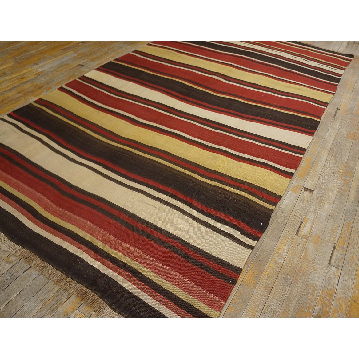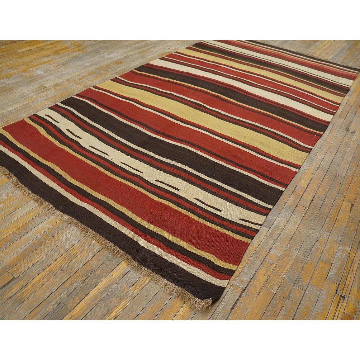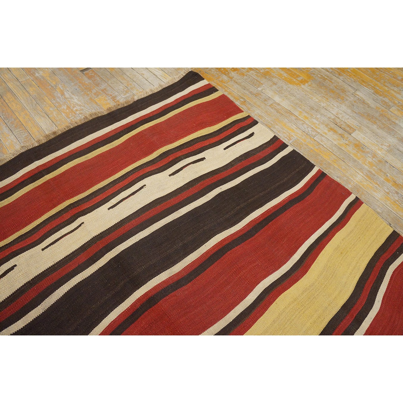 A colorful variety of stripes wanders erratically across this early 20th century tribal weaving. Pale yellow, madder red, dark brown and ivory in non-repeating order provide an informal and wholly contemporary look. There are no repairs to mar the tonal flow across the rug.