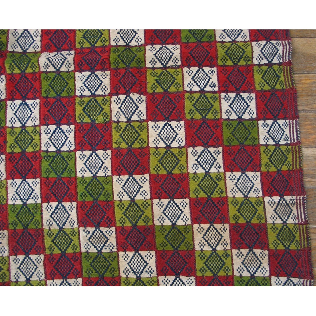DescriptionKilimGenerically, are pileless, flat rug woven in a tapestry technique whether or not the color pattern joins are left open, or the slits are closed by interlocking or warp sharing. The technique is used all over the rug belt for quickly made simply patterned, inexpensive pieces. (Senha Kilims are the exception.) Kilims are made everywhere Turkey, the Caucasus, Iran, Afghanistan. The India dhurrie is a form of kilim and in the new world Navajo and Rio Grande blankets and rugs are also kilims. Designs are structurally determined and hence usually geometric, excepting the more delicate and curvilinear senha kilims. Besides use as floor coverings, kilims may be used for saddle bags and decorative hangings (pardeh), among other native uses. | |