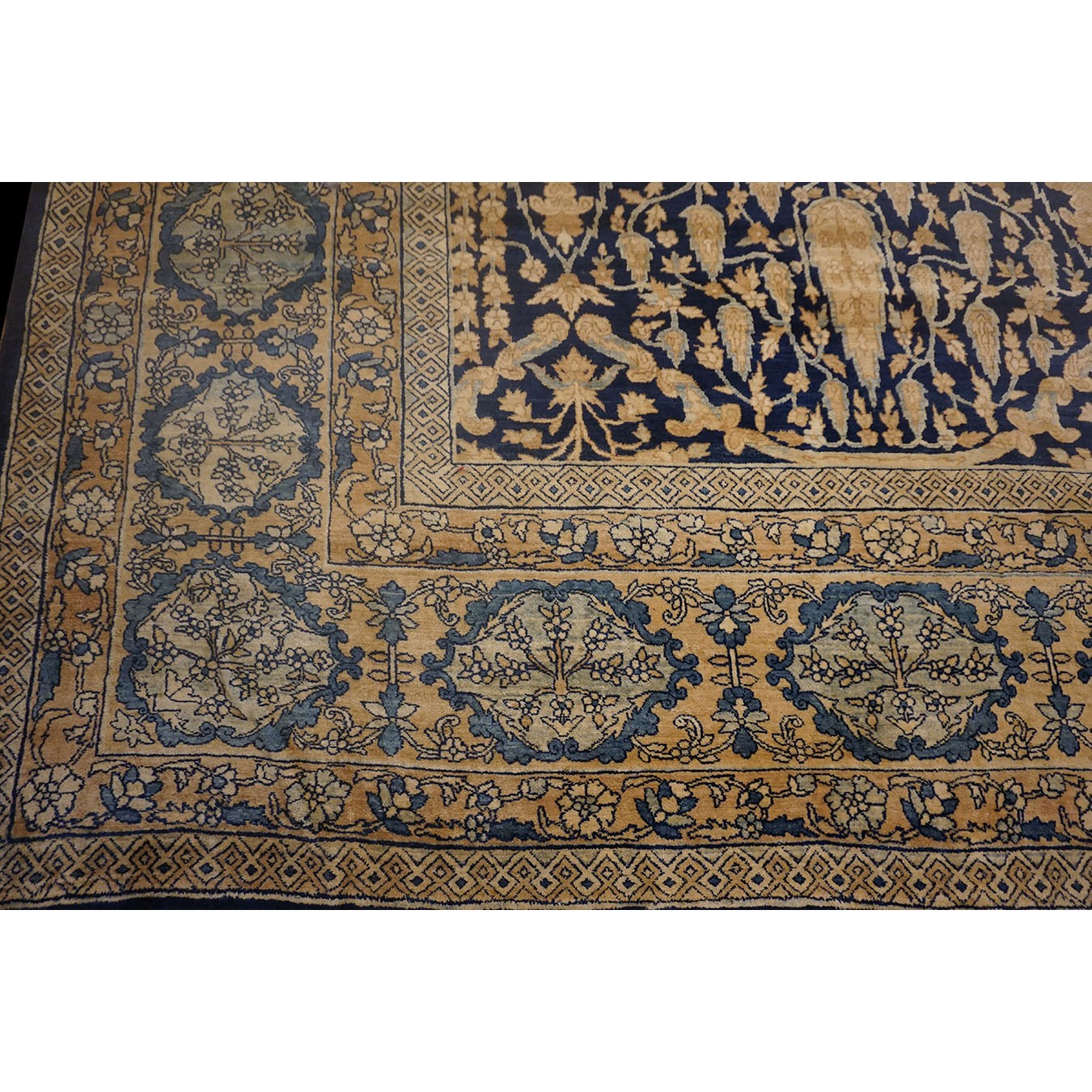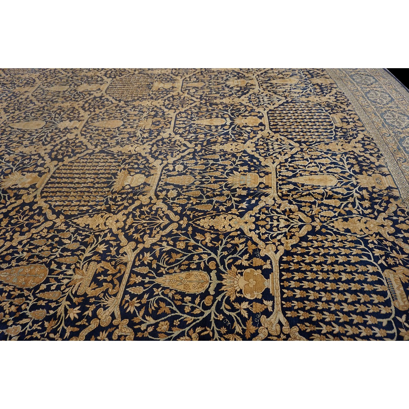 This massive southeast Persian rug displays cypresses and urns in a complex overall large octagonal lattice on a royal blue ground. A golden main border with flowering cartouches discreetly frames the whole. The blue and gold tonality is suitably royal in the best Persian style. The generous scale makes this a perfect city carpet for a sophisticated buyer.