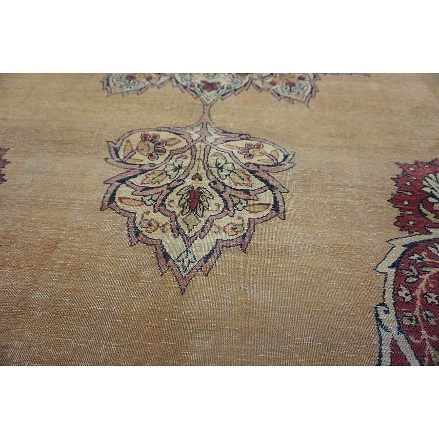 Not all Kerman Lavar carpets have dense designs. The unusual open camel ground of this late 19th century rug sets off the 16 point pend-anted ivory medallion. The Bordeaux red corners emit swirling arabesques. The five narrow borders employ versions of tendrils and palmettes from the infinite Kerman design pool. This southeastern Persian carpet is emphatic in its centrality and focus.