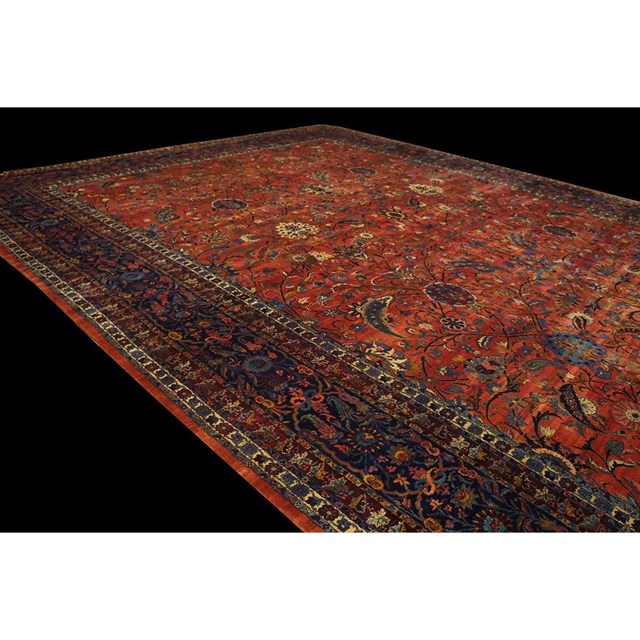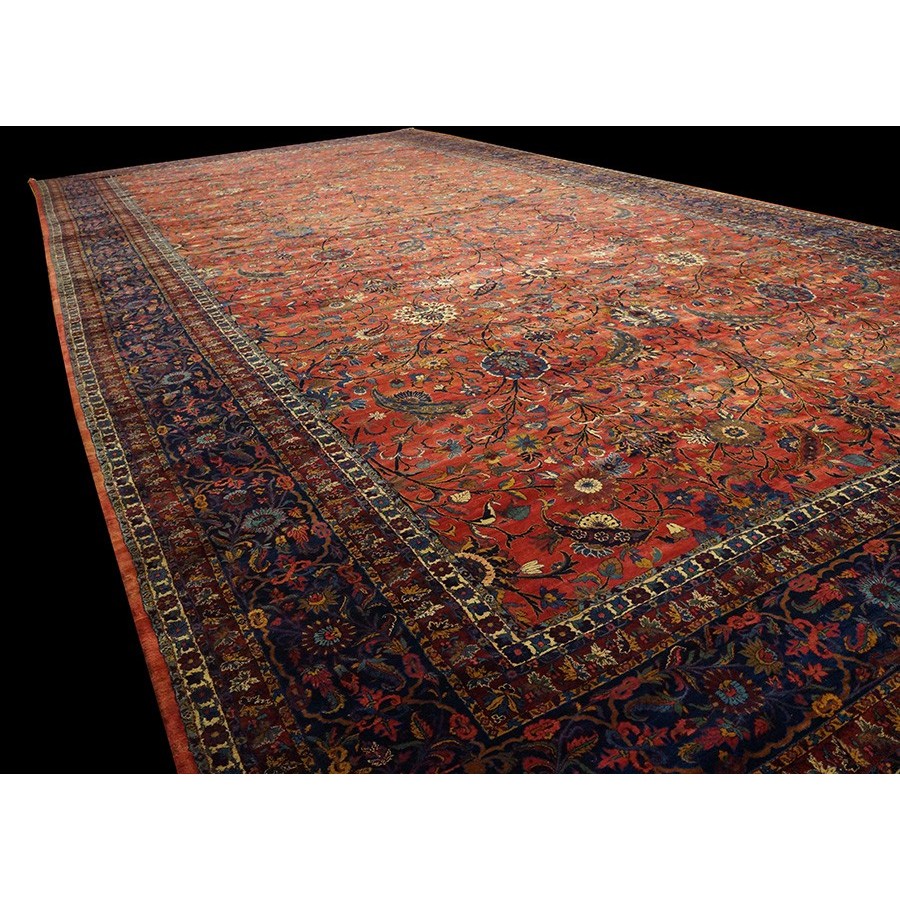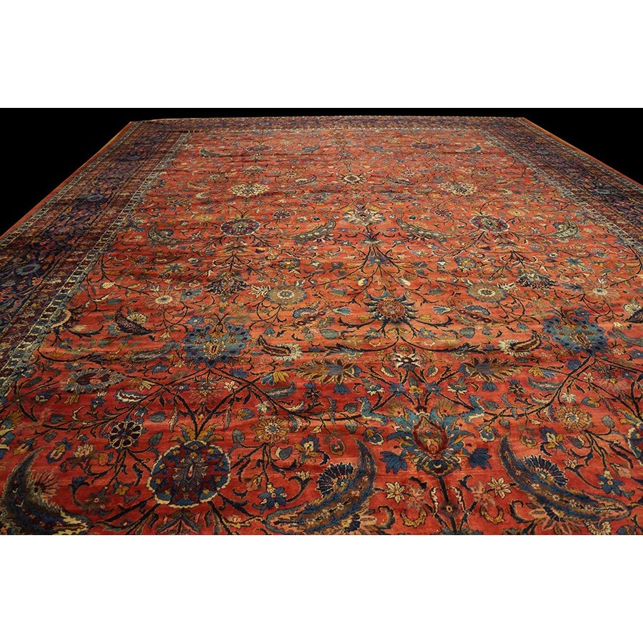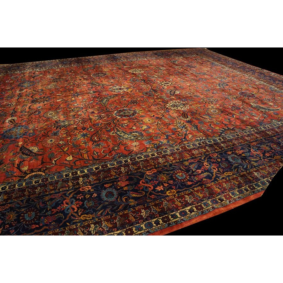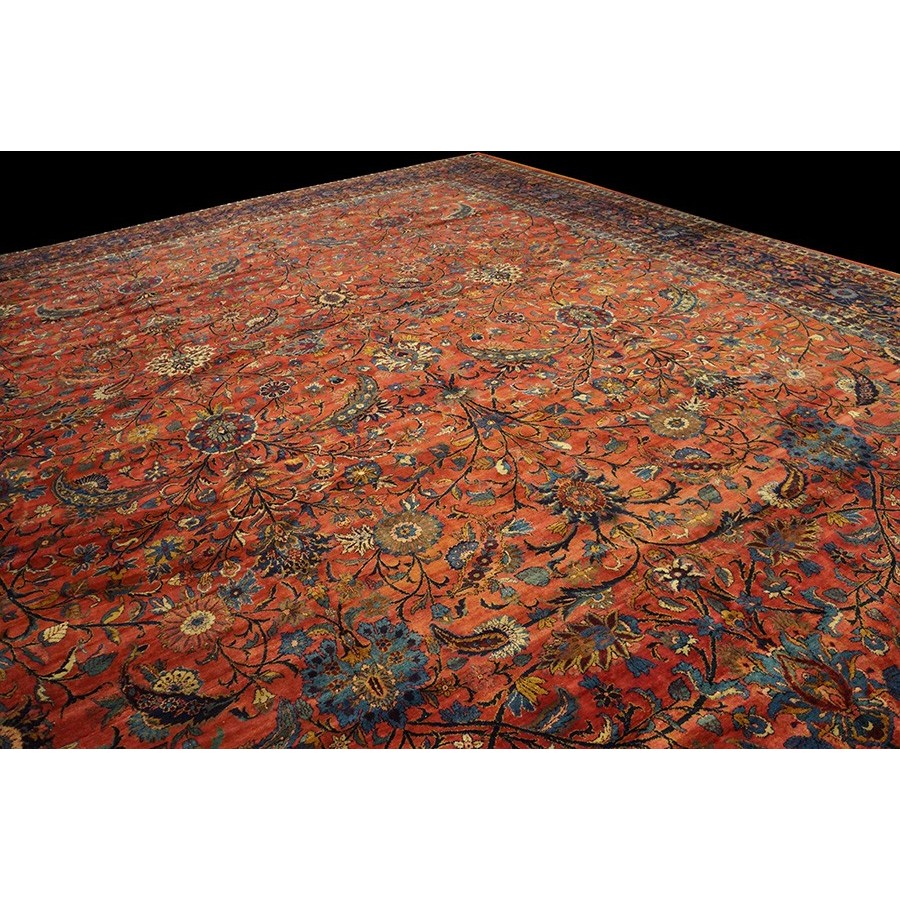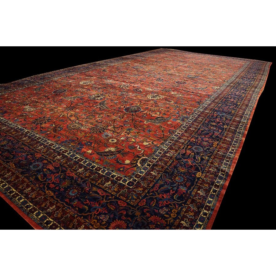 The colour scheme of this giant rug is rich and complex, with a wine red field and royal blue major border. Allover designs were a Kerman specialty and no other area can match the complexity and innovation in the best rugs from this southeastern Persian city. Lancet leaves, various styles of palmettes and untold minor devices ornament the field and inspire the borders. This enormous carpet was clearly a commissioned order rasther than woven for a dealer’s stock. It is in excellent condition with a fine, regular weave.