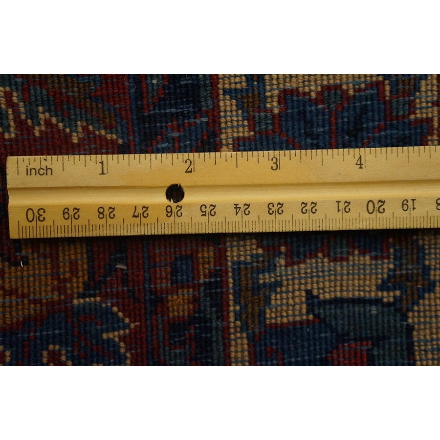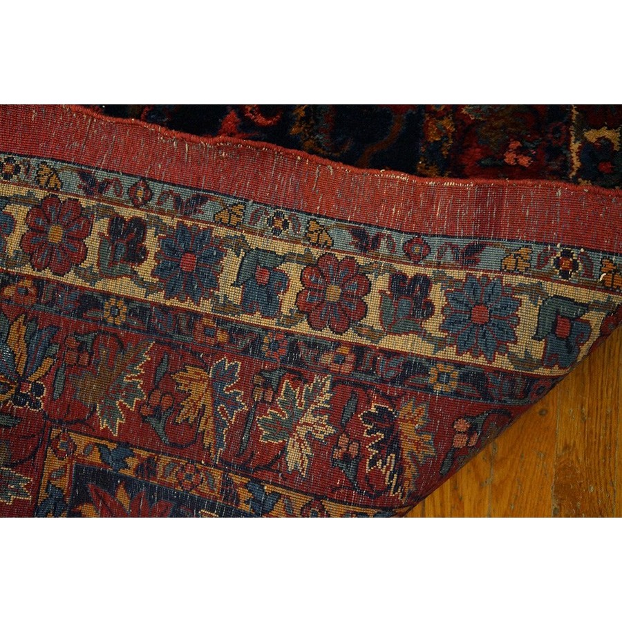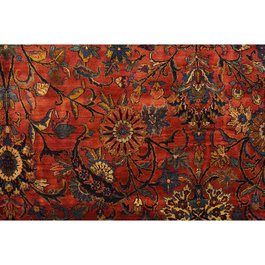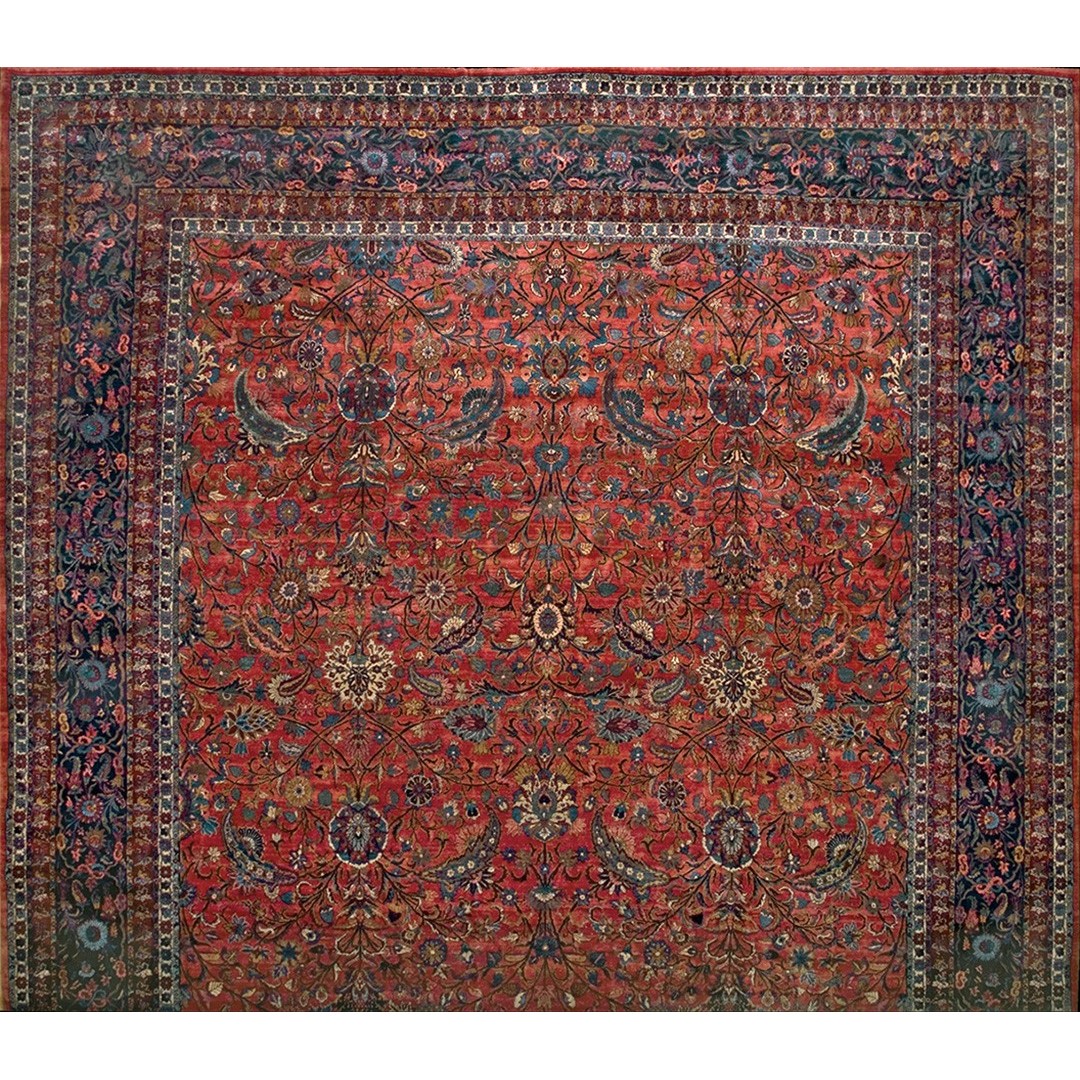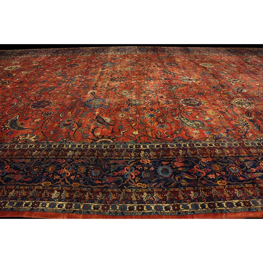 The colour scheme of this giant rug is rich and complex, with a wine red field and royal blue major border. Allover designs were a Kerman specialty and no other area can match the complexity and innovation in the best rugs from this southeastern Persian city. Lancet leaves, various styles of palmettes and untold minor devices ornament the field and inspire the borders. This enormous carpet was clearly a commissioned order rasther than woven for a dealer’s stock. It is in excellent condition with a fine, regular weave.