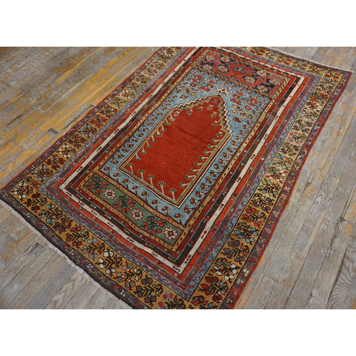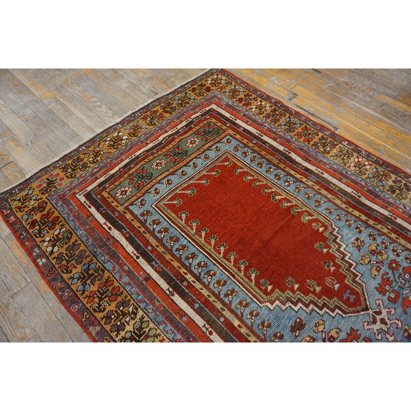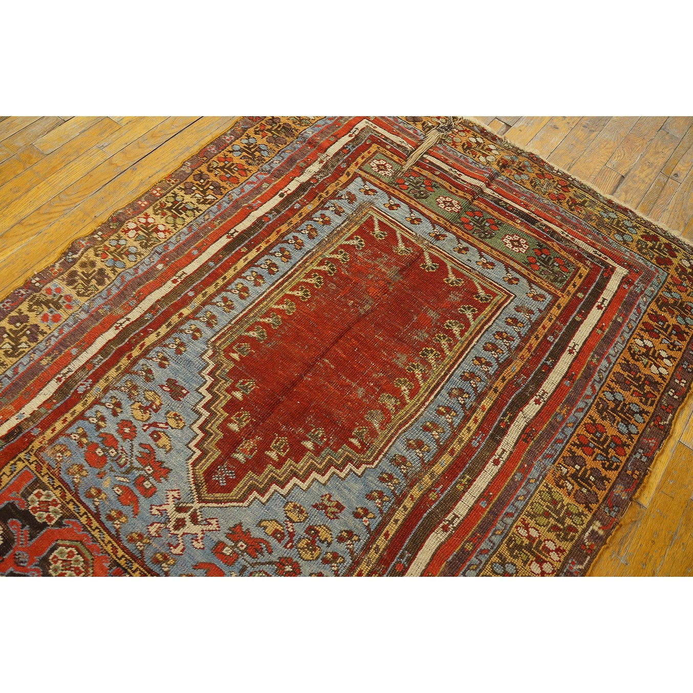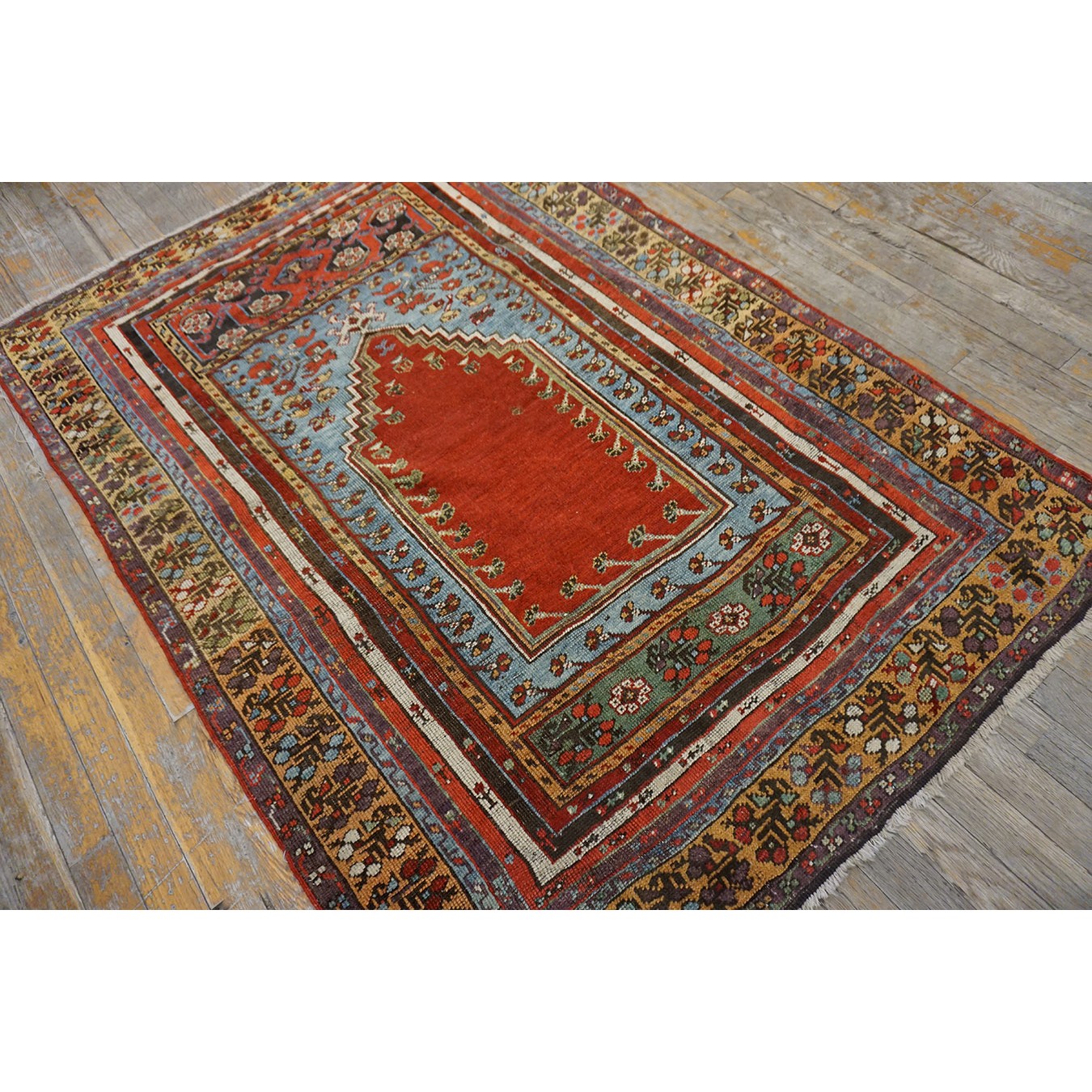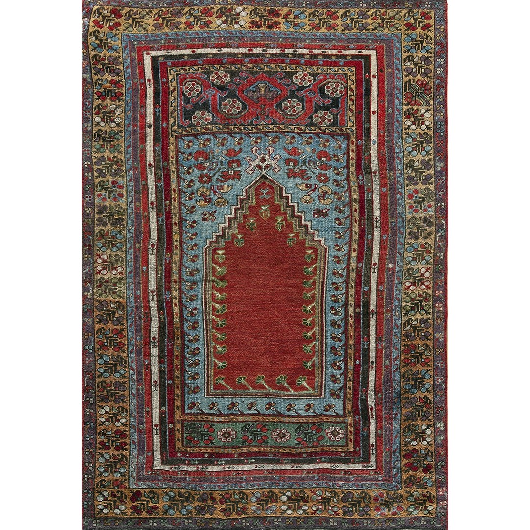Kirshehir prayer rugs from central Anatolia are the most wildly colorful of all the types of classic Turkish (prayer) rugs. In this brilliant full pile example from c. 1860, the light blue is vibrant, the yellow is bright and the tomato red inner mihrab is warm and clear.The cloud band panel at the top of the field is delineated in orange-red and black. Carnations edge the inner edge of the mihrab and bunches of three double flowers repeat in the main border. The striped inner minor borders are a Kirshehir characteristic.