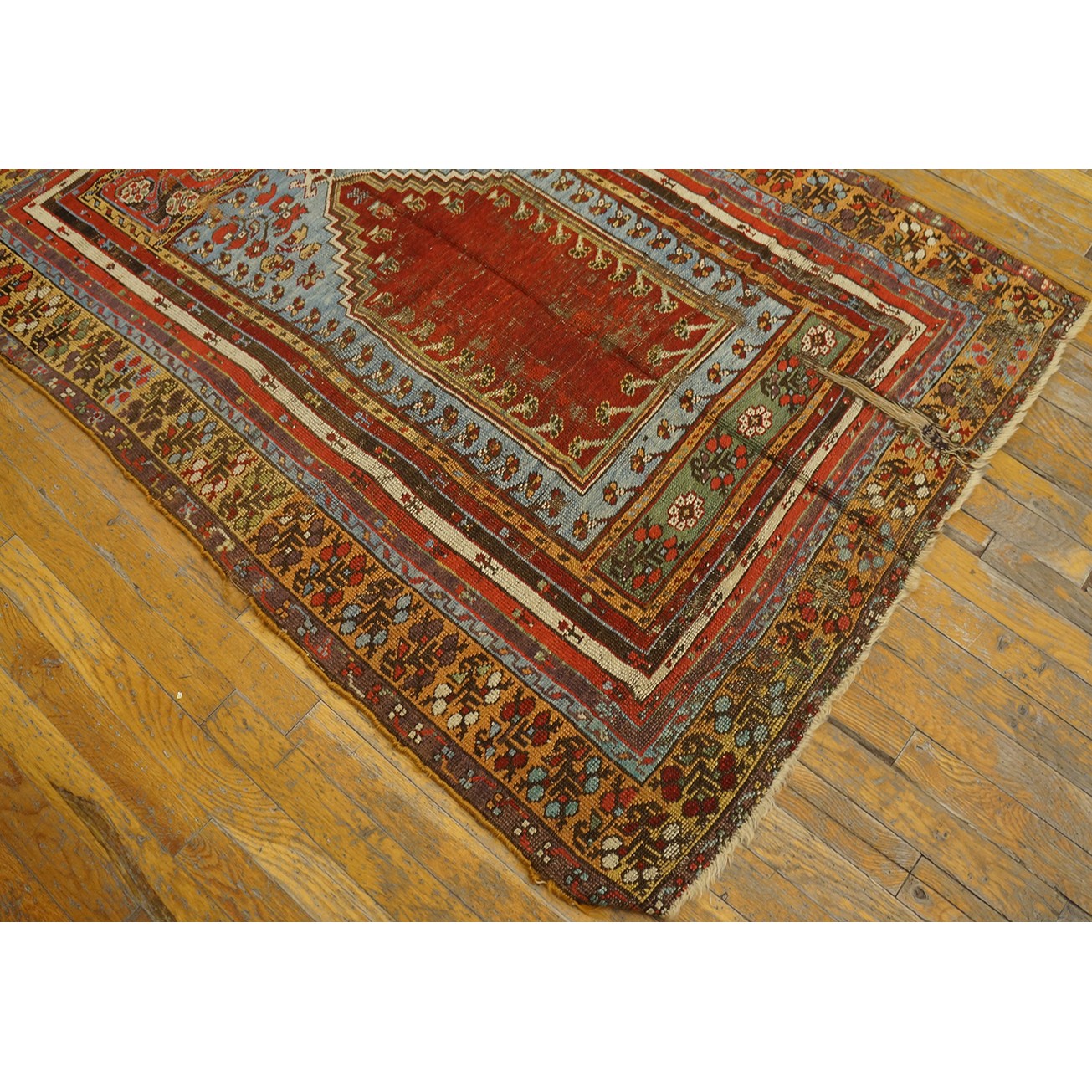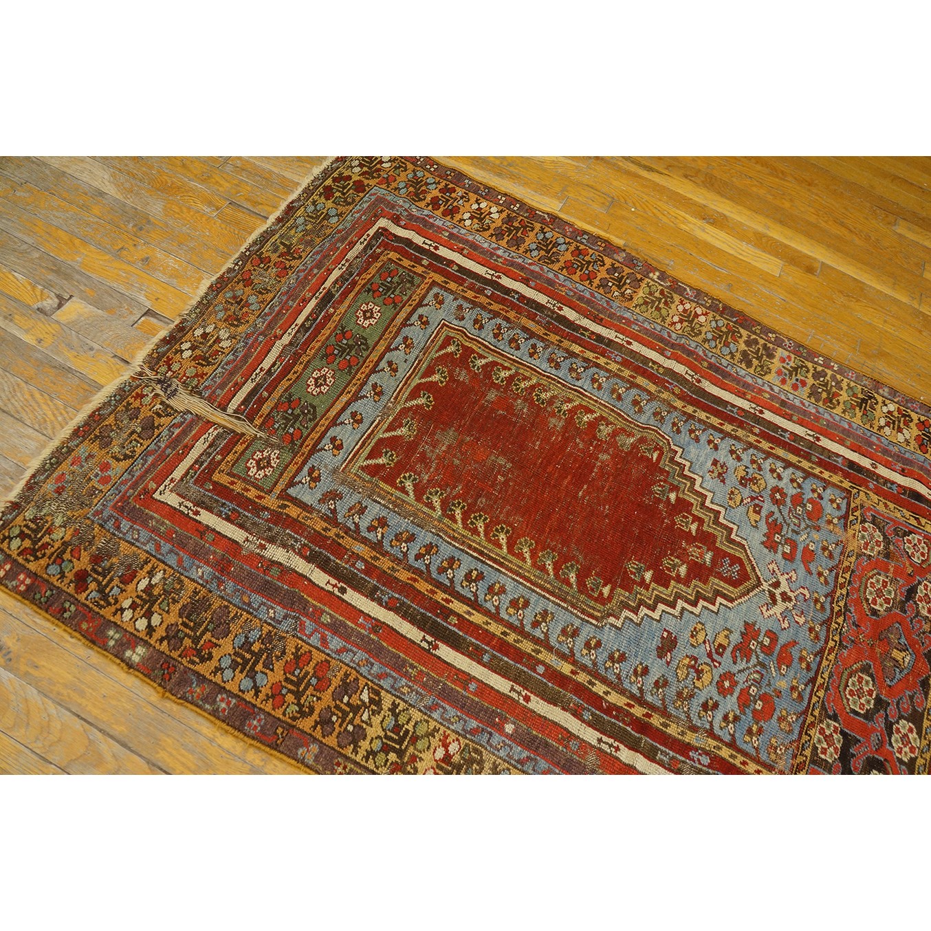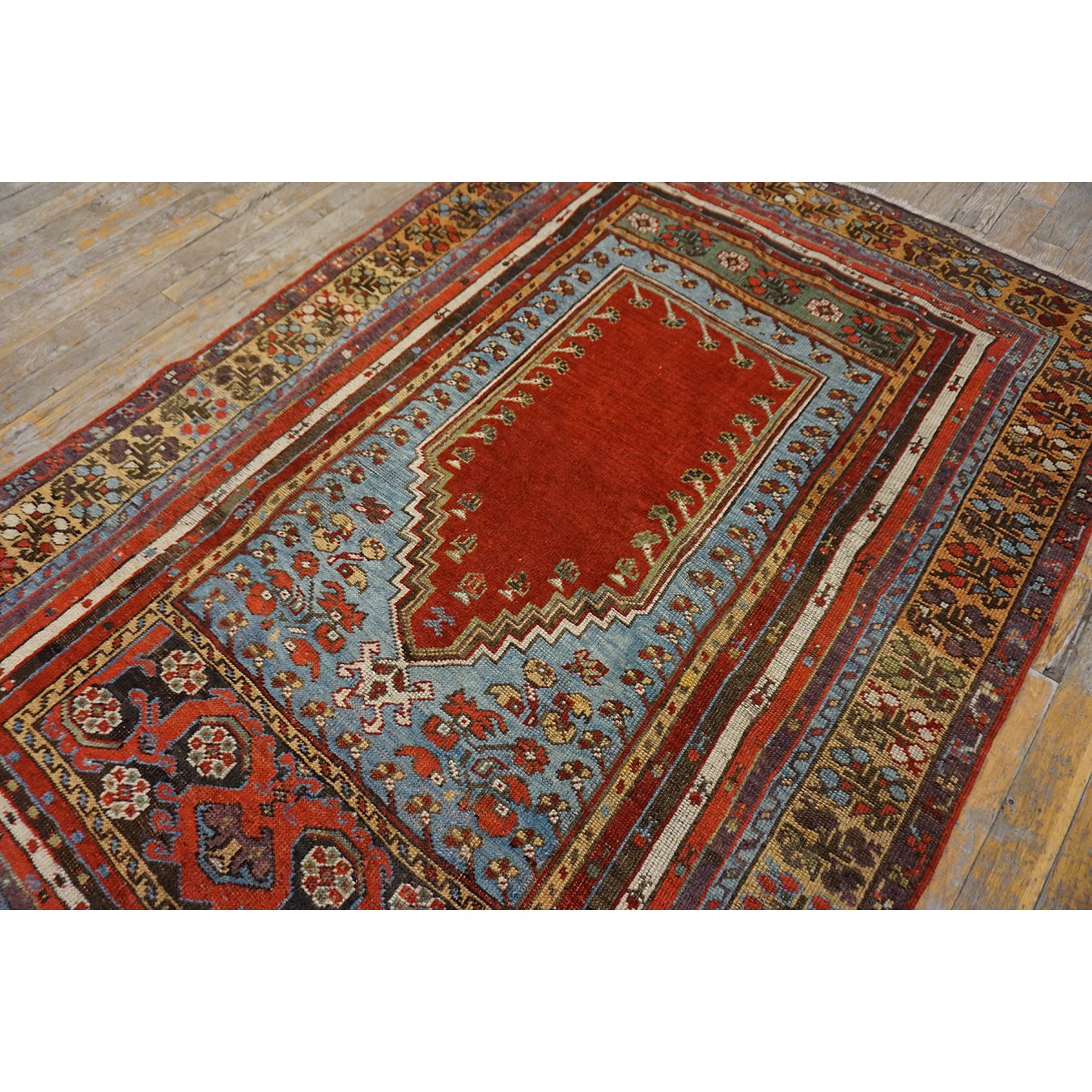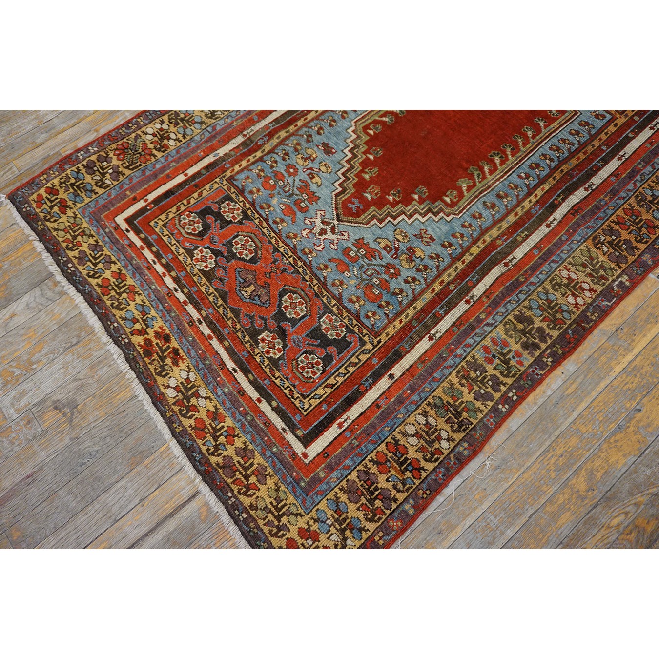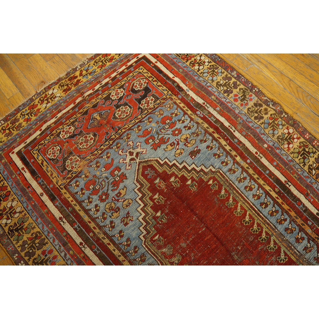 Kirshehir prayer rugs from central Anatolia are the most wildly colorful of all the types of classic Turkish (prayer) rugs. In this brilliant full pile example from c. 1860, the light blue is vibrant, the yellow is bright and the tomato red inner mihrab is warm and clear.The cloud band panel at the top of the field is delineated in orange-red and black. Carnations edge the inner edge of the mihrab and bunches of three double flowers repeat in the main border. The striped inner minor borders are a Kirshehir characteristic.