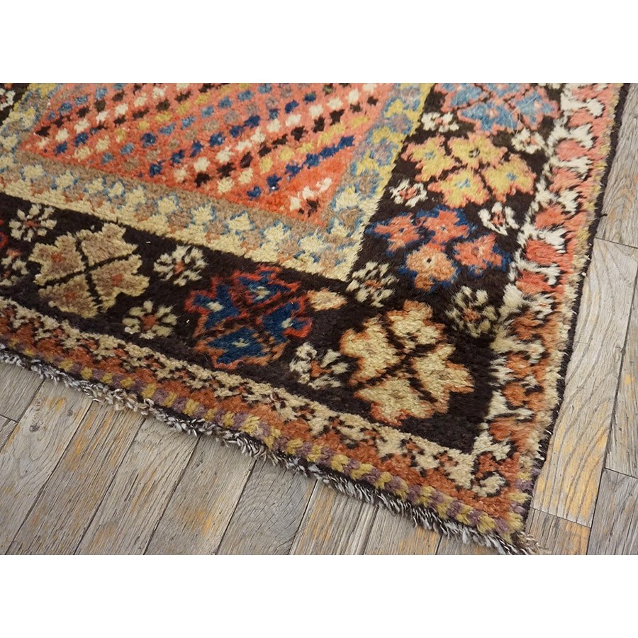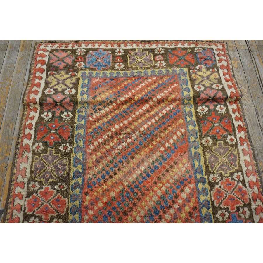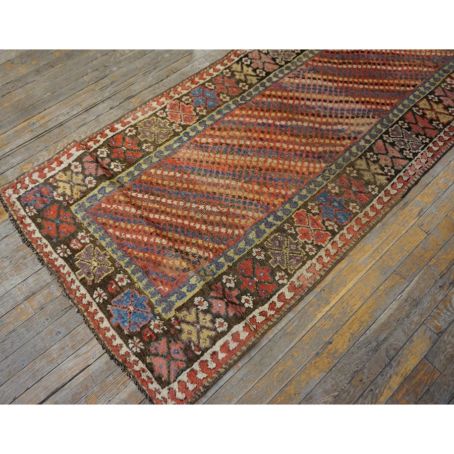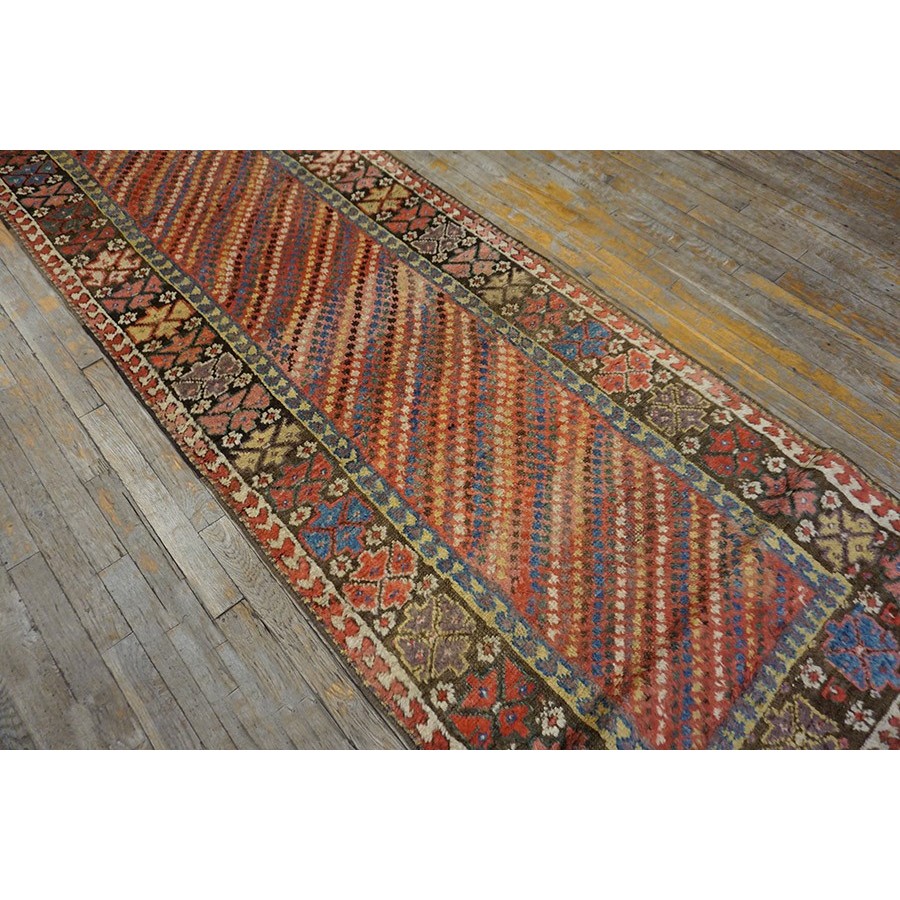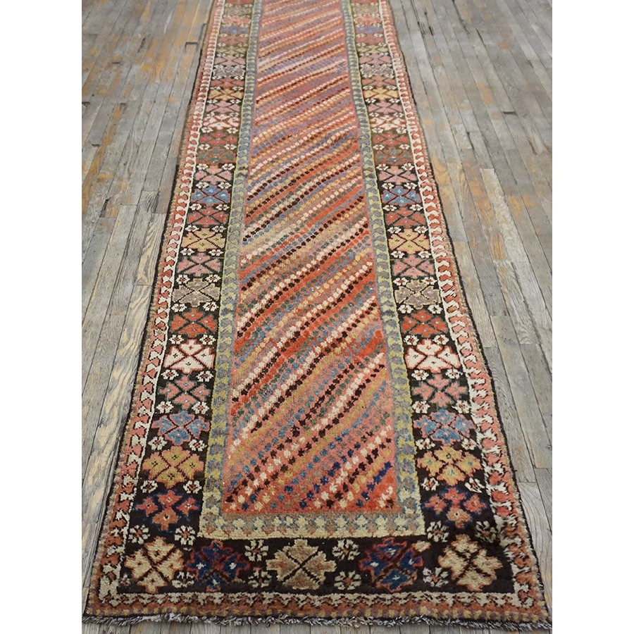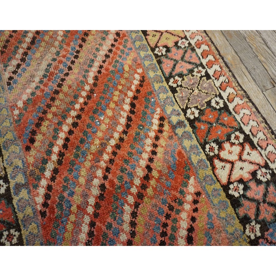 Lots of narrow diagonal stripes with snowflake patterns, lots of colors in the four arrow medallions of the black border. Lots of shaggy pile. In general, lots of fun in this narrow, c.1870 runner from Kurdistan in northwestern Persia.