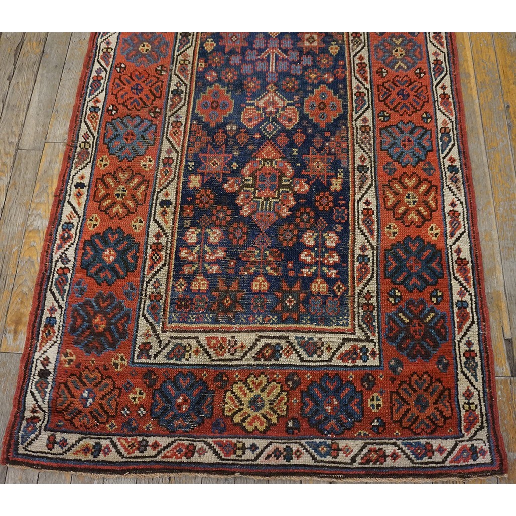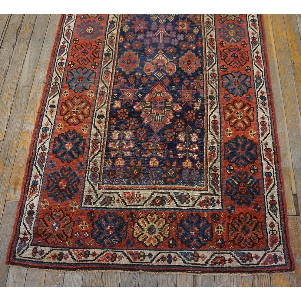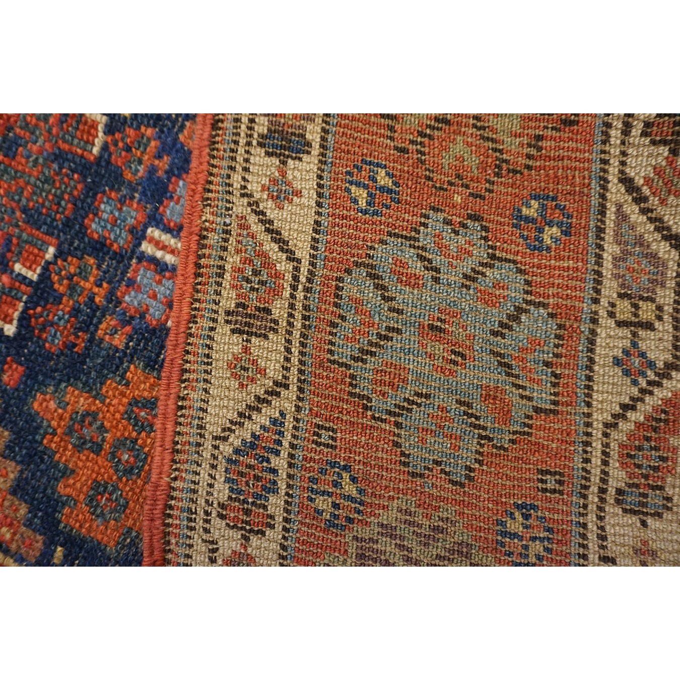 The royal blue ground of this c. 1890 long piece has a mixture of flowering plants, stars, palmettes and other geometric devices, in alluring green, rose light blue and gold. The red main border is adapted from south #Caucasian weaving,but is less formal and more irregular. Natural camel hair appears in a few ornaments in this bright Kurdish narrow runner.