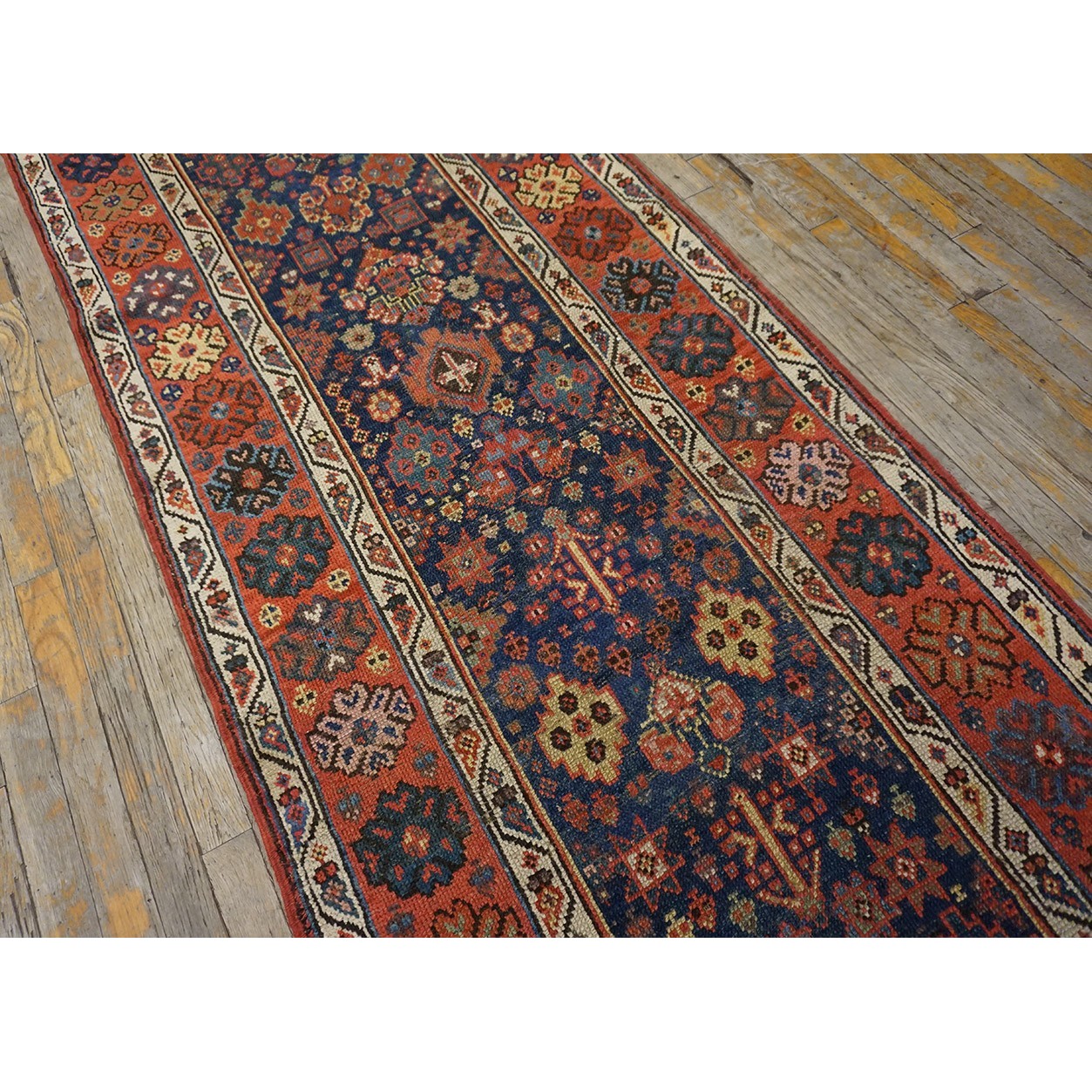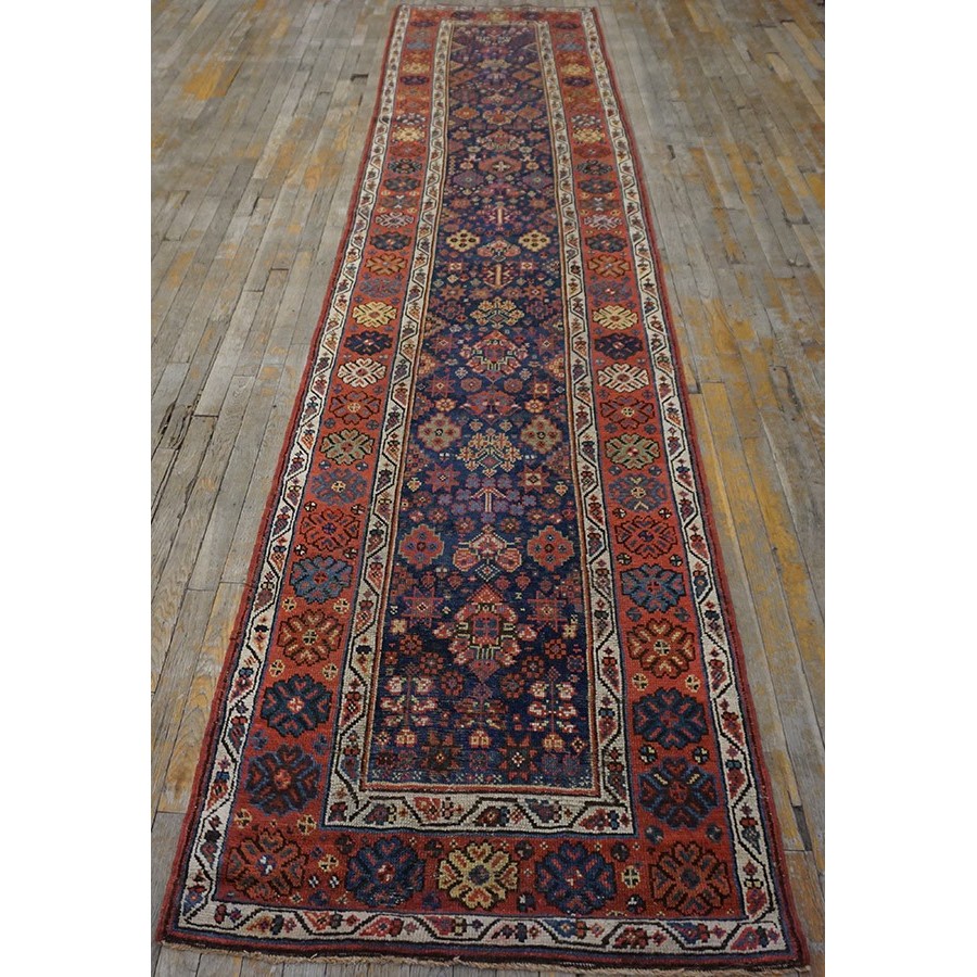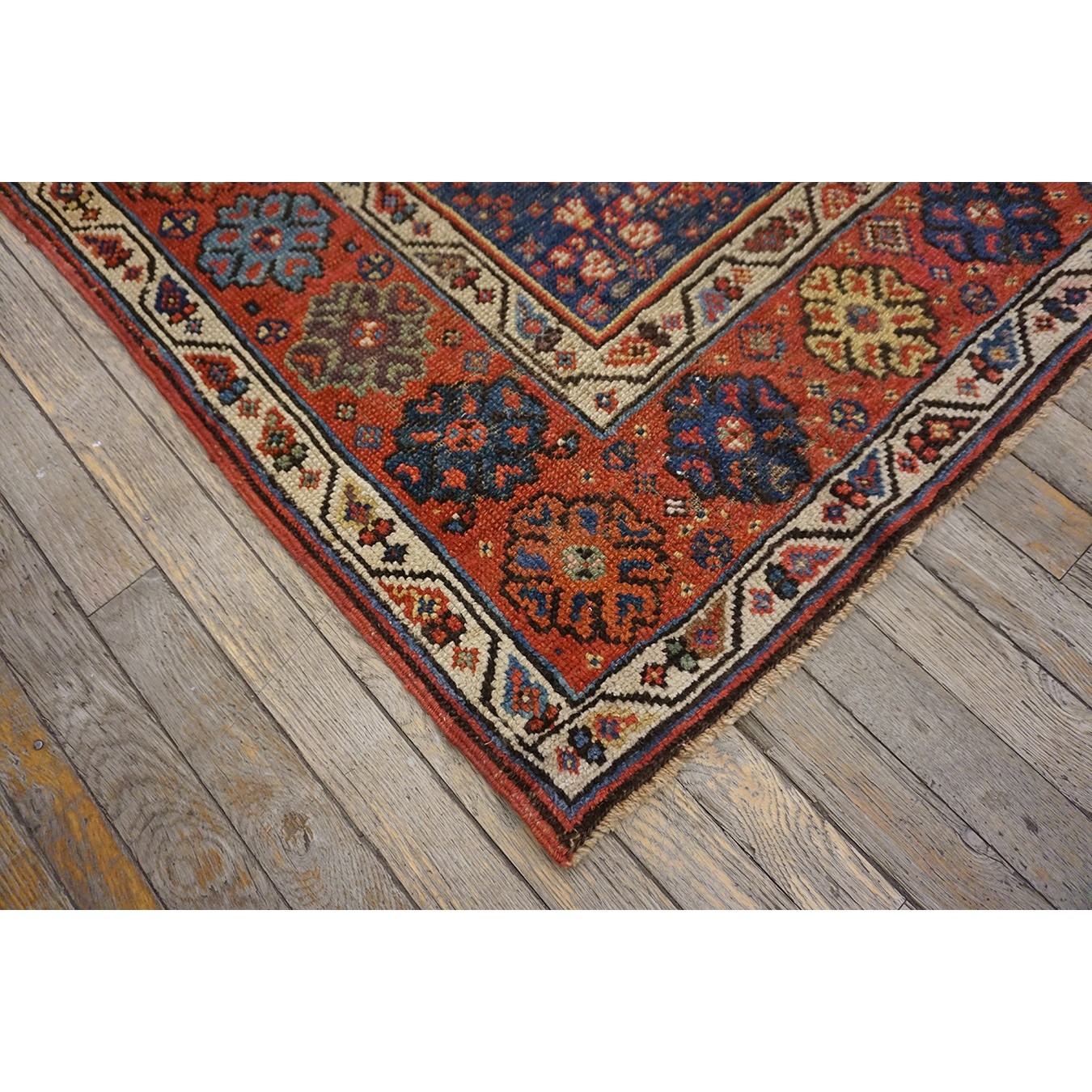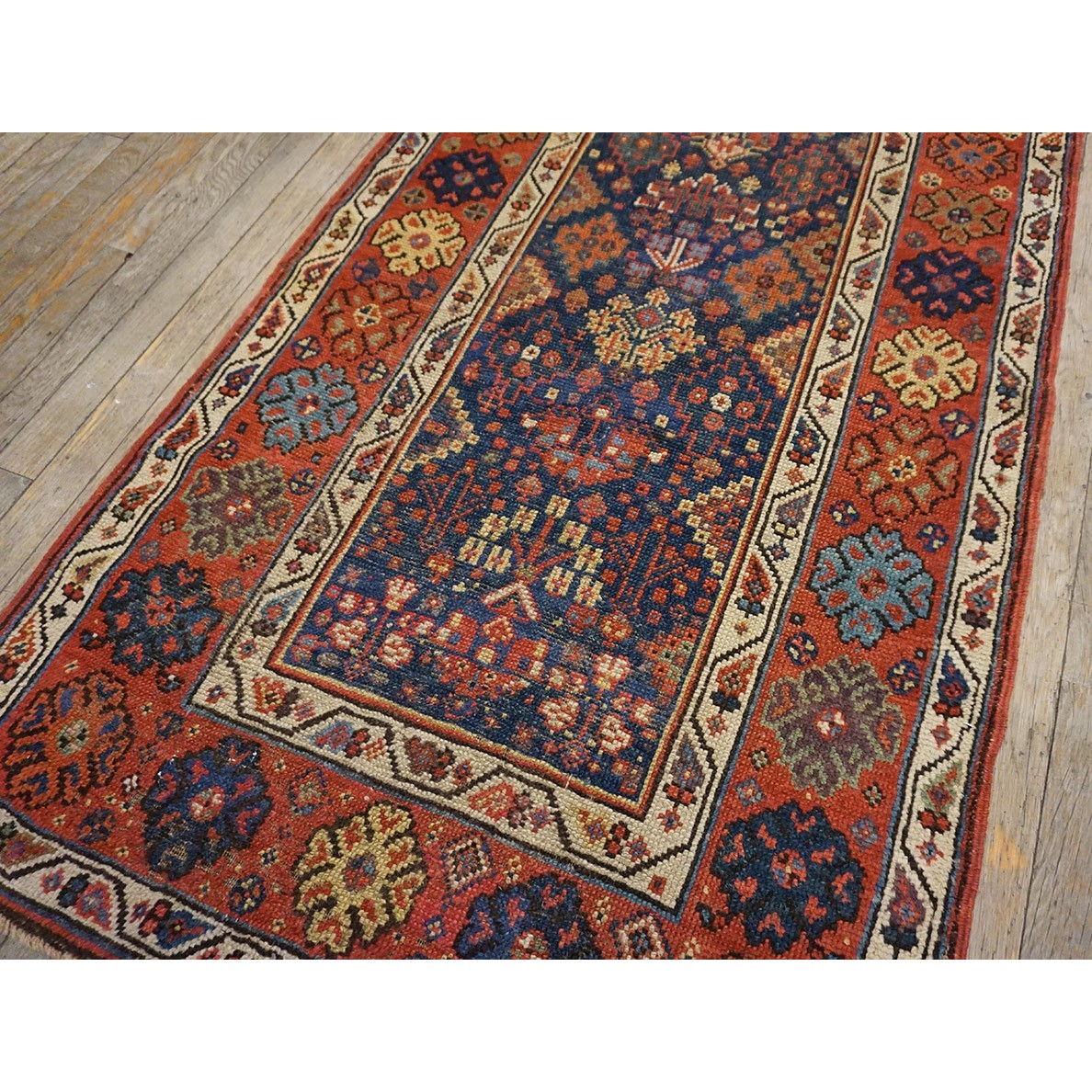 The royal blue ground of this c. 1890 long piece has a mixture of flowering plants, stars, palmettes and other geometric devices, in alluring green, rose light blue and gold. The red main border is adapted from south #Caucasian weaving,but is less formal and more irregular. Natural camel hair appears in a few ornaments in this bright Kurdish narrow runner.