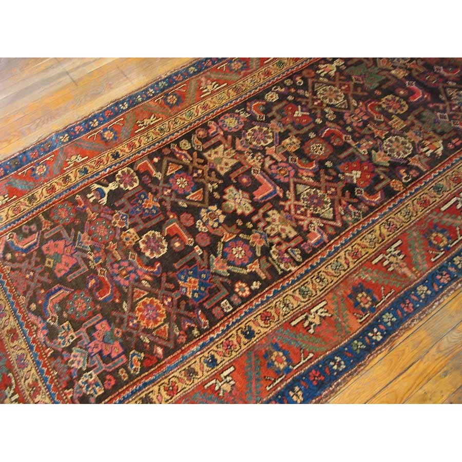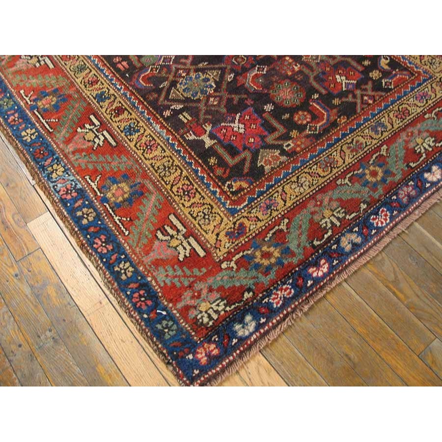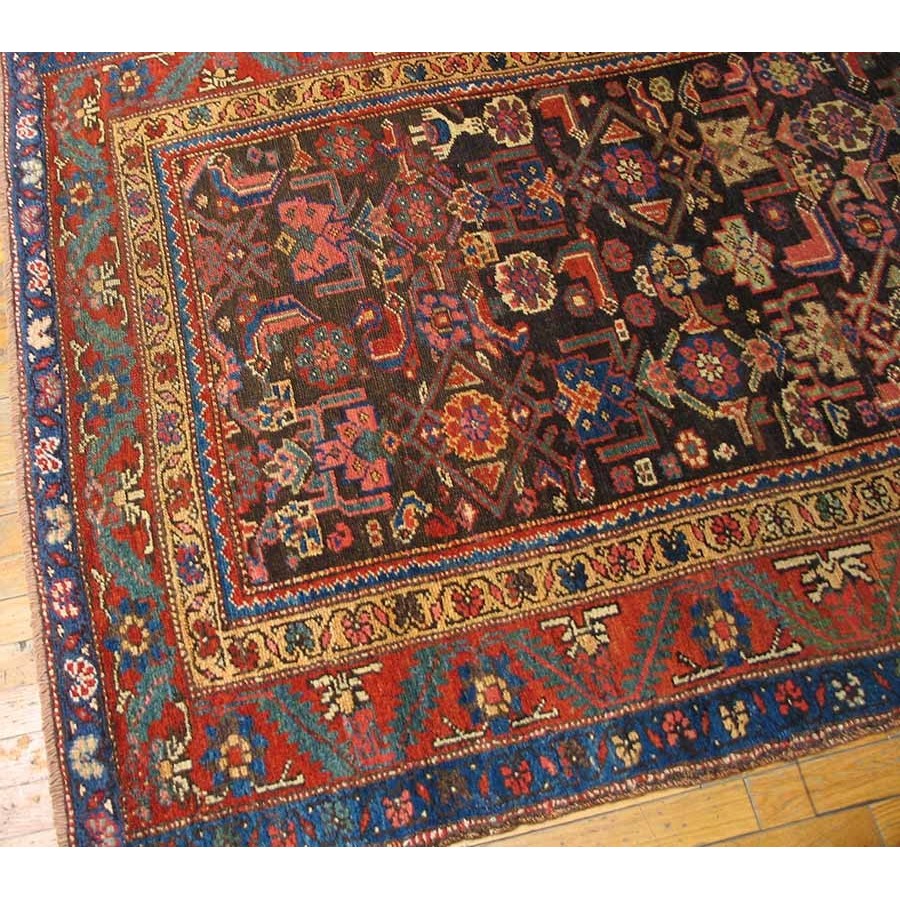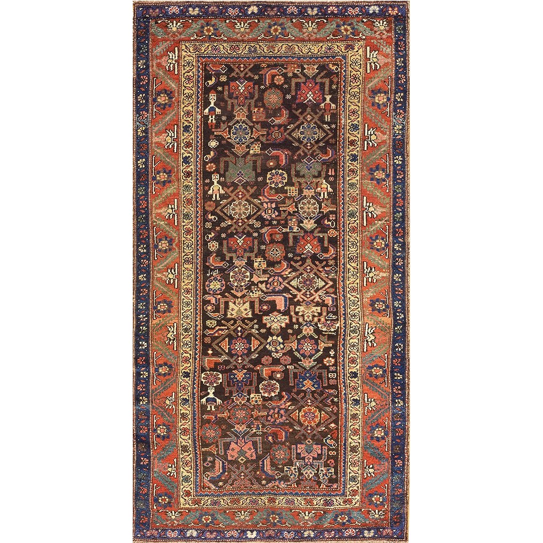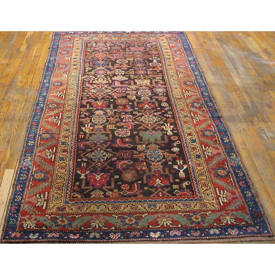Five amusing human figures are scattered within the rosettes and lancet leavers of the informally rendered herati design on the brown-black ground, A red bracketed rosette main border frames the whole. Human figures, often the weavers and their families, are a charming feature of such Kurdish village carpets as this c. 1880 example.