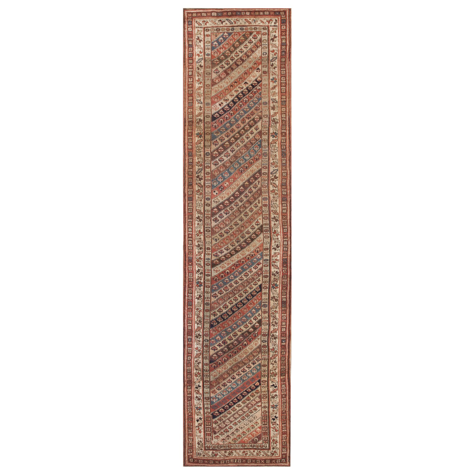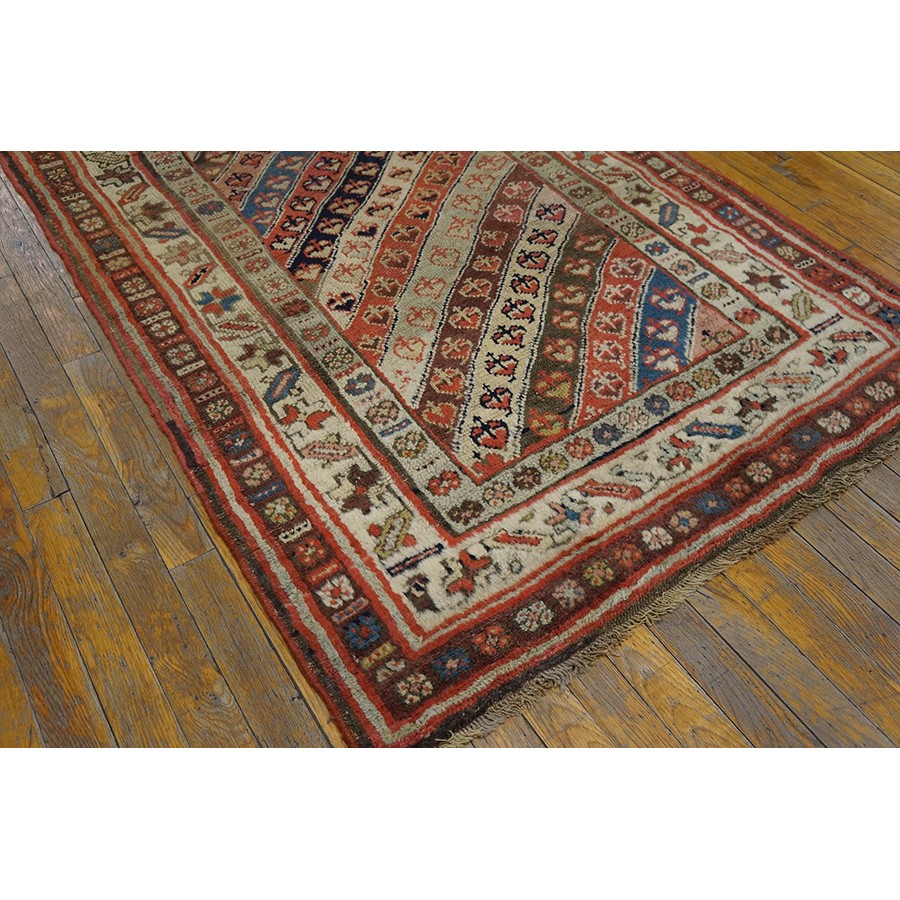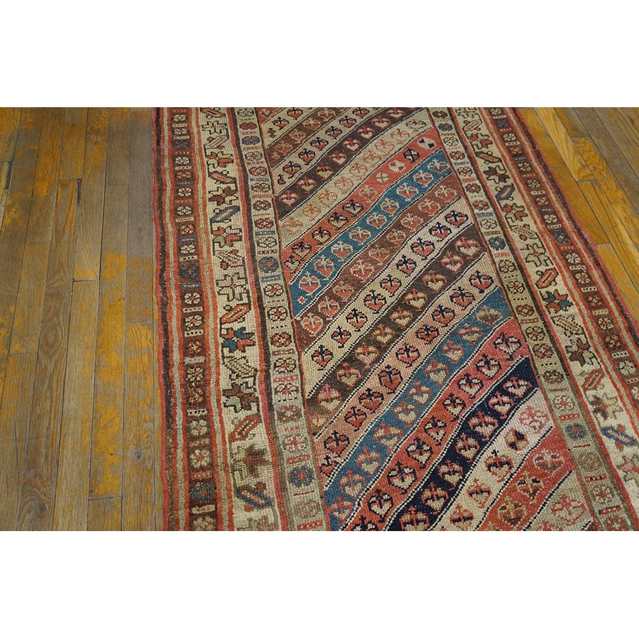 The diagonal stripe pattern, with little flowers in each band, has been borrowed from the Caucasus, as has the ivory star and diagonal bar border, although a typically informal Kurdish flair has been added. The colors are slightly muted, but the wide palette includes medium and dark blue, apricot, soft yellow, light brown and rose in this c. 1890 Kurdish runner.