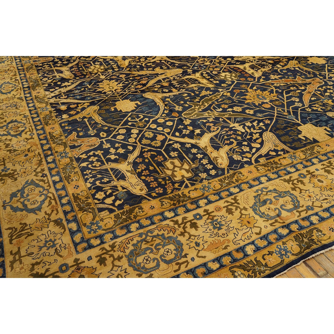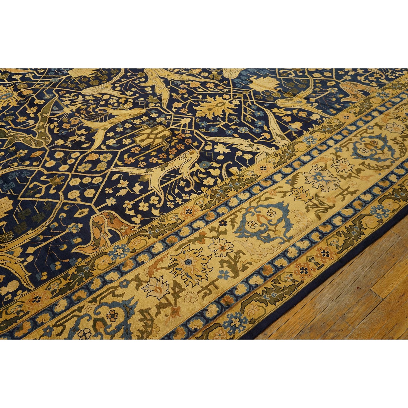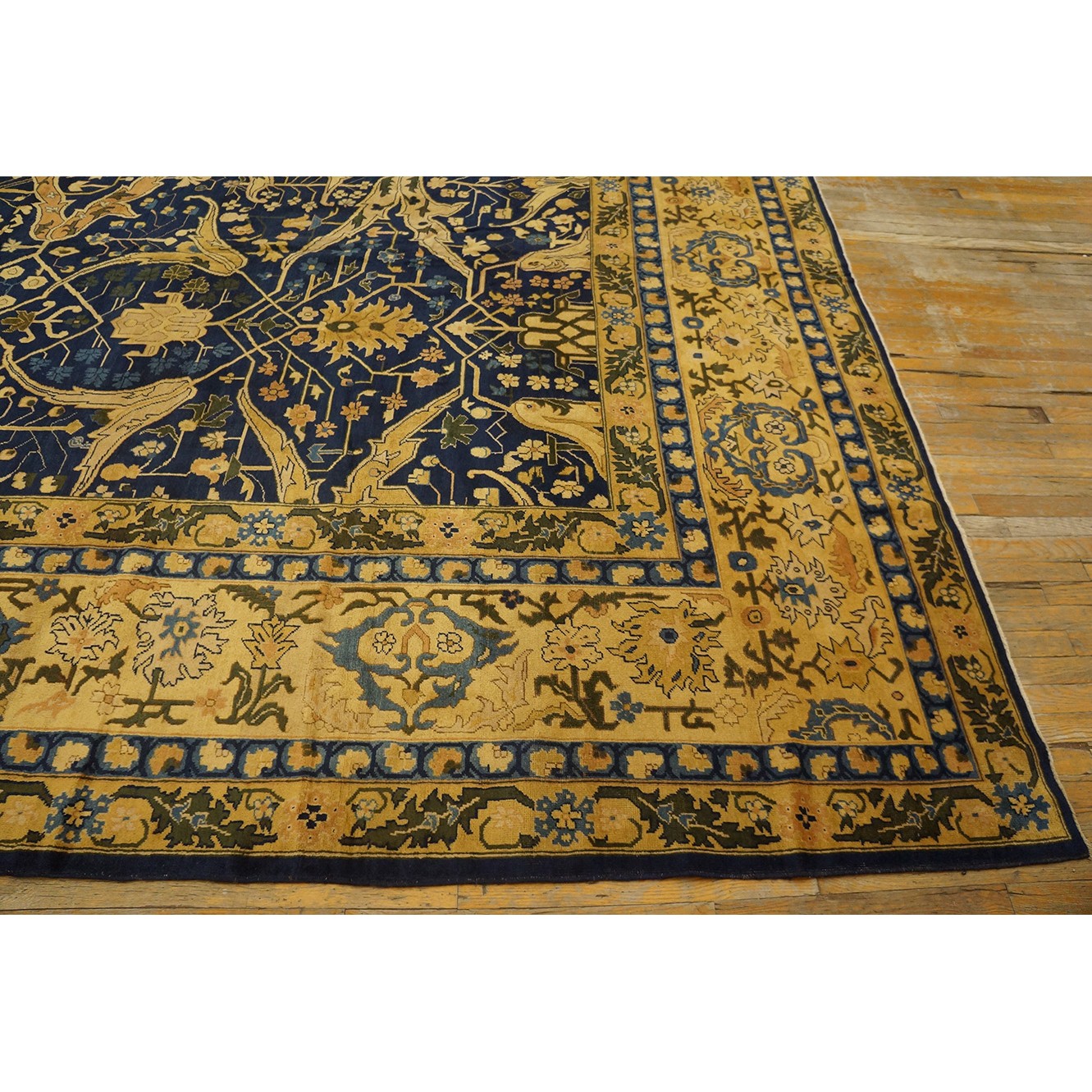 Indian weavers are adept at interpreting any existing design into original formats. Here the split arabesque Garrus Bijar pattern on dark blue has been precisely expanded into a large, square format carpet. An ivory border of colourful open palmettes makes a consistent frame. The general tonality is slightly more mellow than the original, but the format is never found in Bijar carpets. The weave is close and the pile is compact.