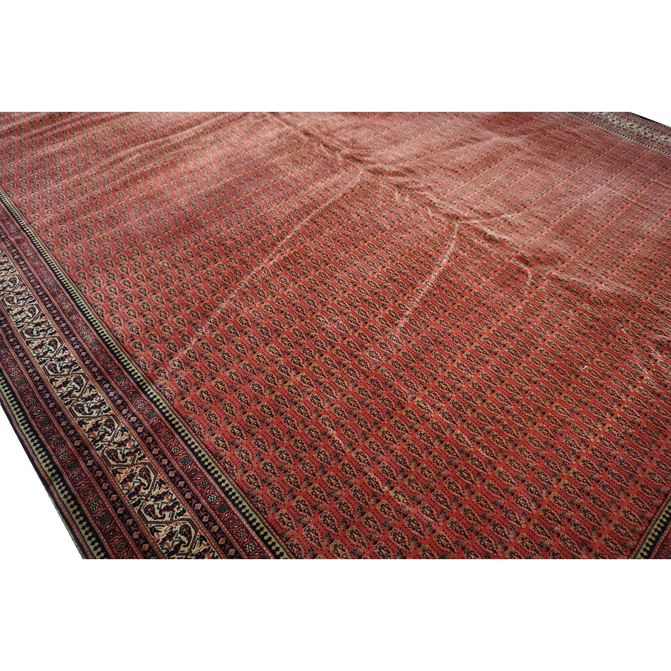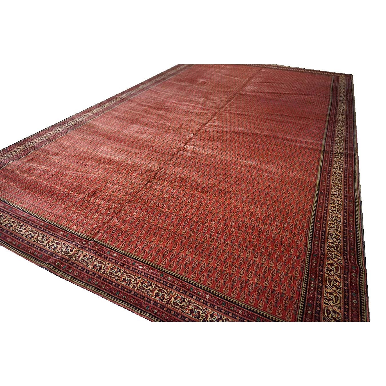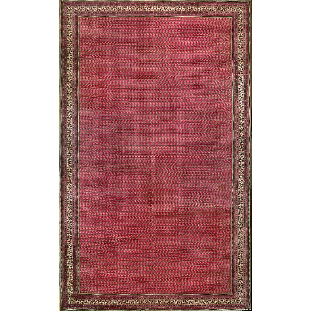 Billions of botehs densely fill the red field of this evenly woven c. 1920 north Indian carpet. The ivory main border has more botehs sprouting from an undulating vine. The overall concept is closely derived from Persian Saraband carpets, but executed more precisely and on a larger scale. This carpet adds a rich, restrained and unifying element to the appropriate room.