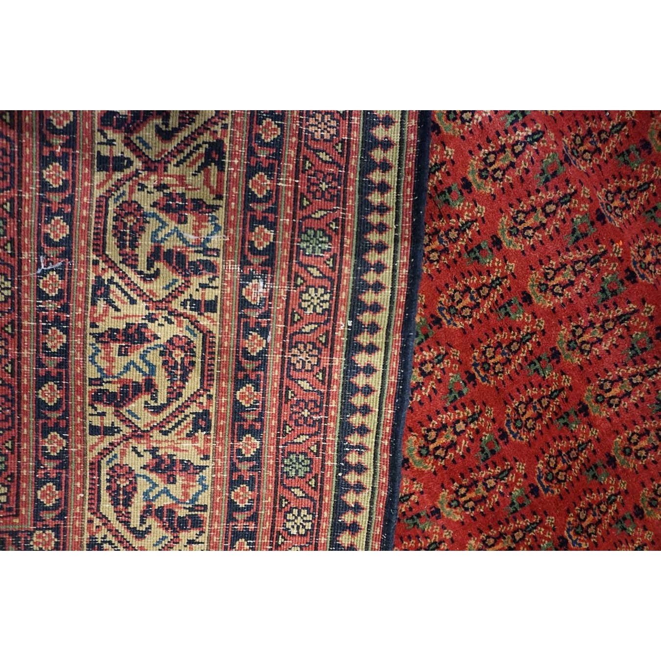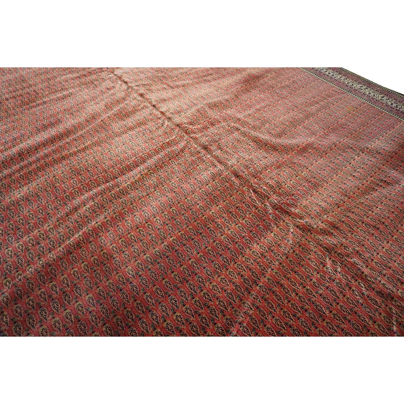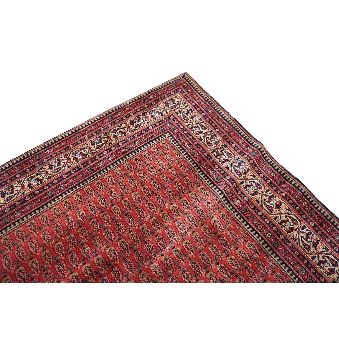 Billions of botehs densely fill the red field of this evenly woven c. 1920 north Indian carpet. The ivory main border has more botehs sprouting from an undulating vine. The overall concept is closely derived from Persian Saraband carpets, but executed more precisely and on a larger scale. This carpet adds a rich, restrained and unifying element to the appropriate room.