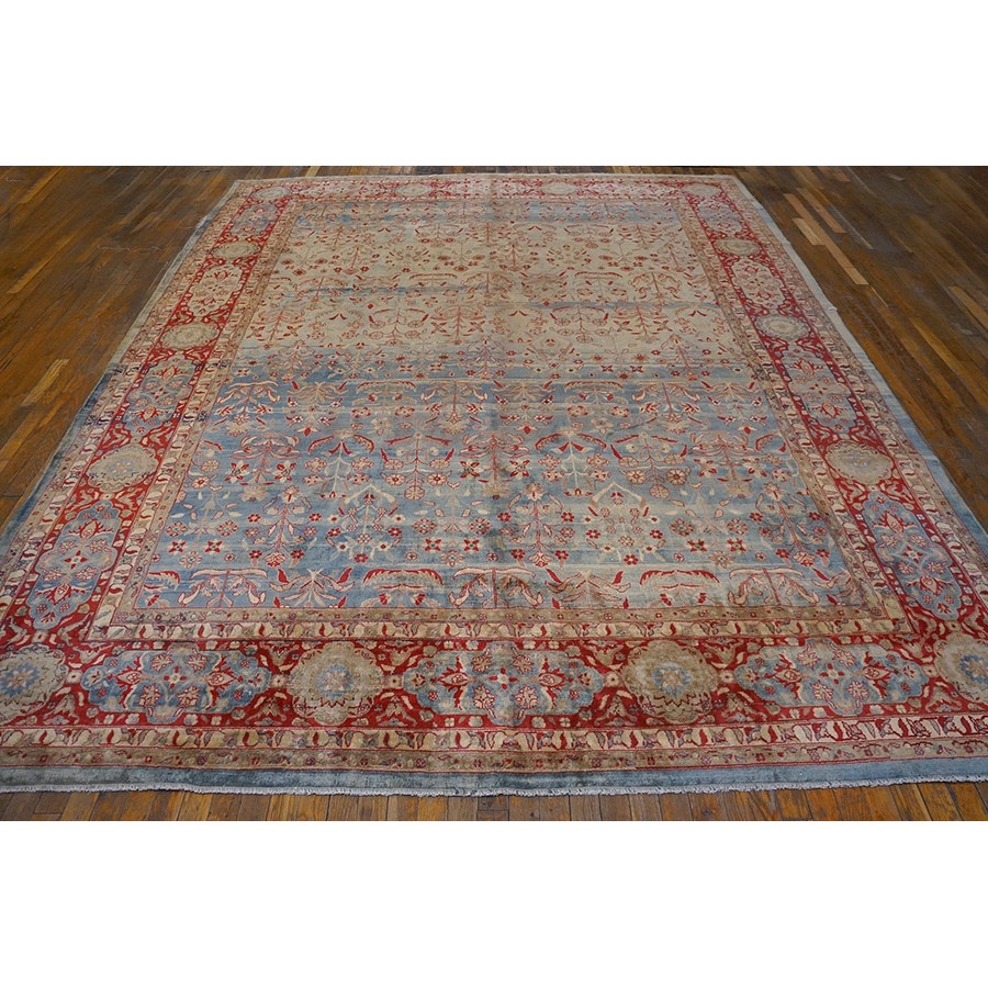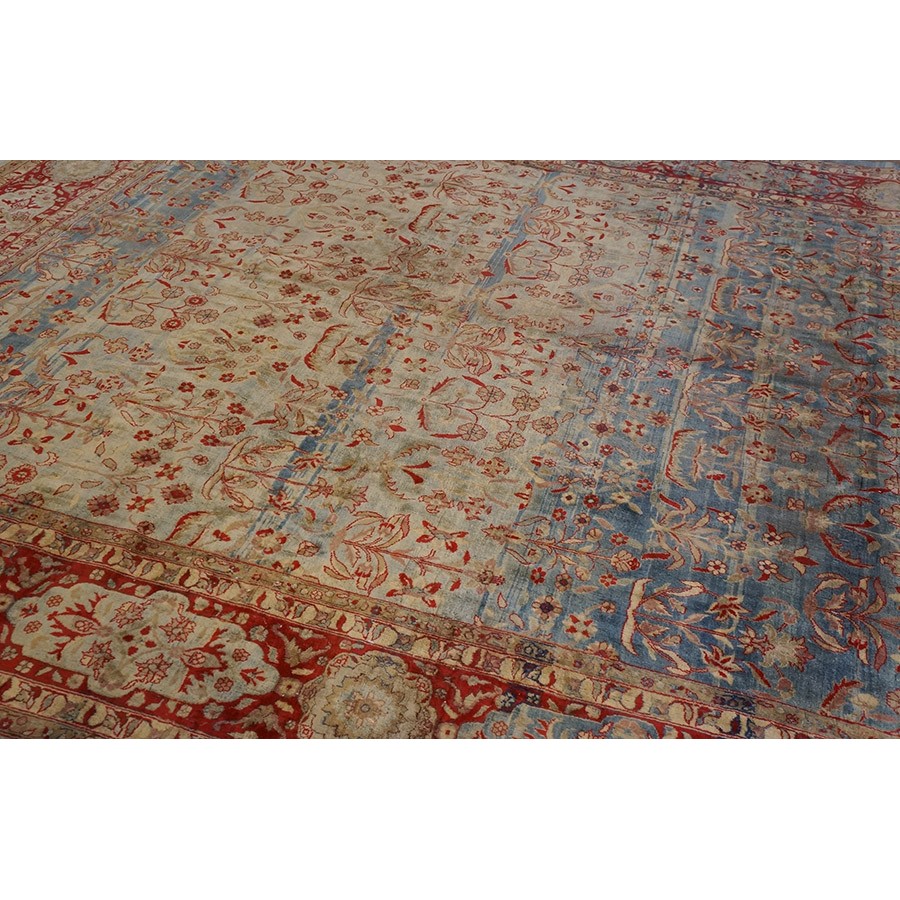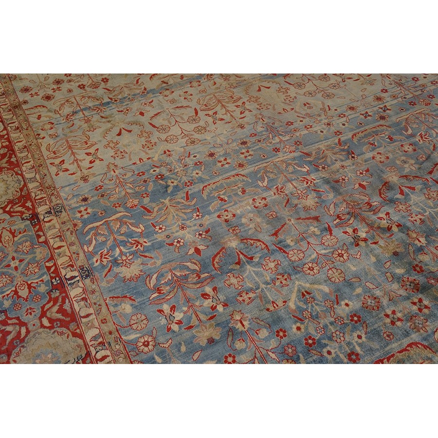 The field gently cloud-abrashes to pale blue from a powder-beige tonality, and it displays a unidirectional close and detached full flower pattern in basically offset rows. Classic cartouche and rosette red main border with abrashed light blue accents, and tonally en suite plain outermost stripe. Antique carpet, good condition.