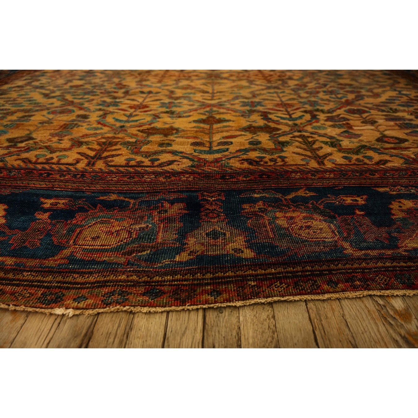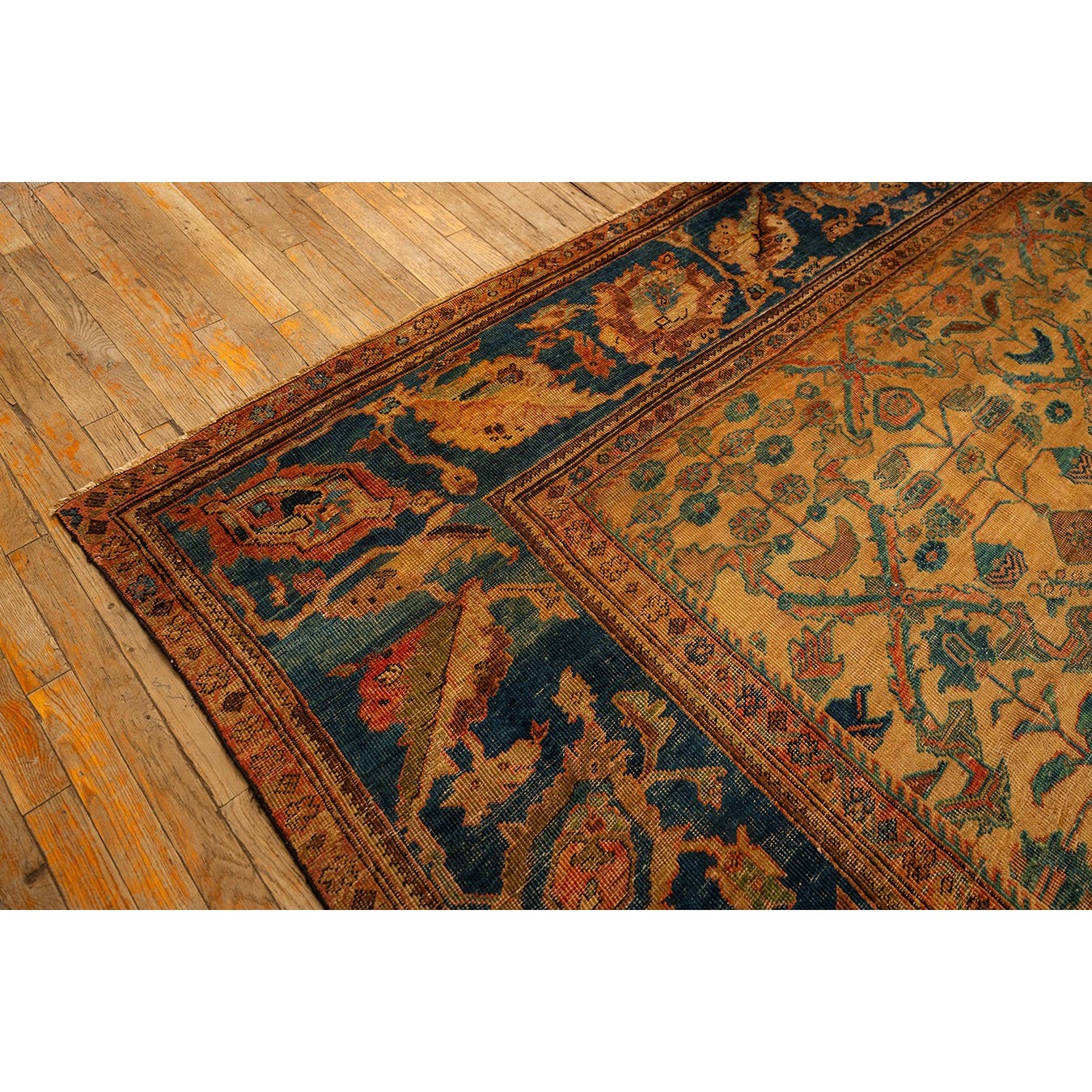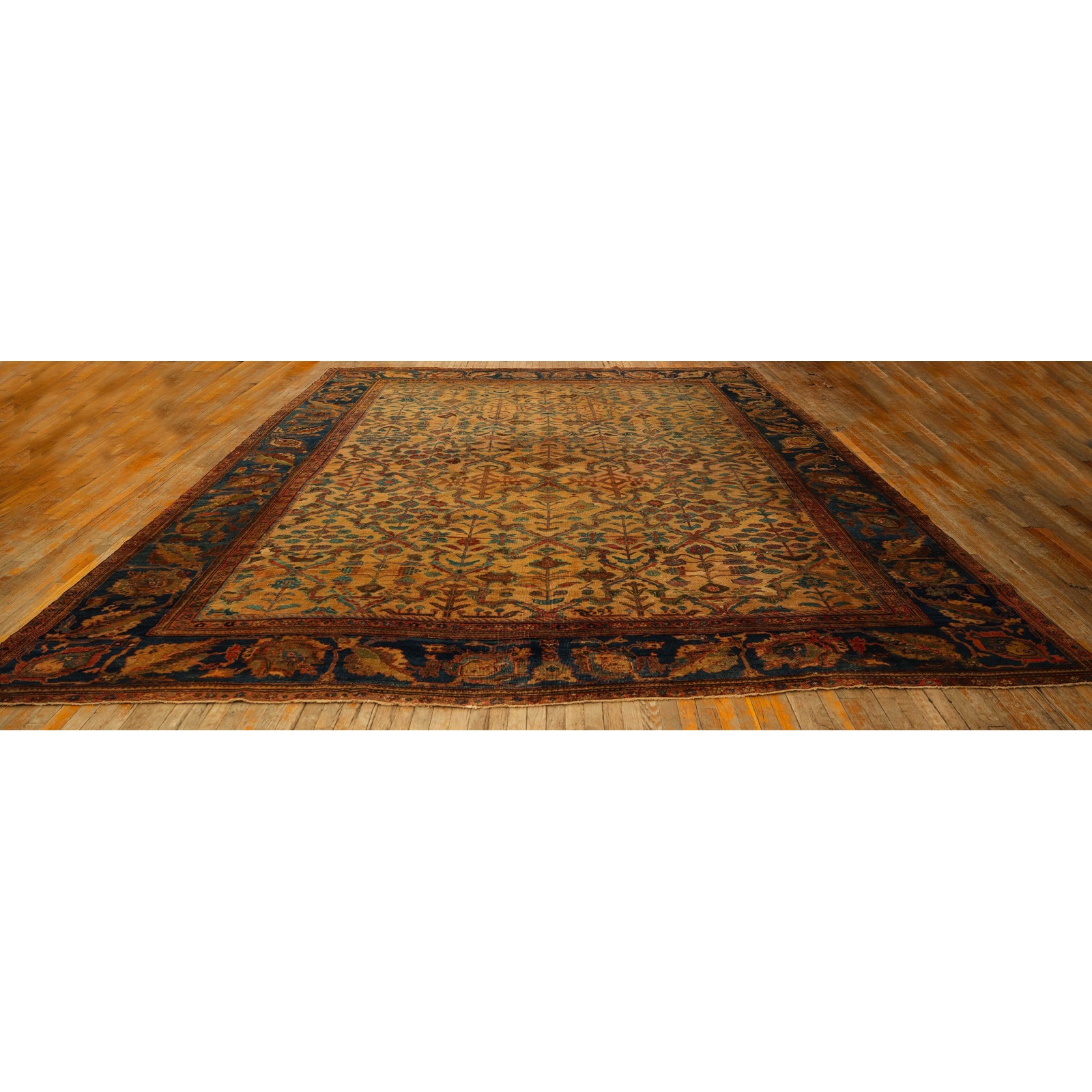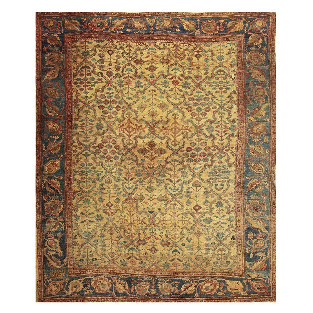 DescriptionMahalPrecisely, this is the intermediate grade of carpet between Sarouks and Mushkabads from the Ferahan plain area. Arak Province, western Persia. Woven in large quantities in room sizes, the patterns tend to be overall repeats in traditional and innovative styles. Those pieces with slightly softer colors and bigger, bolder patterns are often called Ziegler Mahals. For the late 19th century onwards, production was very substantial, thousands of carpets per year, and prices for most pieces are moderate. The usual jewel tones predominate unless the piece has been exposed to light and washing, or to an initial chemical treatment. Mahals are popular everywhere and the overall patterns make them excellent for dining rooms. | |