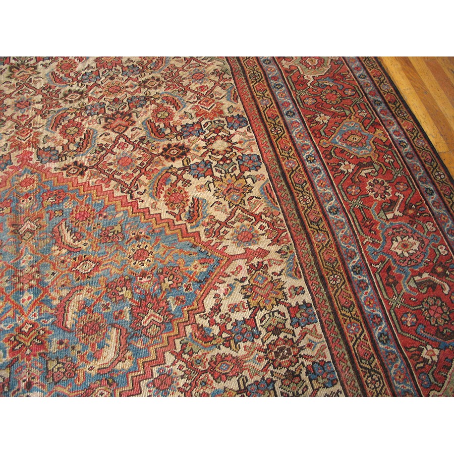 DescriptionMahalPrecisely, this is the intermediate grade of carpet between Sarouks and Mushkabads from the Ferahan plain area. Arak Province, western Persia. Woven in large quantities in room sizes, the patterns tend to be overall repeats in traditional and innovative styles. Those pieces with slightly softer colors and bigger, bolder patterns are often called Ziegler Mahals. For the late 19th century onwards, production was very substantial, thousands of carpets per year, and prices for most pieces are moderate. The usual jewel tones predominate unless the piece has been exposed to light and washing, or to an initial chemical treatment. Mahals are popular everywhere and the overall patterns make them excellent for dining rooms. | |