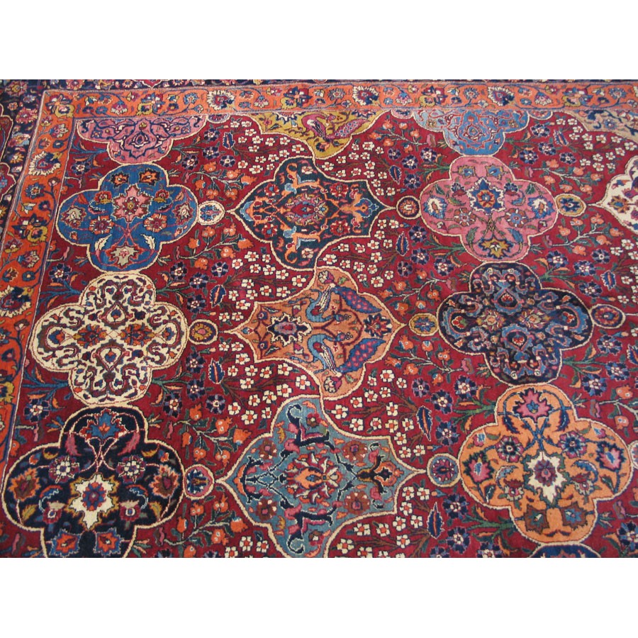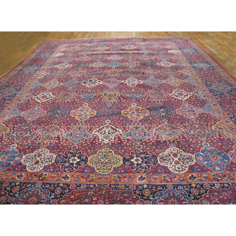 Floral arabesques completely fill the field of this large, perfectly detailed interwar Sabeer Mashed oversize carpet. The navy border is in the 16th century classic style with light blue medallions alternating with red cartouches, in an erxtremely dense pattern. The palette is wide, with a crisp yellow and a turquoise. The condition is top notch and this casrpet will appeal to those who want the best in every respect.