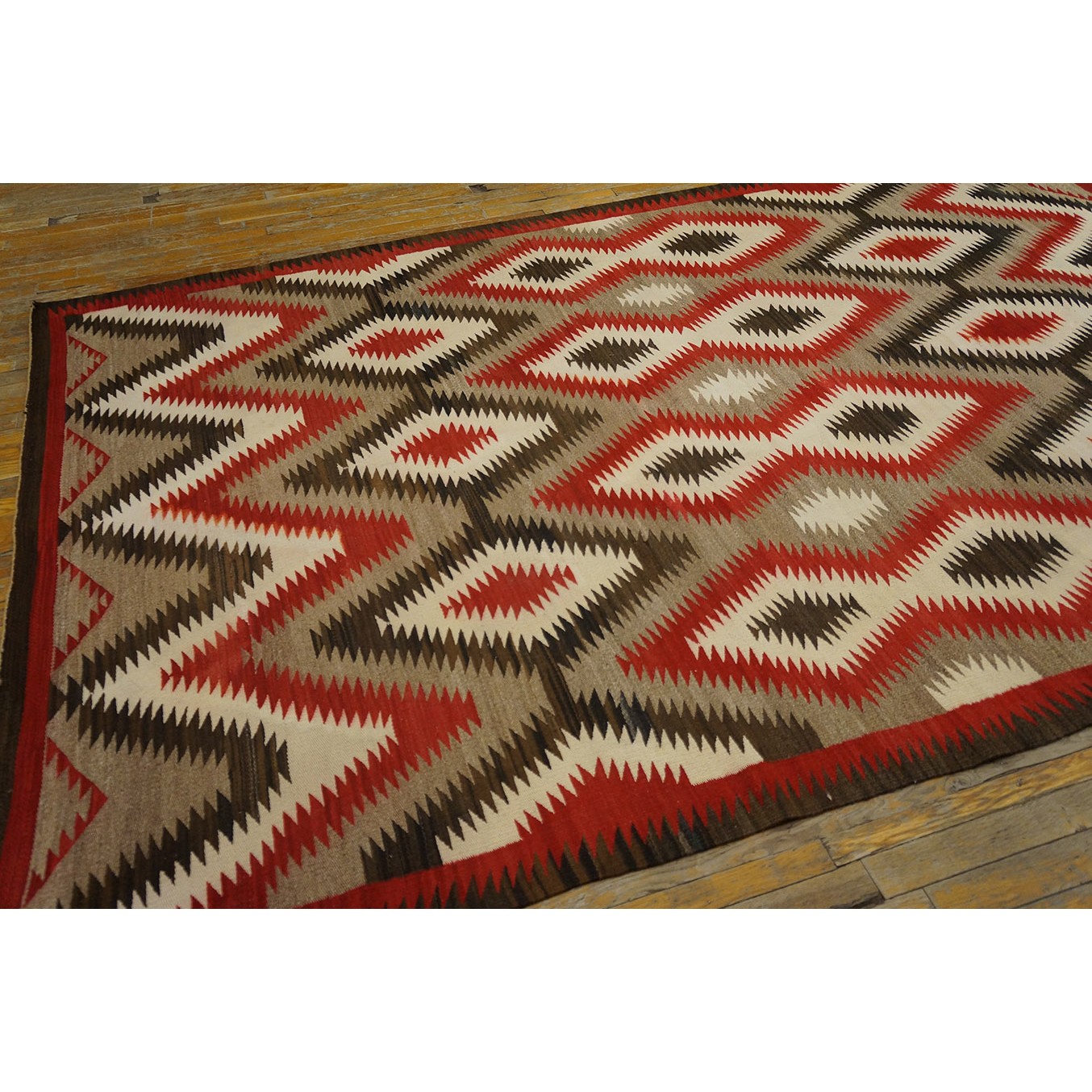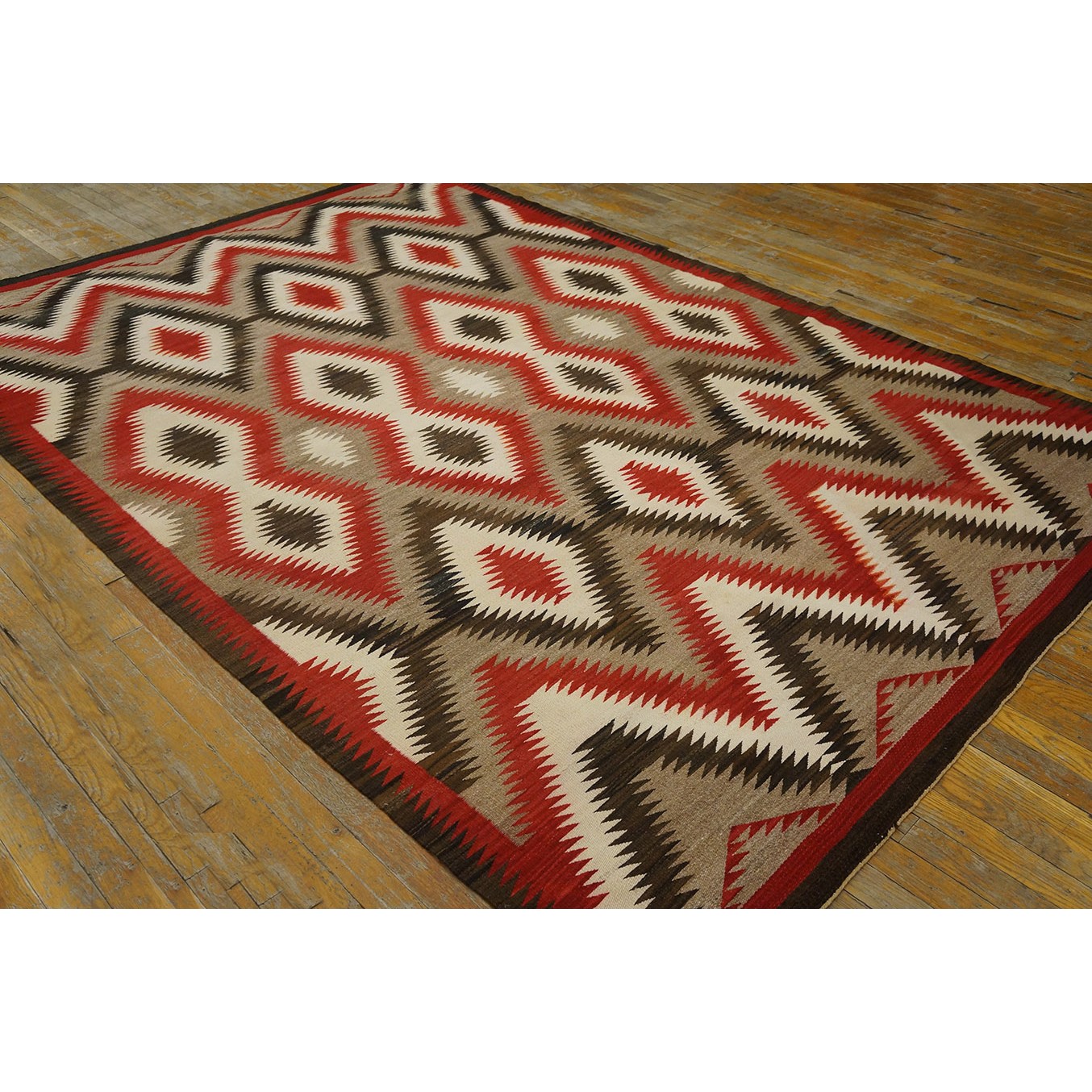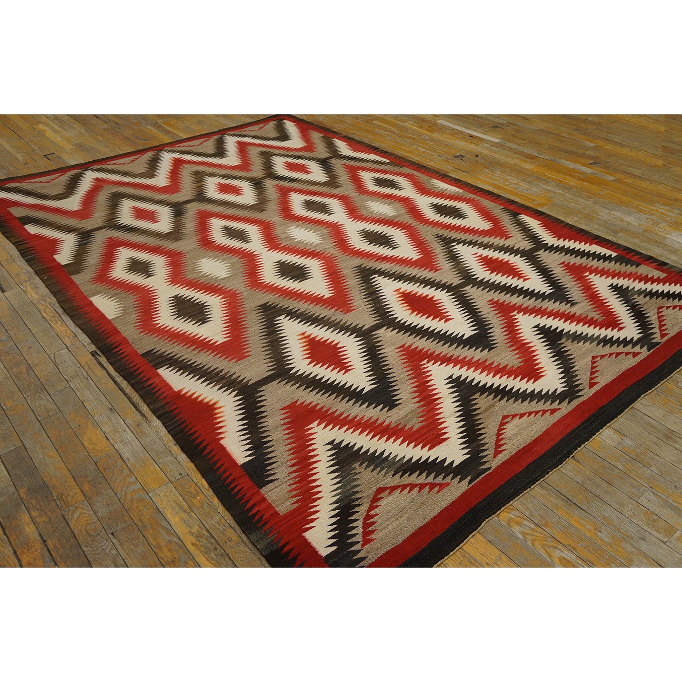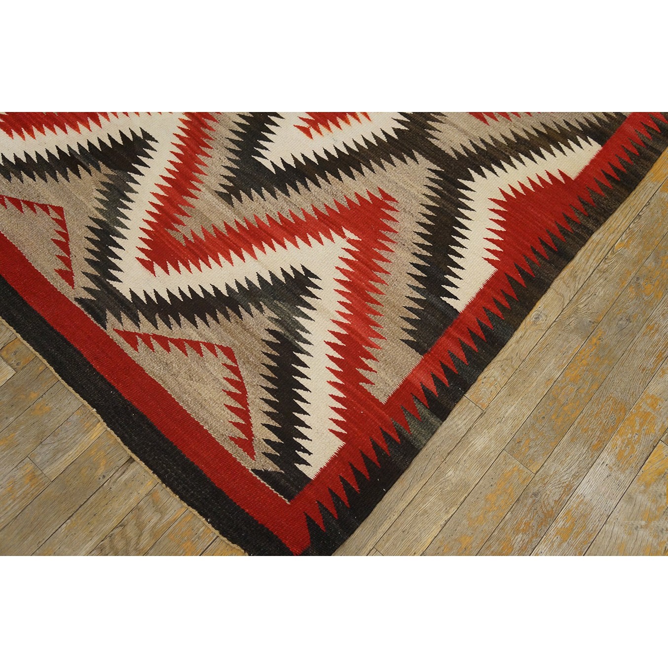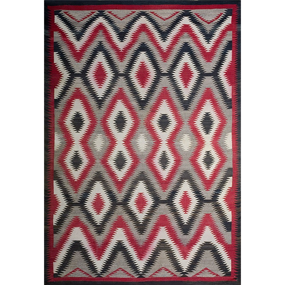 This rare small carpet format Navajo piece has a light grey natural wool field covered by serrated and similarly drawn, nested lozenges and chevroned triangles, detailed in red., black and ecru. The central red pinched double lozenges are flanked by laterally joined charcoal tall lozenges. Charcoal border serrated along the sides and a plain red inner stripe. Well-balanced, dynamic design. Excellent condition.