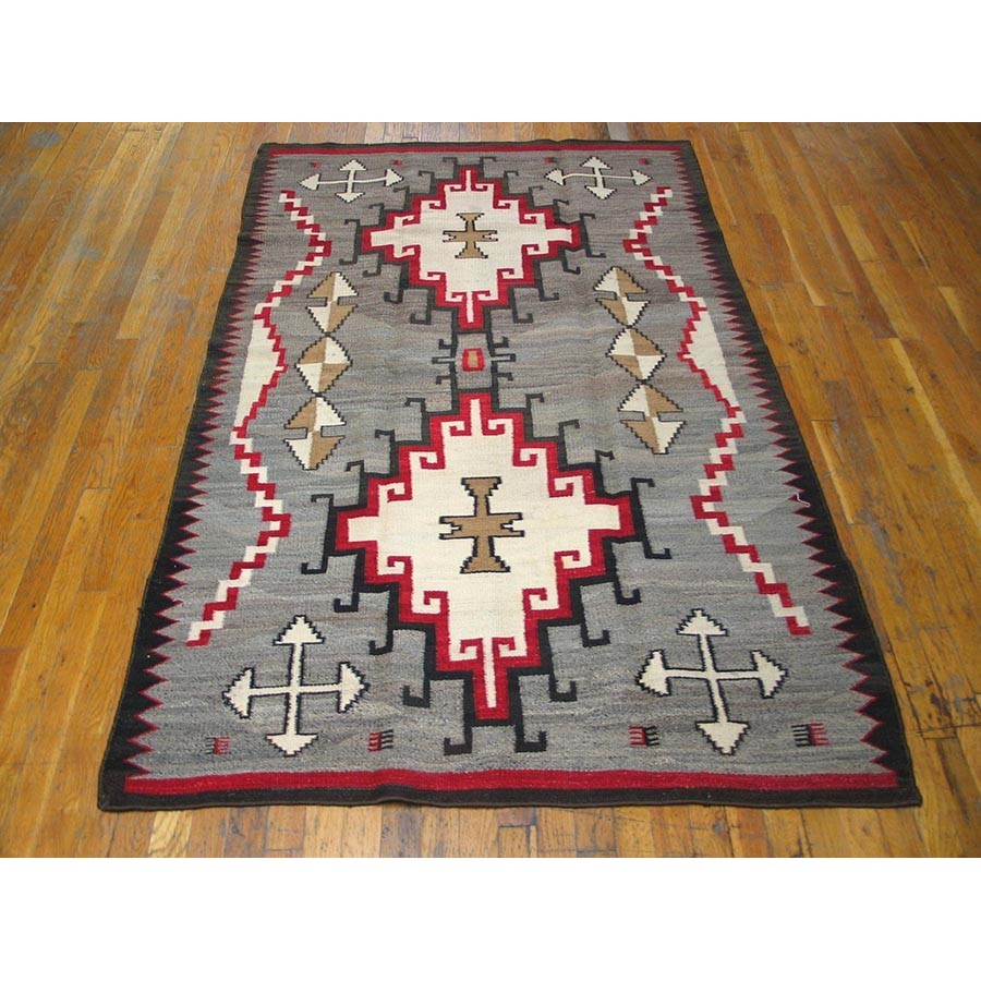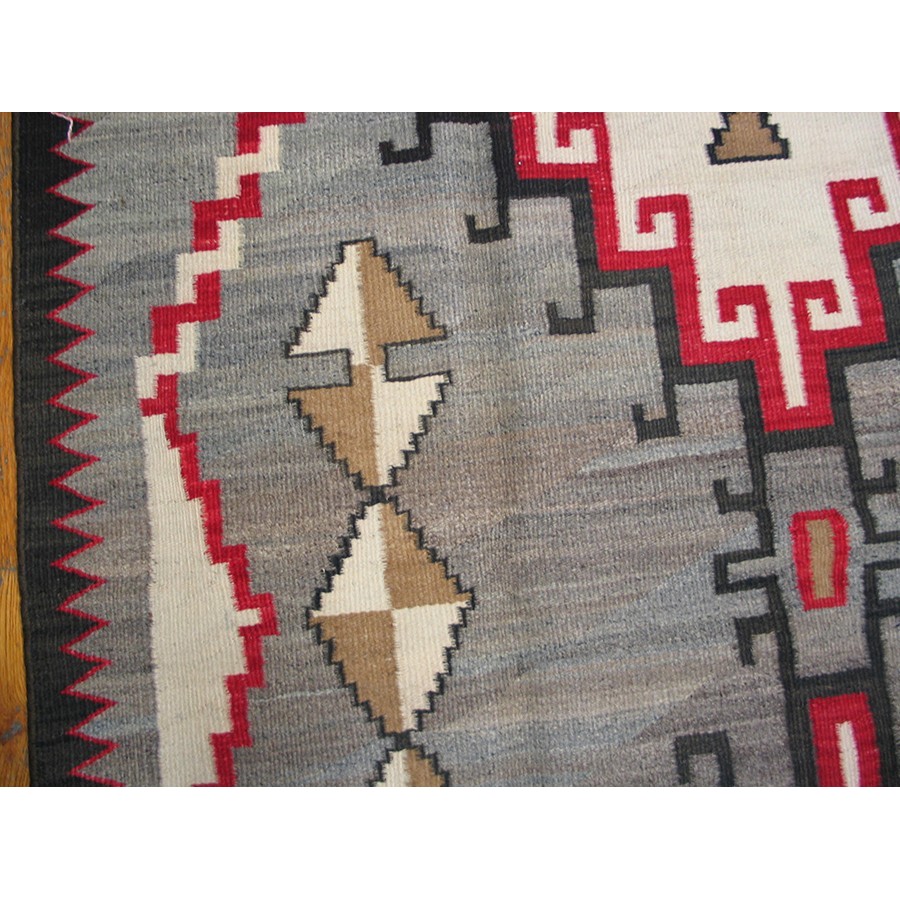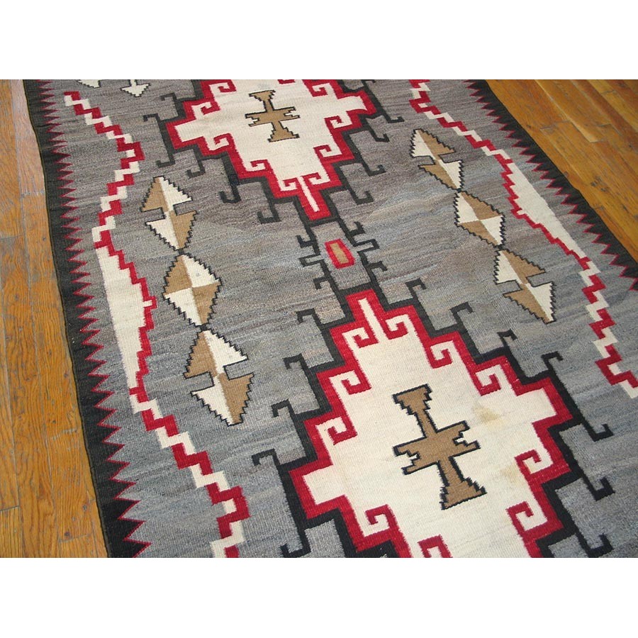 Maybe Teec Nos Pas, but surely influenced by Caucasian weaving, but with a classic Navajo palette emphasizing flannel grey, ecru, black, camel and red. The abrashed field shows two lightly connected, multiply stepped and hooked panels with ecru centers. Angular, squared twisted partial borders frame the sides and in each field corner has an arrowhead cross. Well-articulated pattern and in excellent condition.