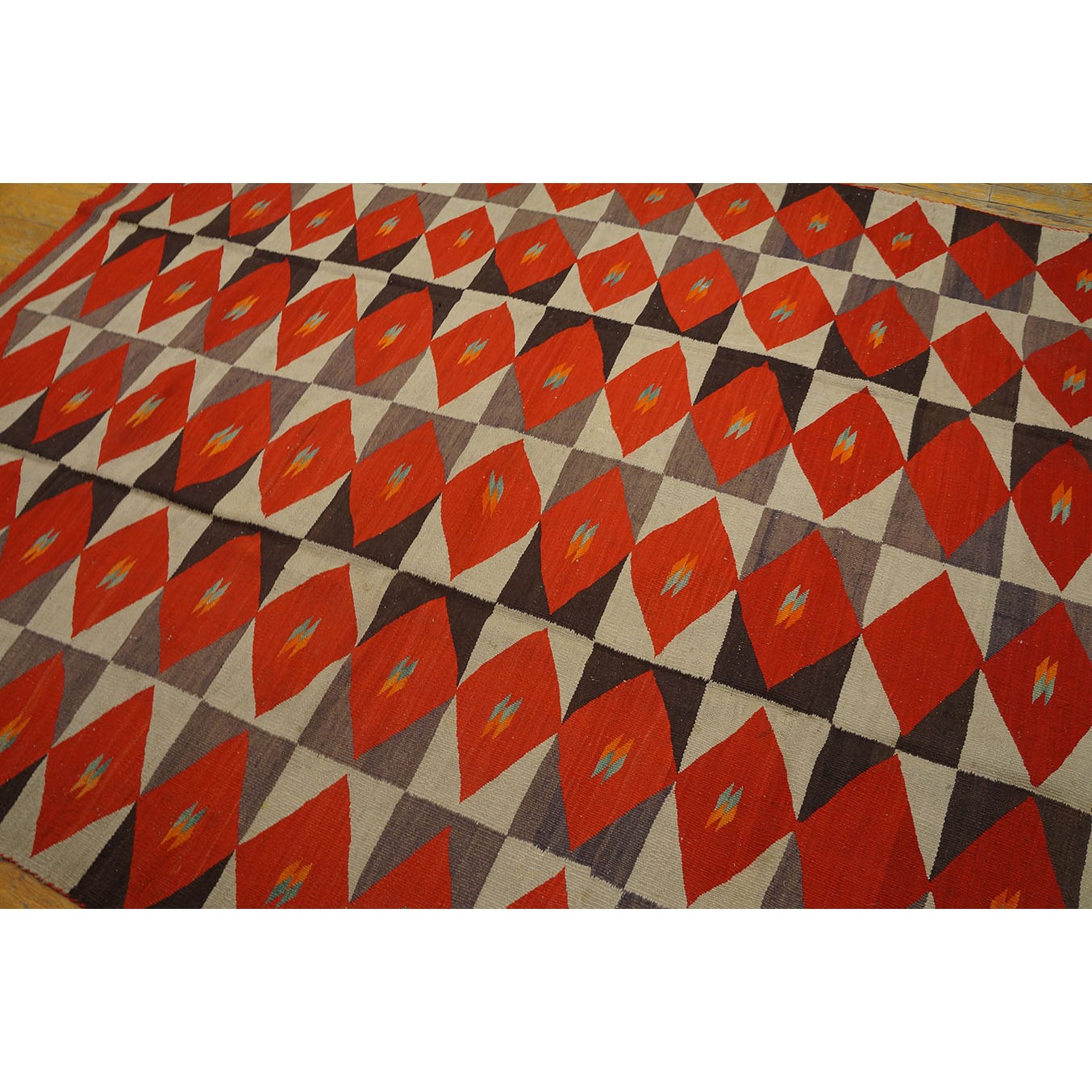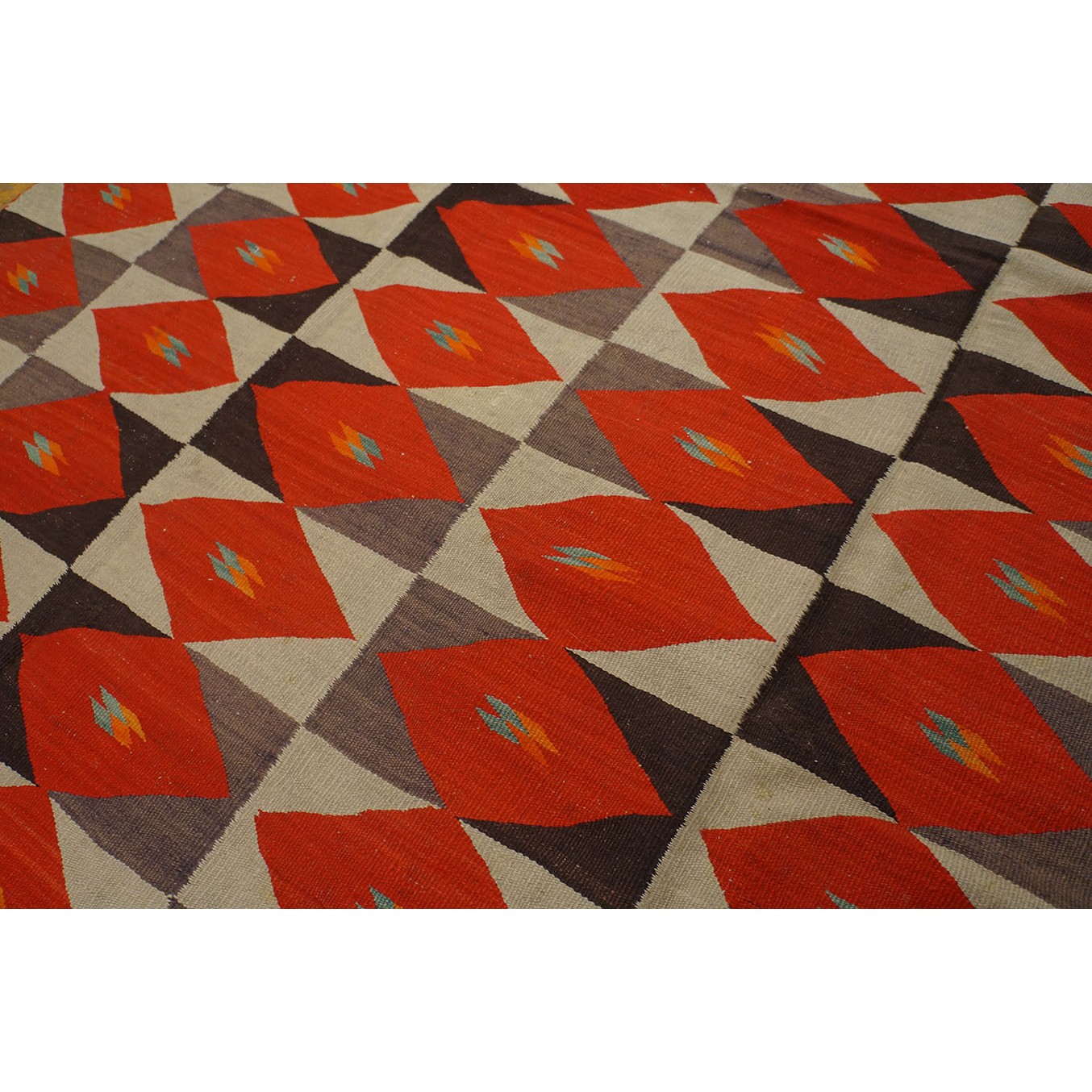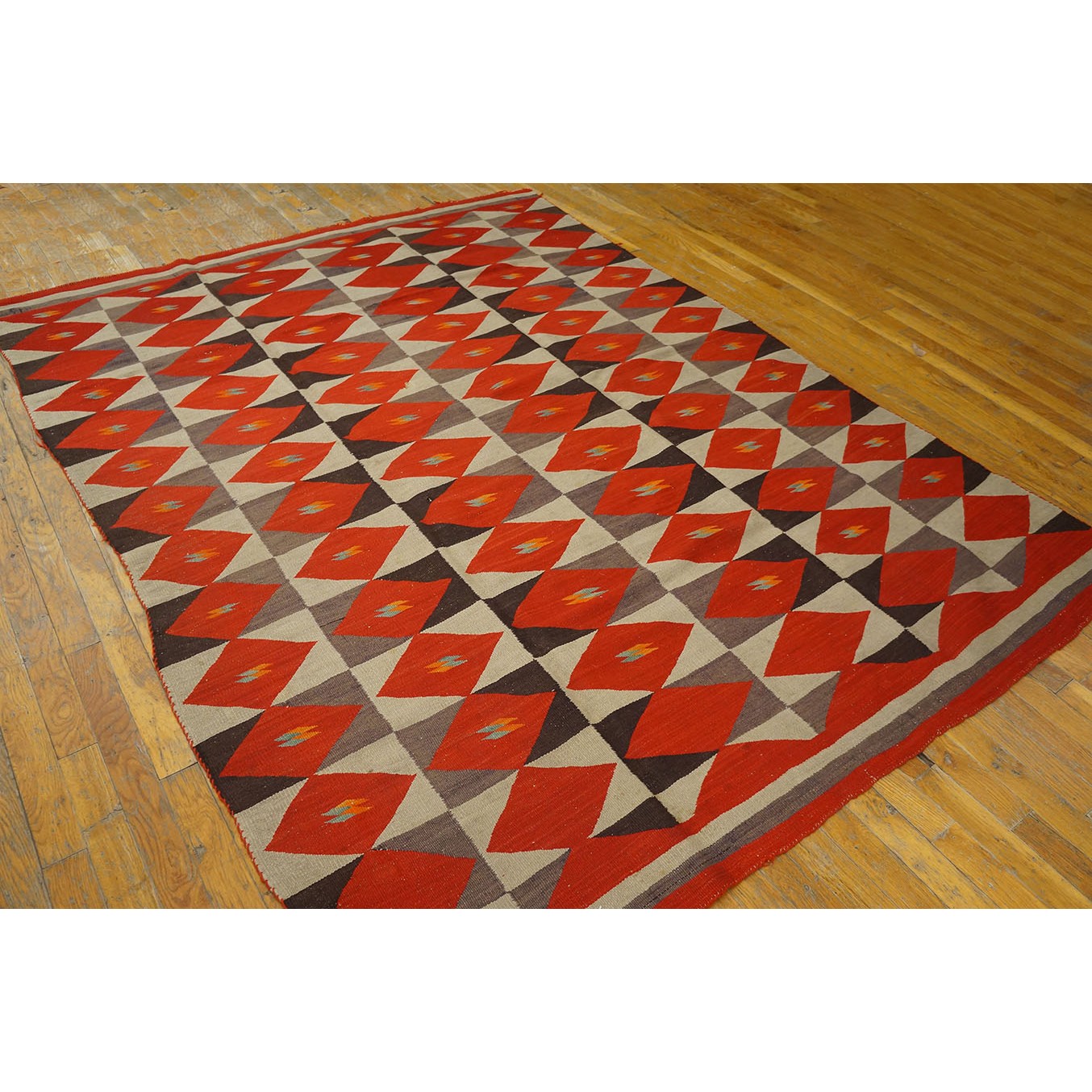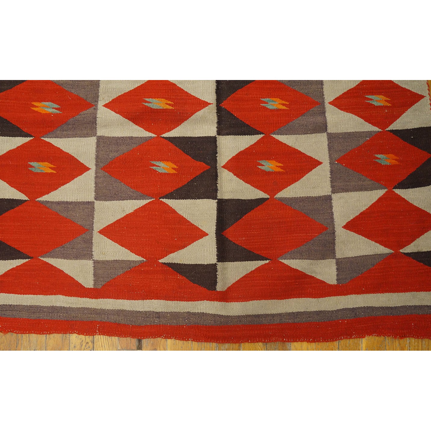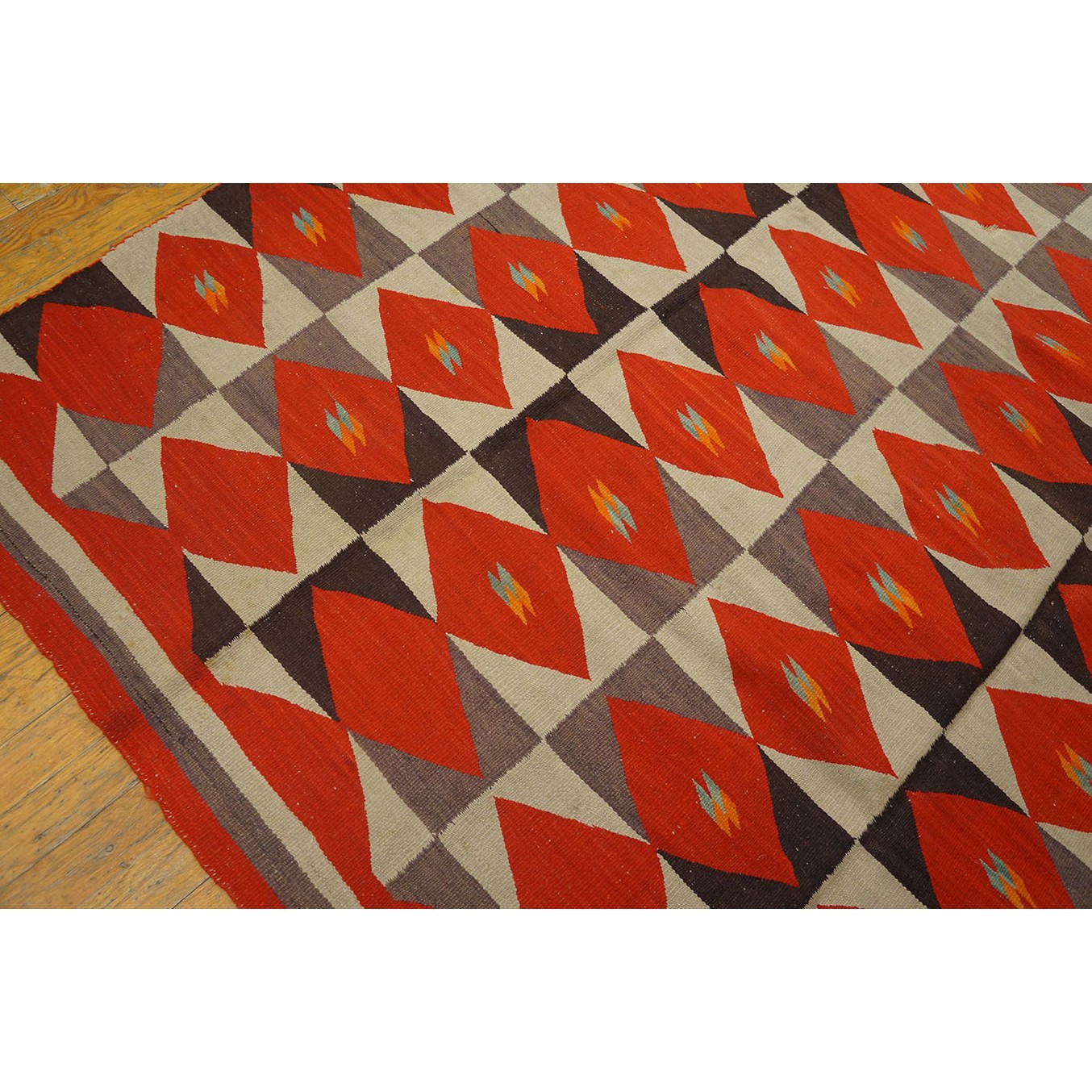 The pattern of six columns of rectangles enclosing lozenges is slightly irregular, with only single brown triangles in certain panels and some rows skipping central details in favor of solid reds.  The execution is informal with panels tilting and stretching, red lozenges flattening or pulled. It may be the work of two weavers. The weavers probably spun and dyed all the wool. It was woven, as Navajo rugs generally are, on a vertical loom with a wooden framework. It is slightly larger than usual.