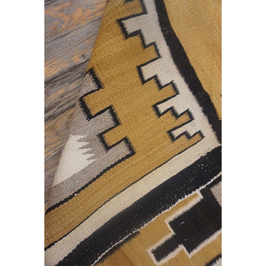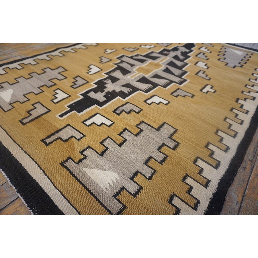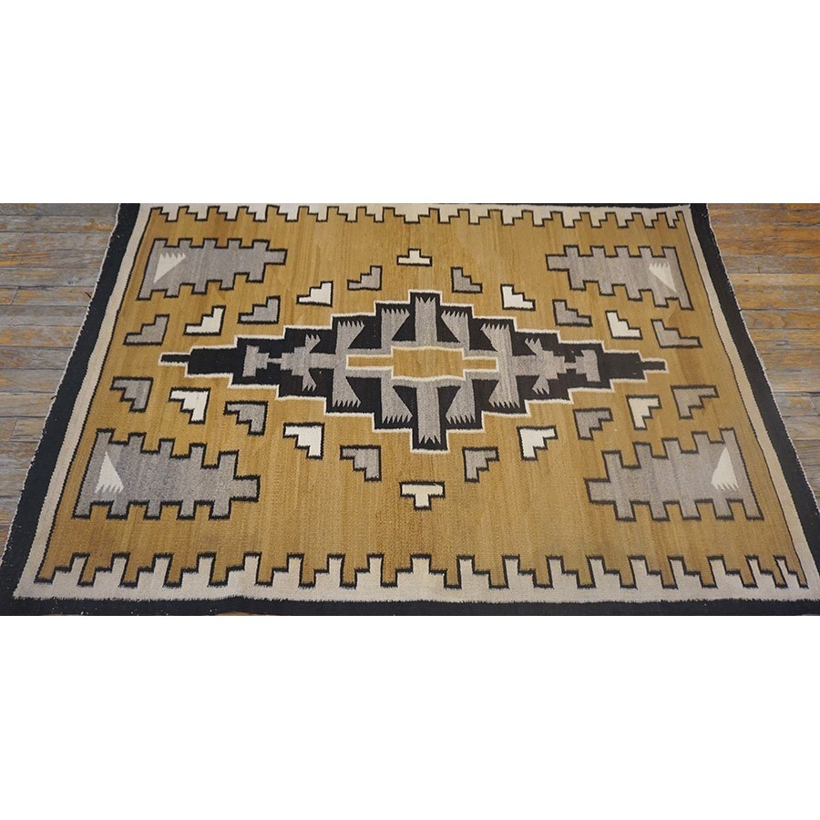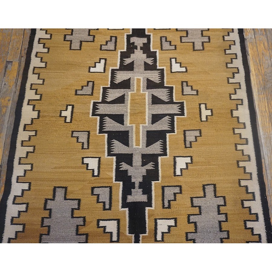 A very unusual camel-gold field displays a quasi-Caucasian tall charcoal medallion with a grey “backbone”, within an ivory stepped meander border and grey notched corner triangles. Well-woven. Excellent condition.