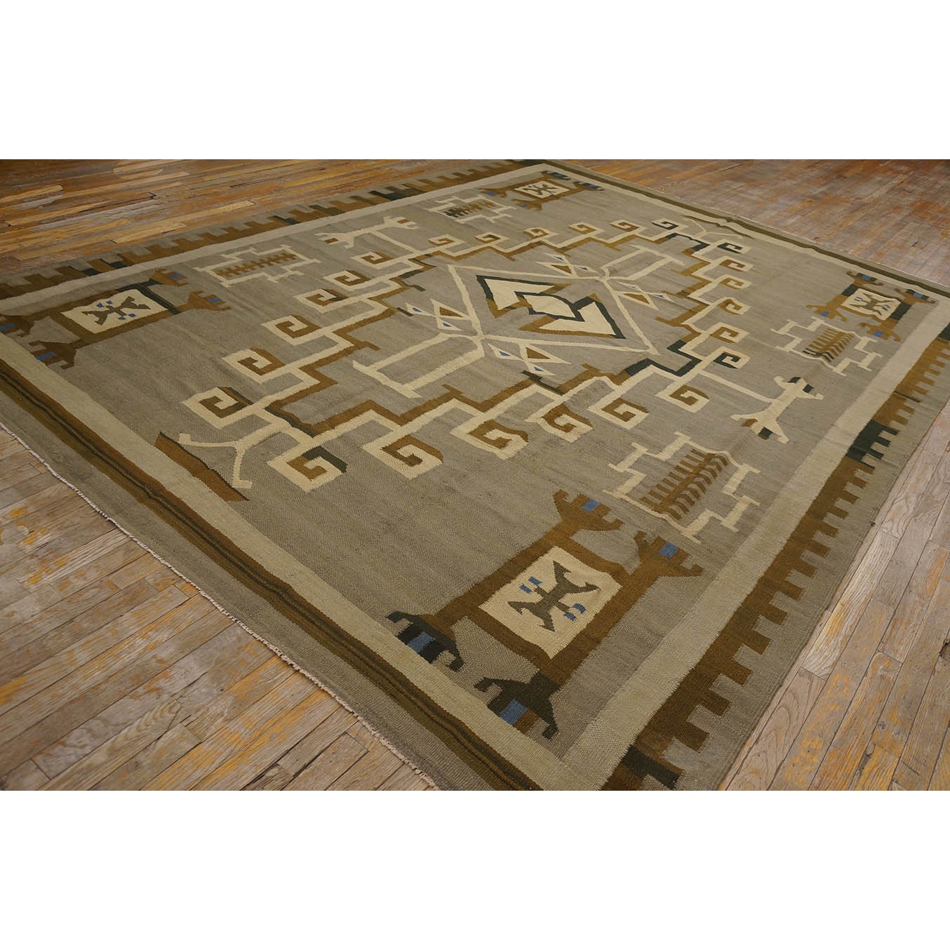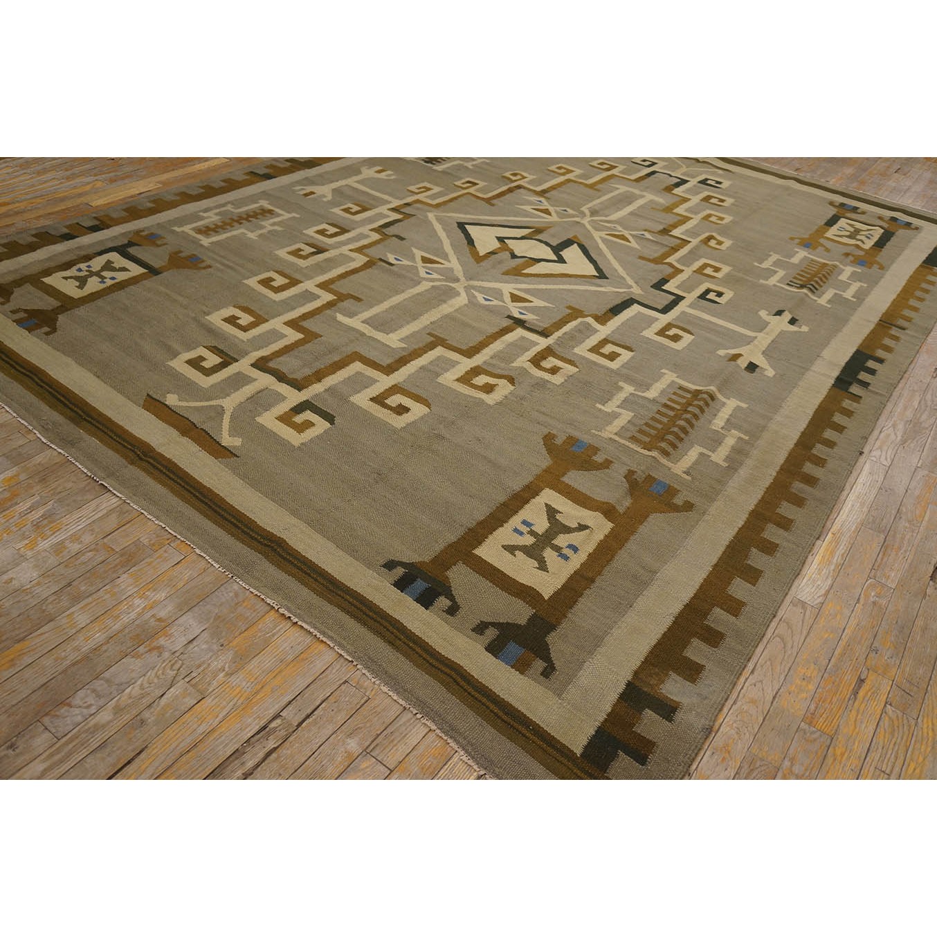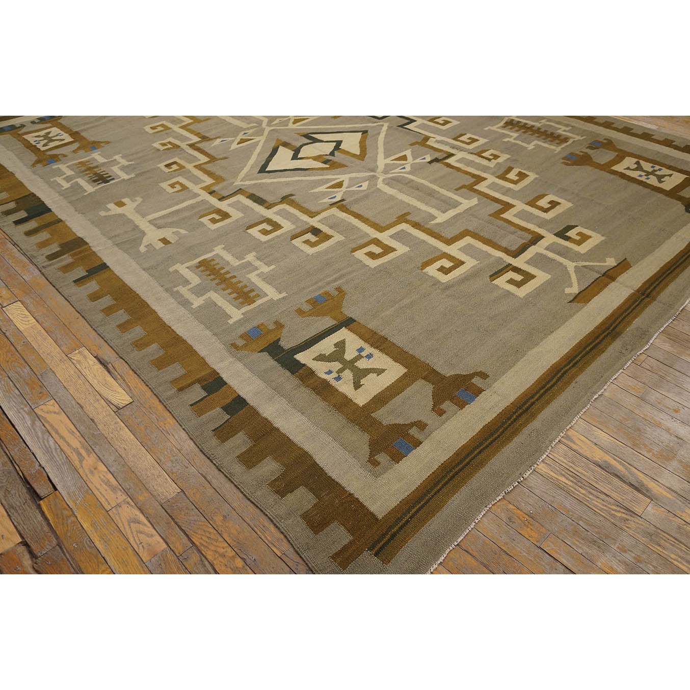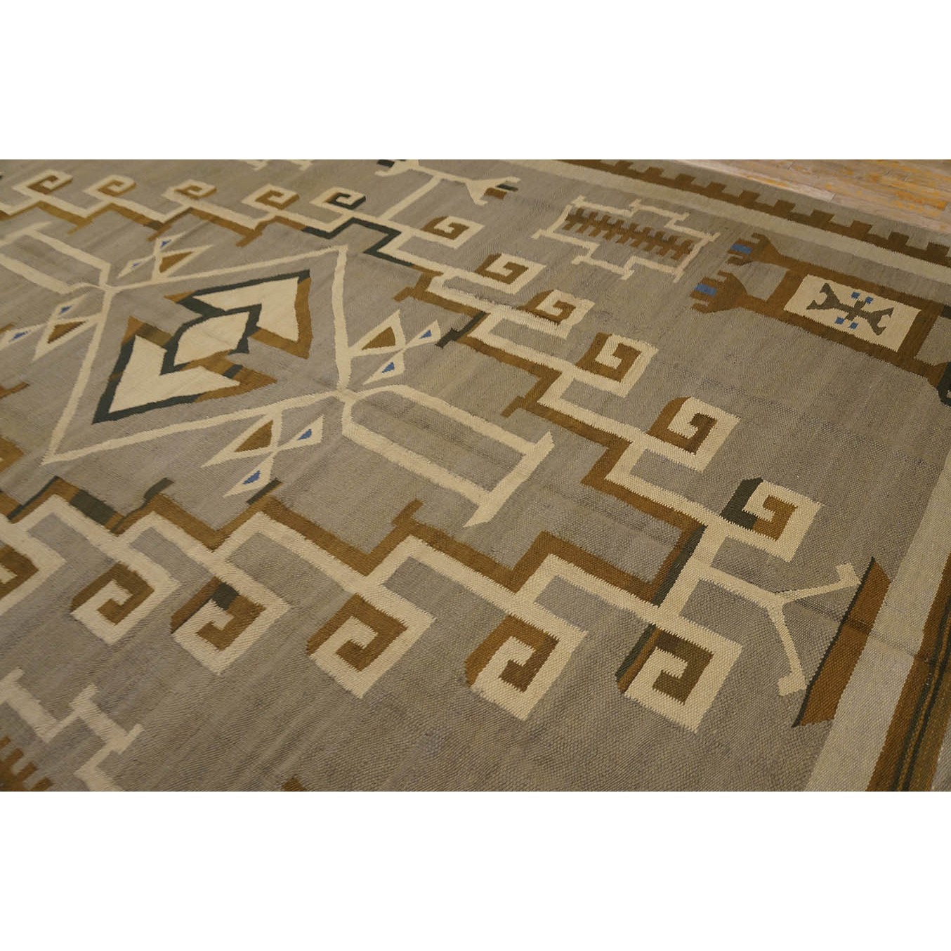This is a very rare giant vintage/antique Navajo carpet in a Two Grey Hills Caucasian – inspired stepped and hooked open medallion outlined in cream and rust-red on a light grey natural ground, with ivory and red corner squares and other geometric devices. Distinctly abrashed rust and grey reciprocal tab border. Well-balanced and very professionally executed. Excellent condition.