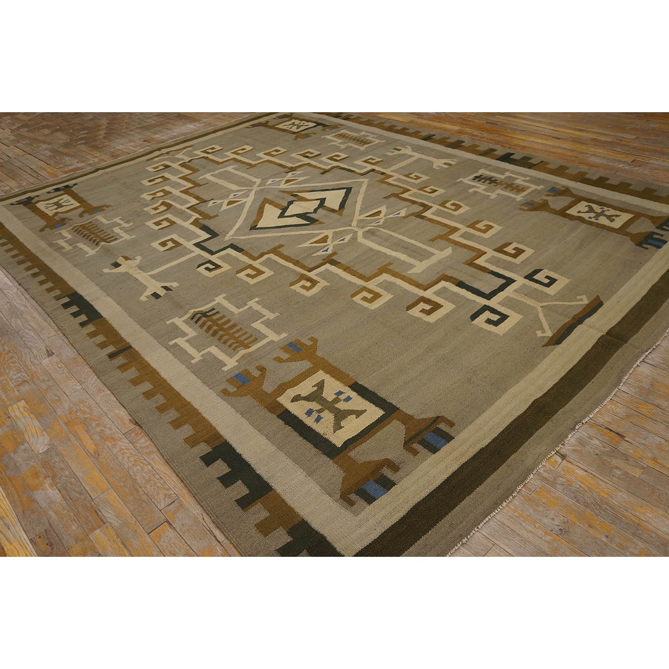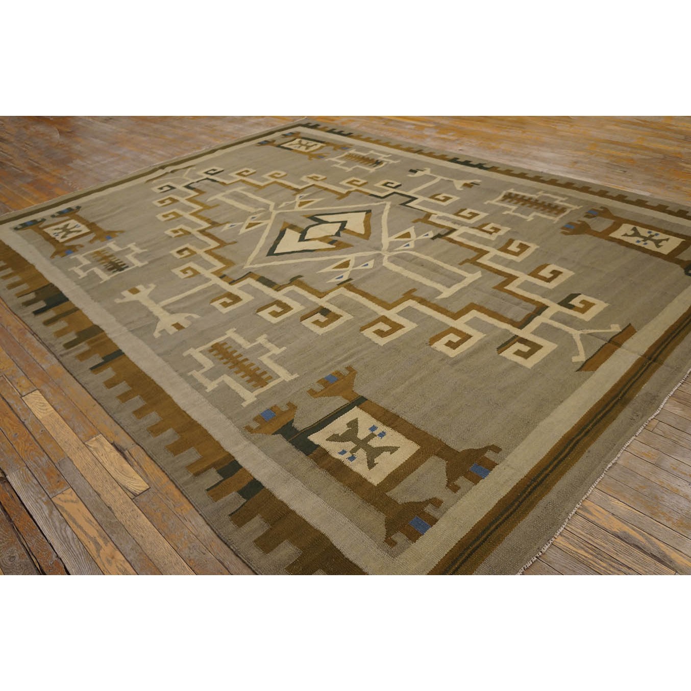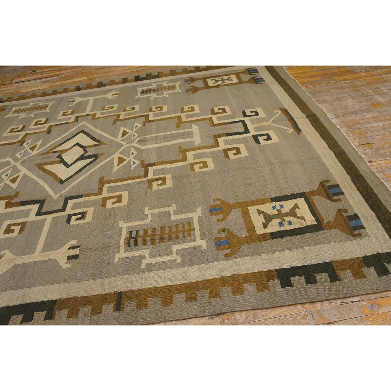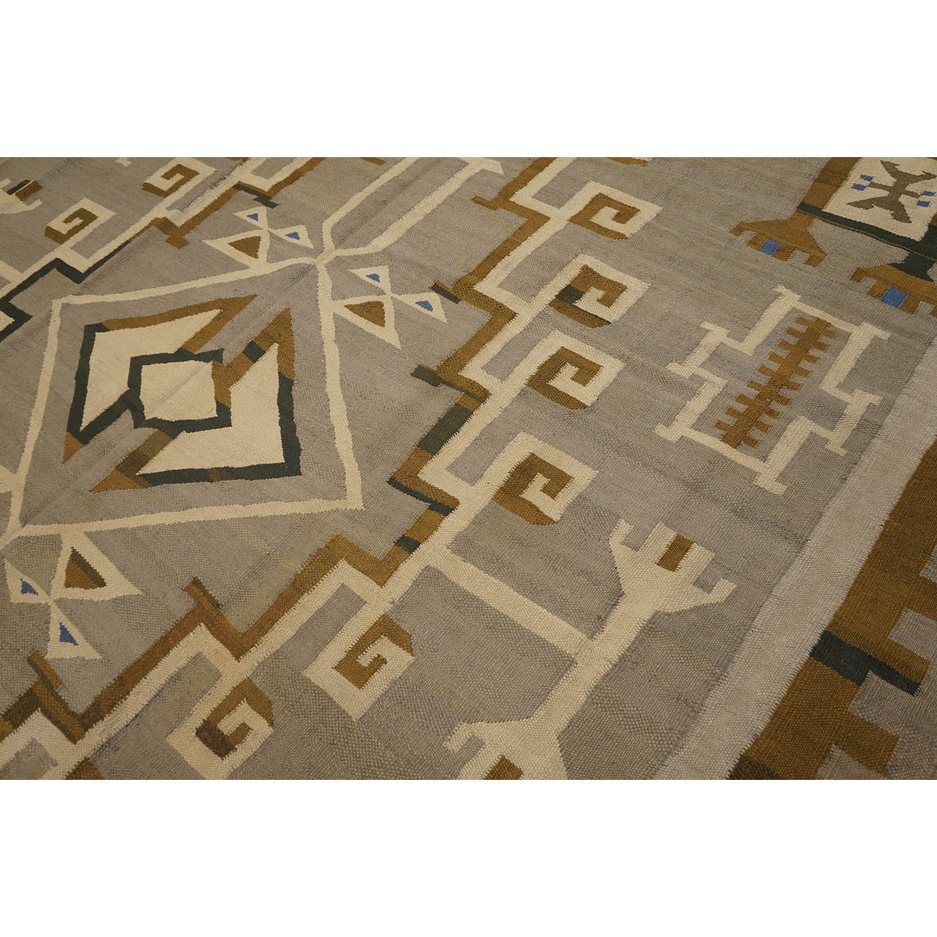 This is a very rare giant vintage/antique Navajo carpet in a Two Grey Hills Caucasian – inspired stepped and hooked open medallion outlined in cream and rust-red on a light grey natural ground, with ivory and red corner squares and other geometric devices. Distinctly abrashed rust and grey reciprocal tab border. Well-balanced and very professionally executed. Excellent condition.