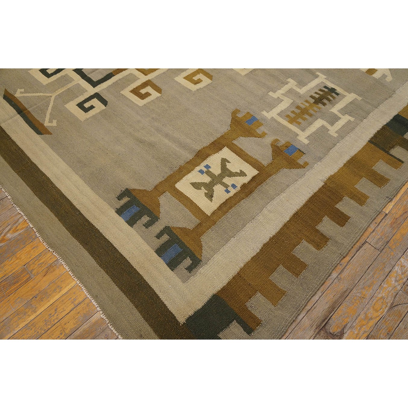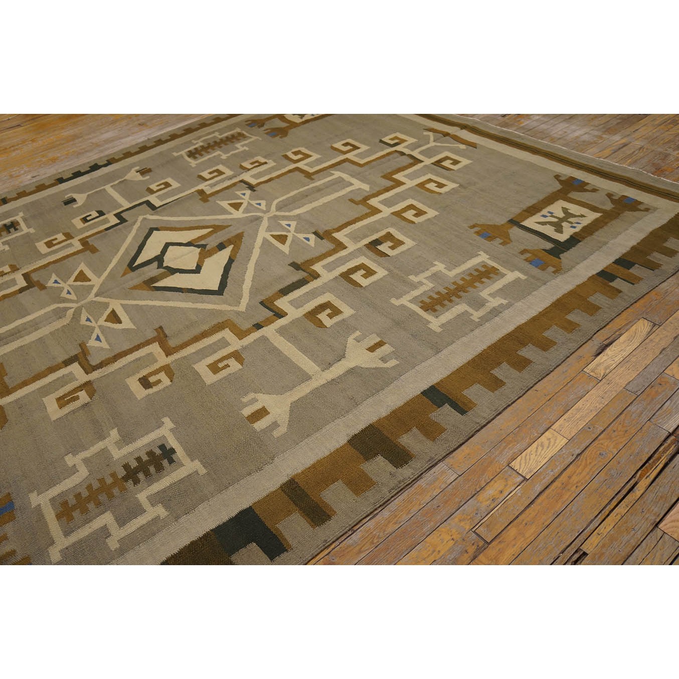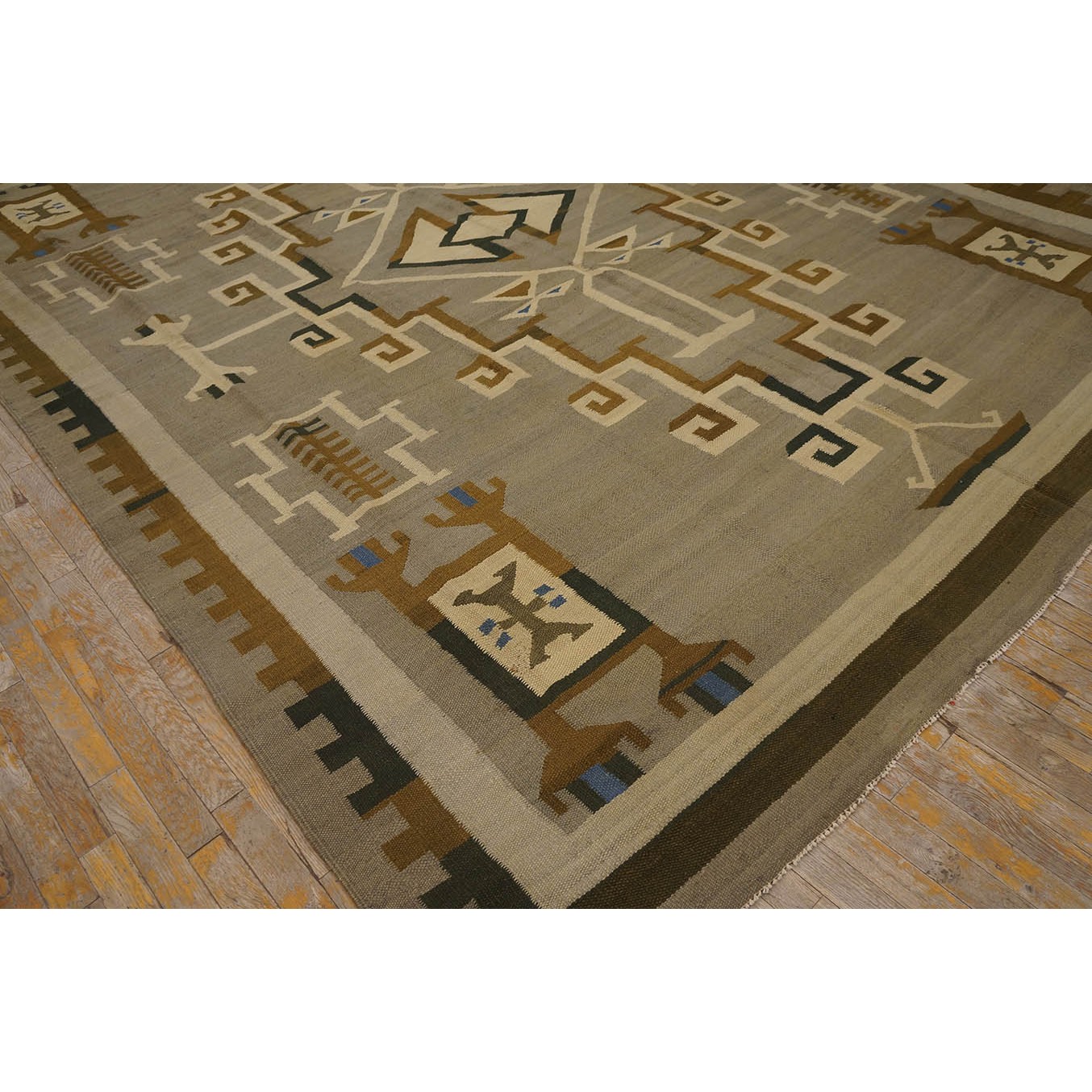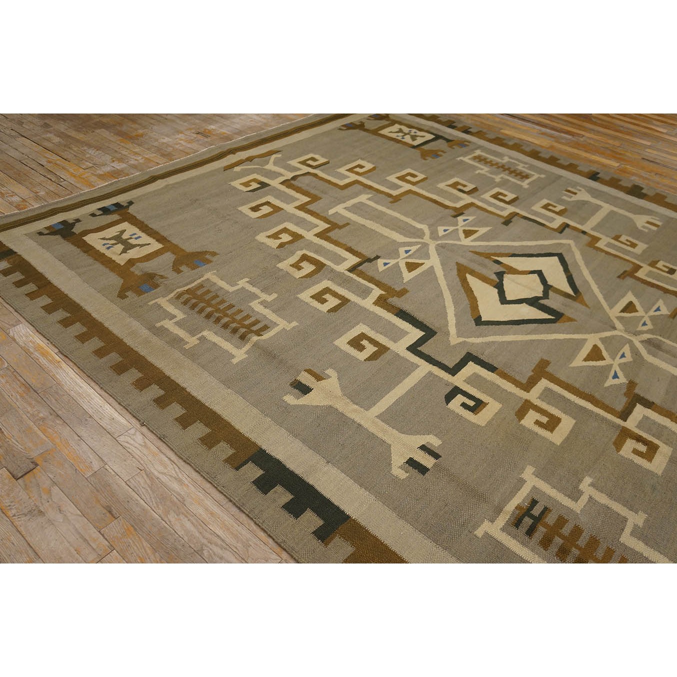 This is a very rare giant vintage/antique Navajo carpet in a Two Grey Hills Caucasian – inspired stepped and hooked open medallion outlined in cream and rust-red on a light grey natural ground, with ivory and red corner squares and other geometric devices. Distinctly abrashed rust and grey reciprocal tab border. Well-balanced and very professionally executed. Excellent condition.