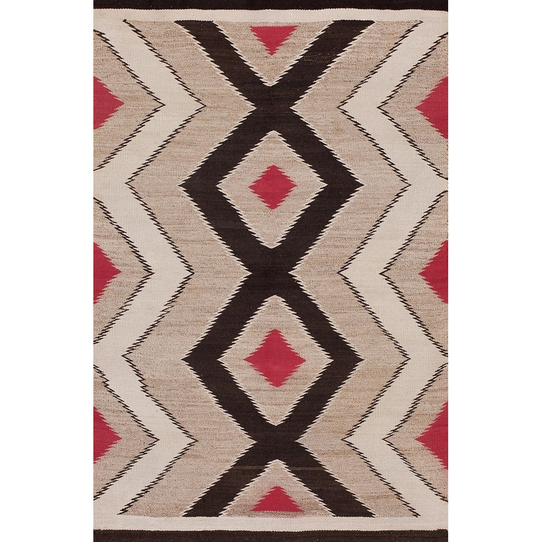 Navajo weavers just love zig-zags, be they small or, as here, bold, defining a central column of soft grey and red diamonds. The black central column is the most striking motif and the nearby tones grade off through grey to sand with no side borders, just narrow black and sand strip end borders. Small scale color joins. Good condition.