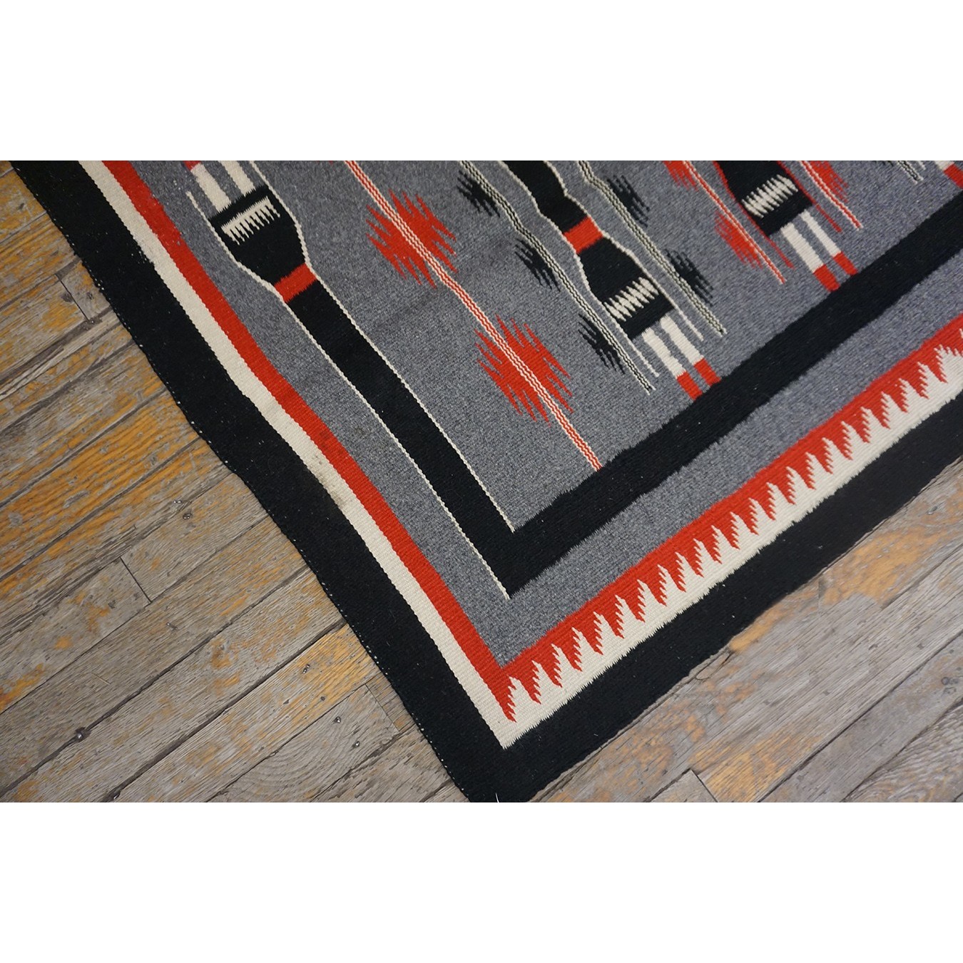 The black border of this figural Yei rug frames the grey field with three standing dancers and a fourth stretched and bent around three sides.