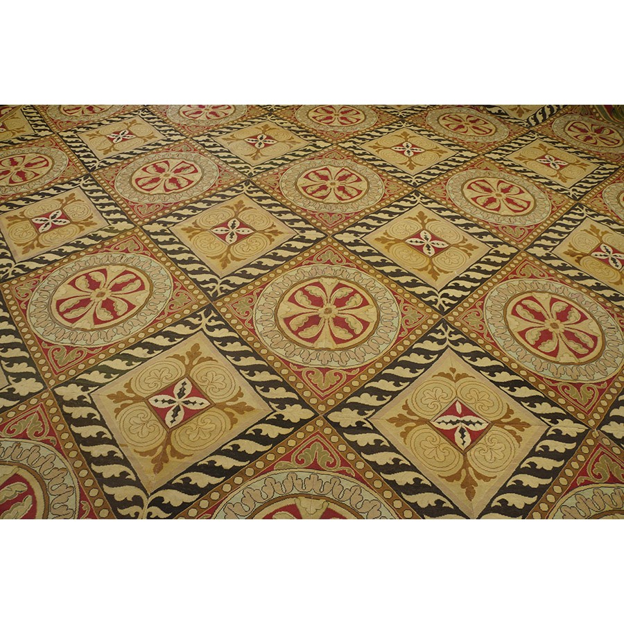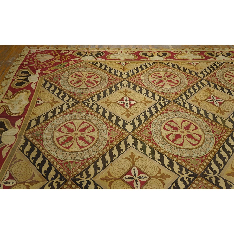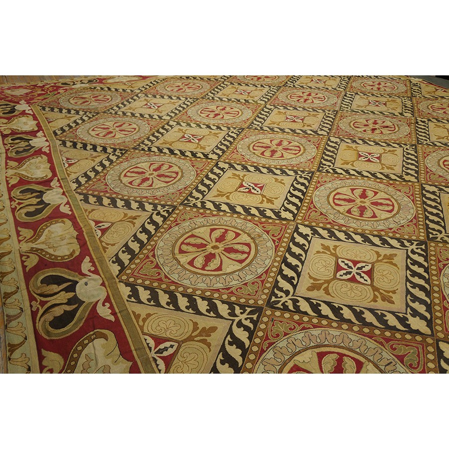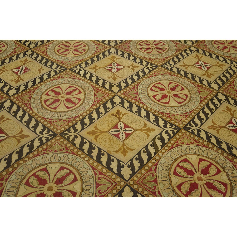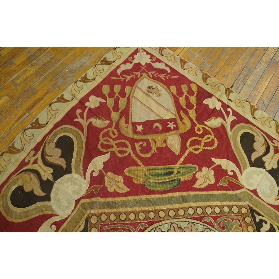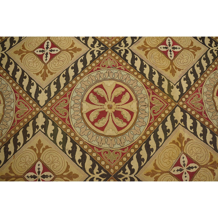 This mosaic floor pattern wool needlepoint carpet was clearly a special commission for a high-level Roman Catholic ecclesiastic, bishop and then archbishop / cardinal as indicated by the hats with tassels in the corners, each surmounting a shield of arms, one of which displays the cross, another with a wreath bearing the inscription ‘pax’ or ‘peace’. And the other two more distinctly armorial, probably indicating the cleric’s family name. The more tassels, the higher level the churchman. Monseignors have the fewest tassels, archbishops at the cardinal level the most. The archbishop/cardinal’s arms show a double-armed Cross of Lorraine surmounting a shield with a bend, and another armorial shield shows a bend with a small lion beneath and at the top an azure band with star and crescent ornamentation. The Lorraine Cross may (or may not) indicate service in the capital city of Nancy. Regardless, the original patron should, with further research, be identifiable. The shields indicate a patron of noble birth, as was the usual practice in the Catholic Church in France and Italy in the 19th century. It was probably woven for a large reception room in the archiepiscopal palace of an important French city.