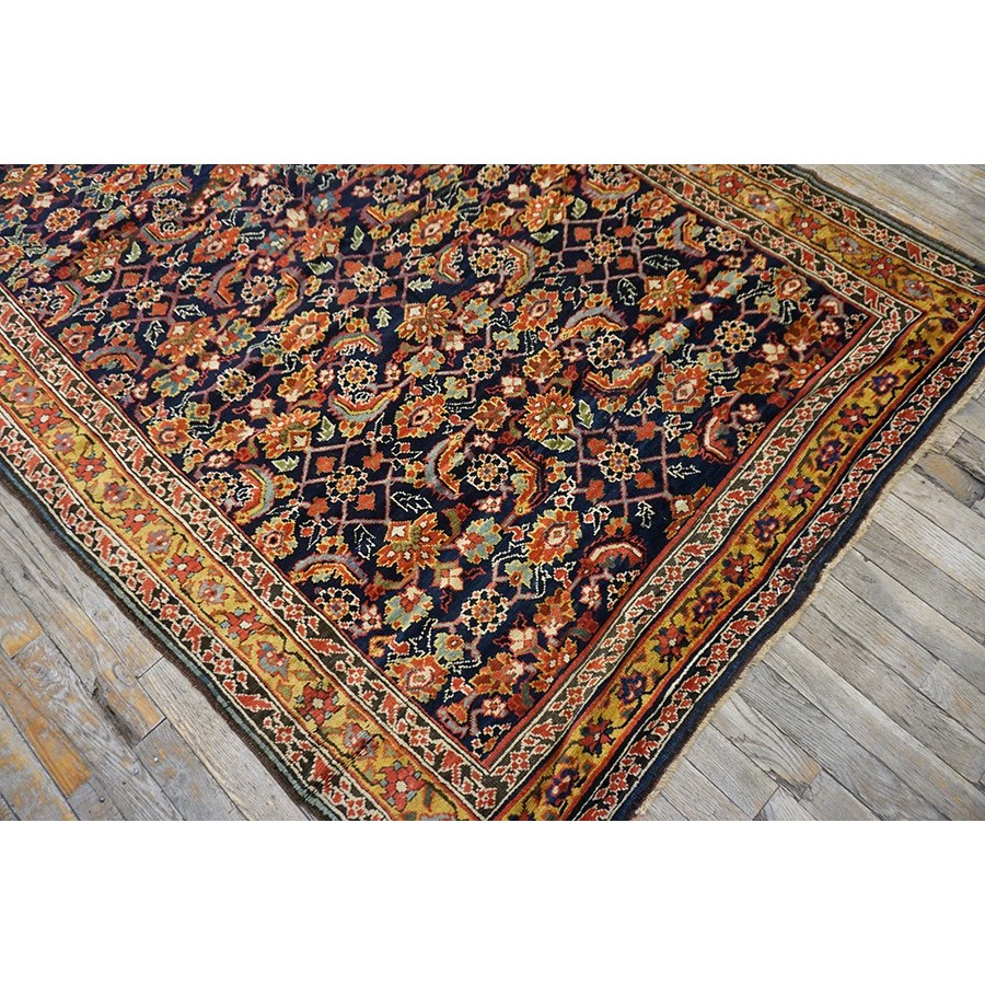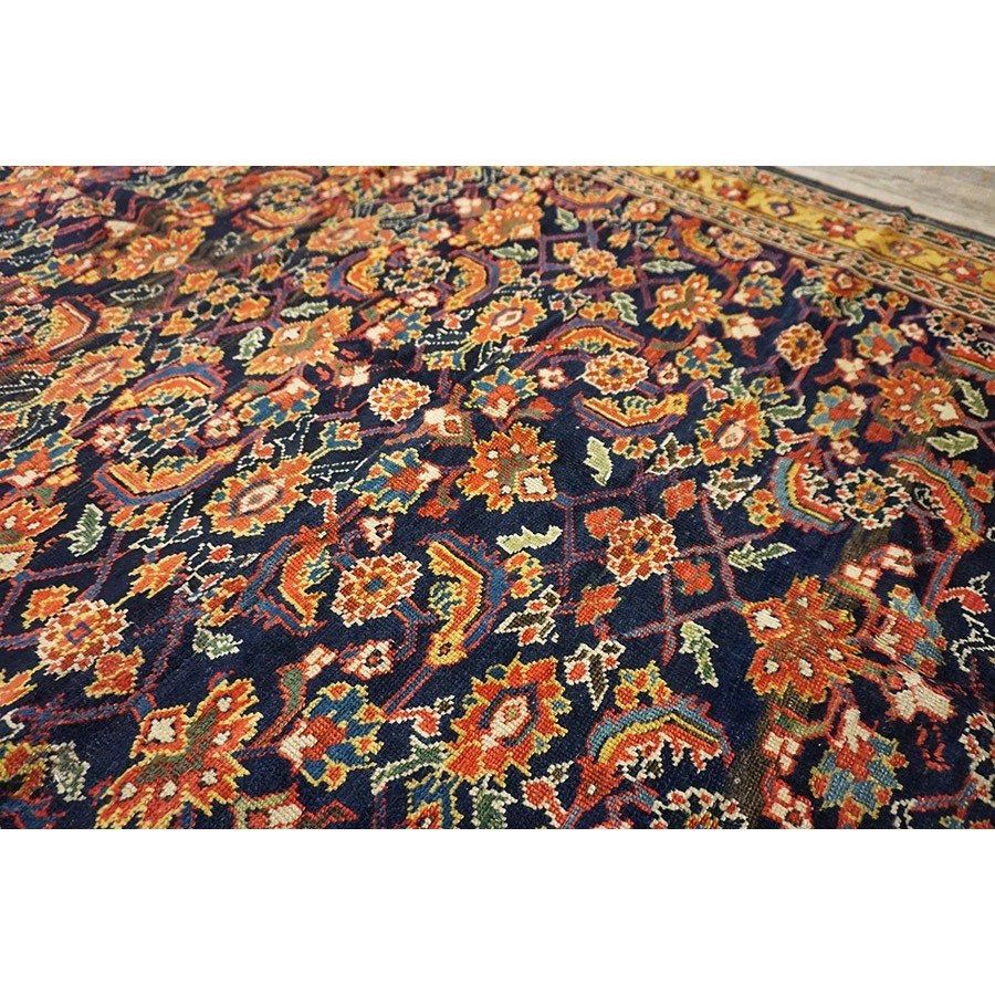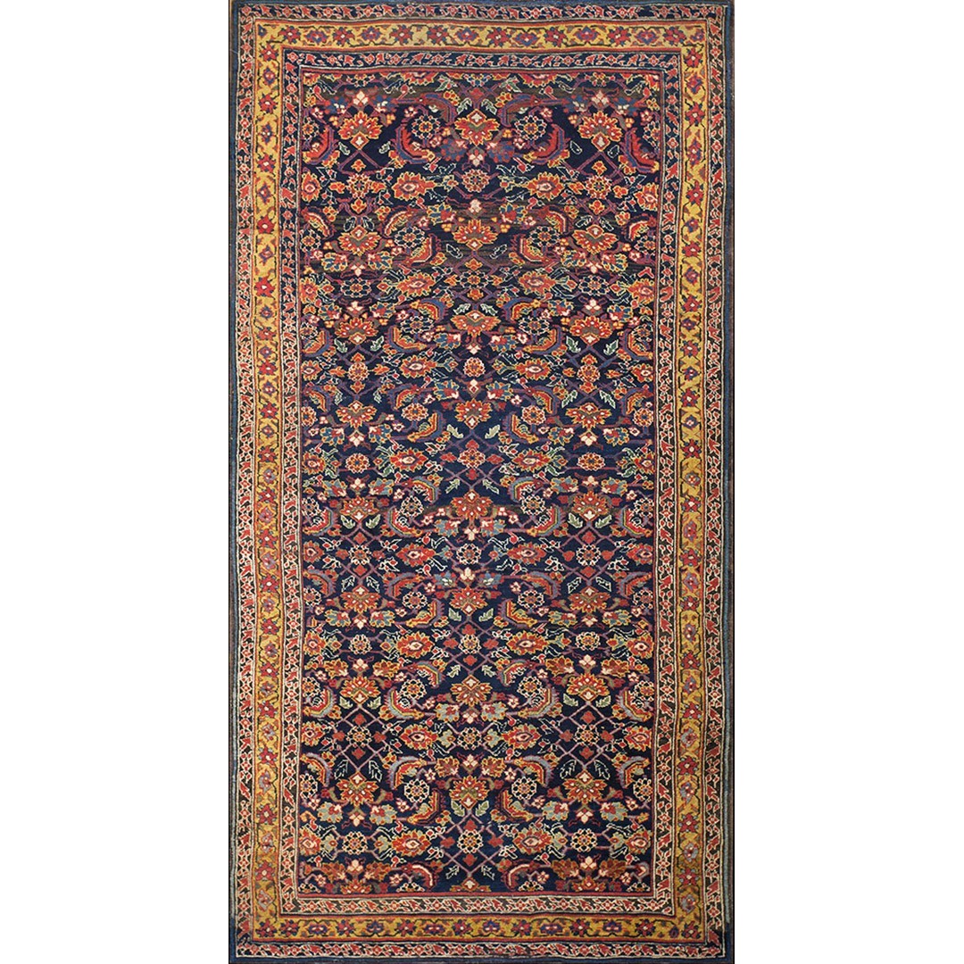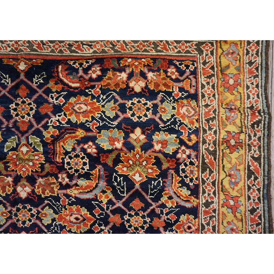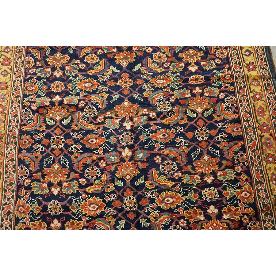 All-over design with Herati pattern on navy background with yellow and brown borders. Hand knotted wool construction.
