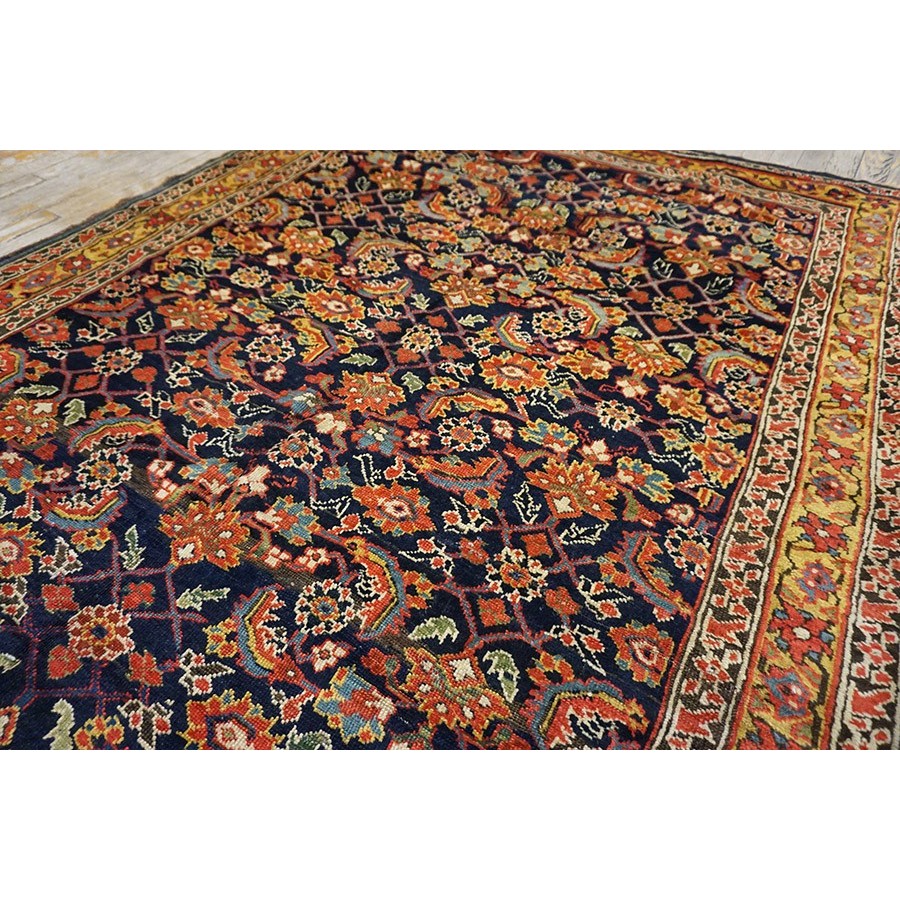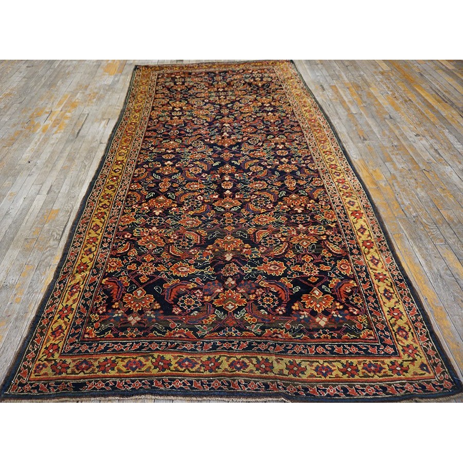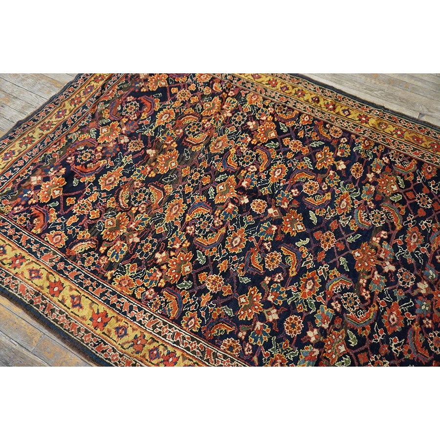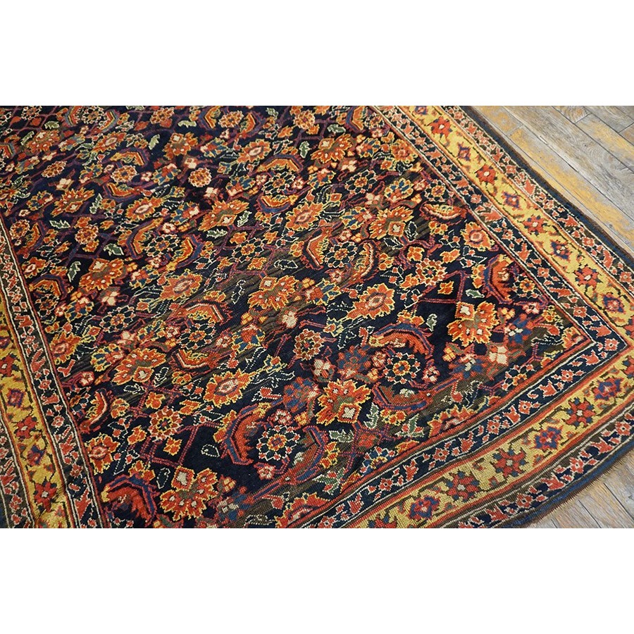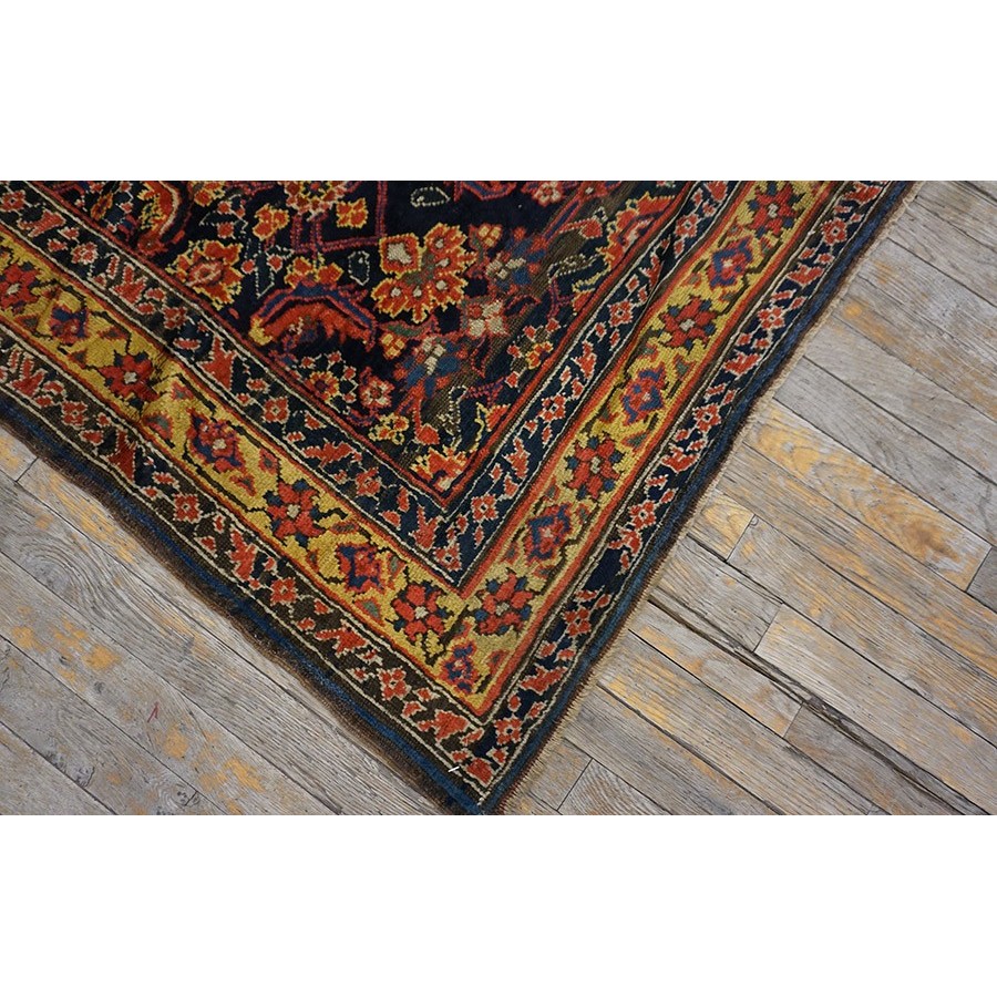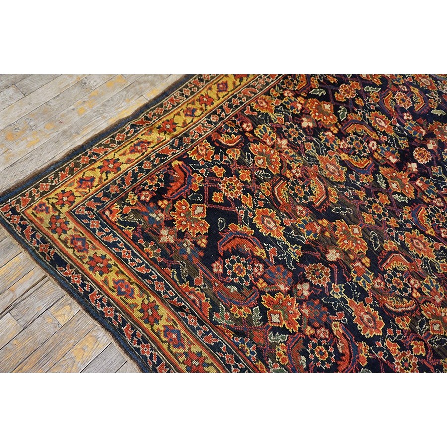 All-over design with Herati pattern on navy background with yellow and brown borders. Hand knotted wool construction.