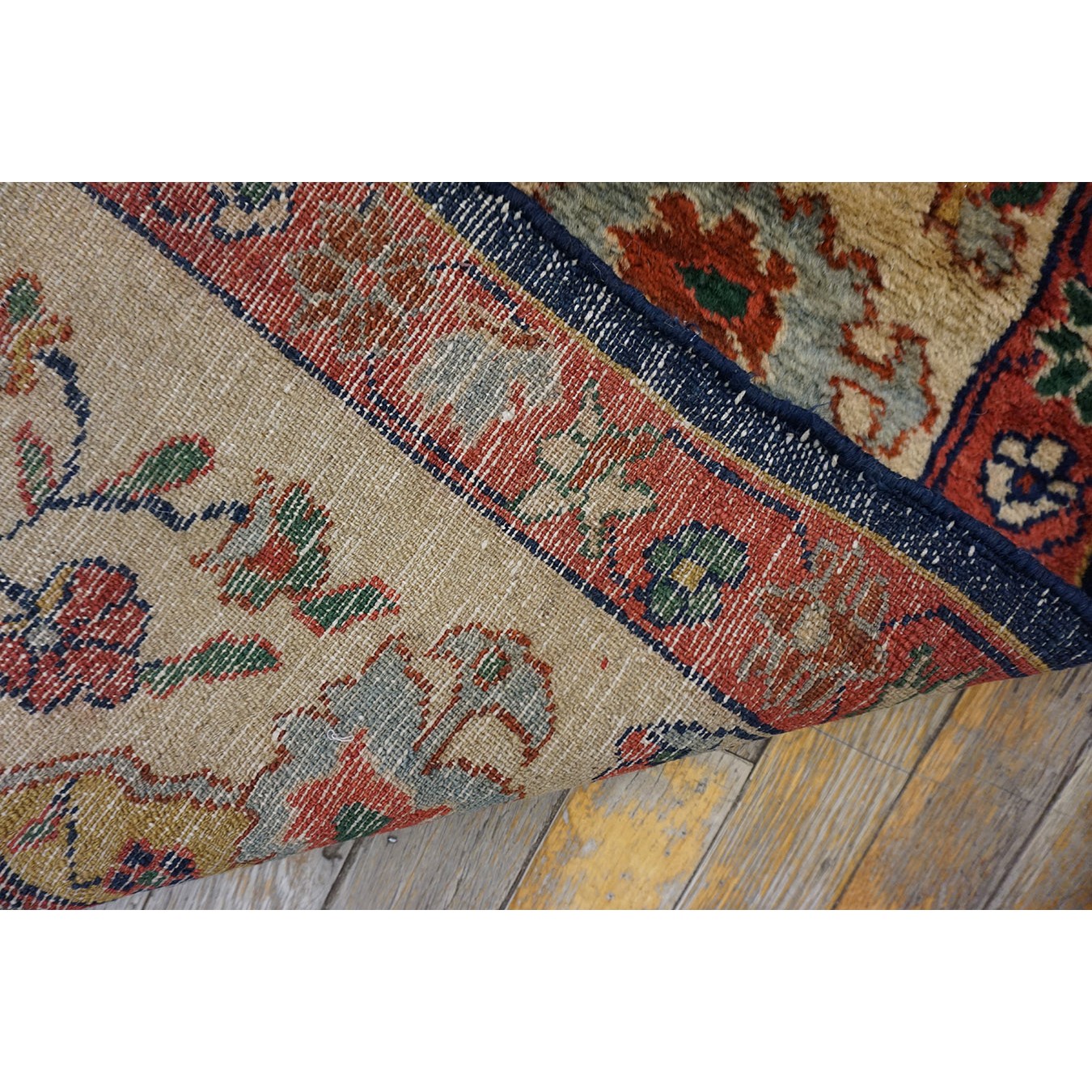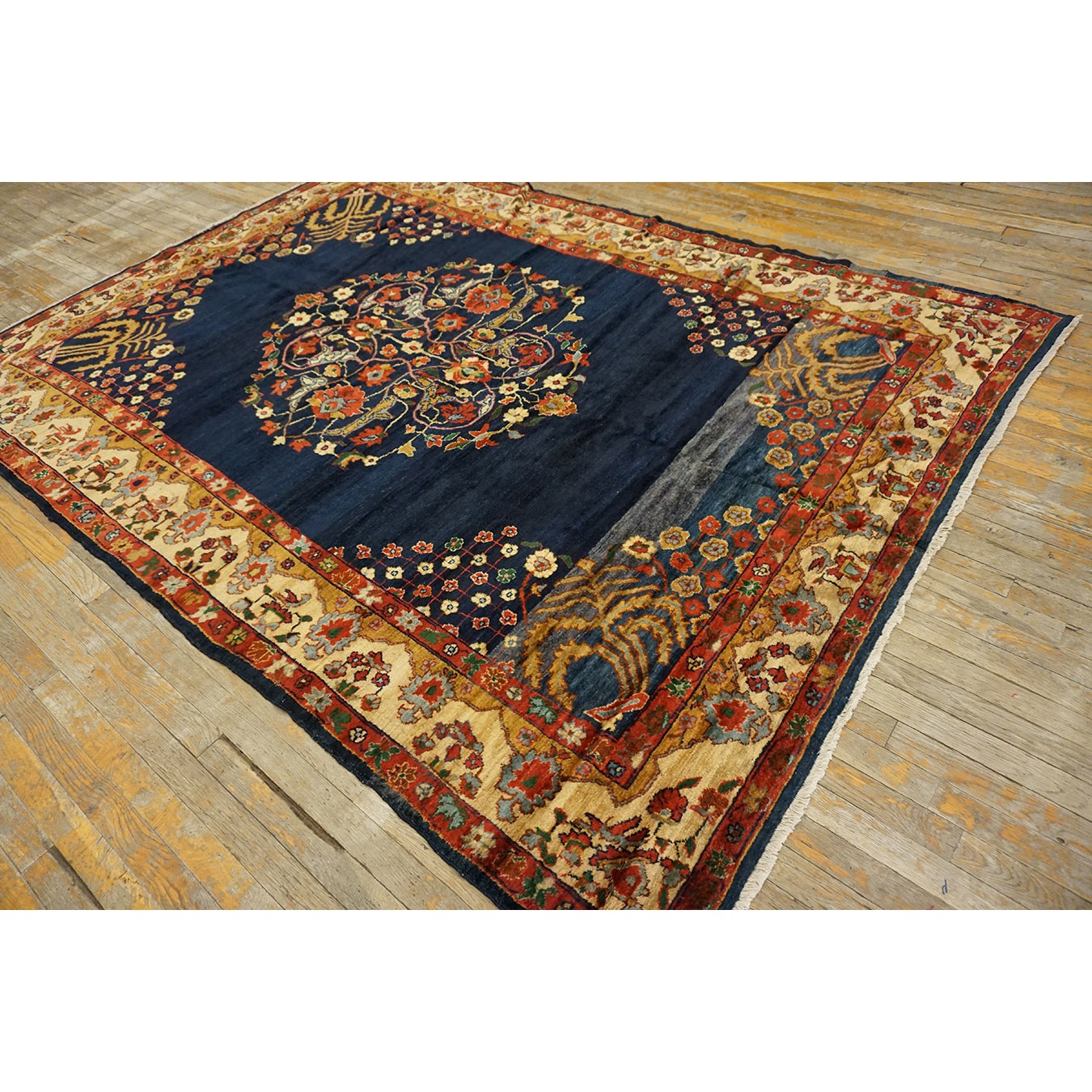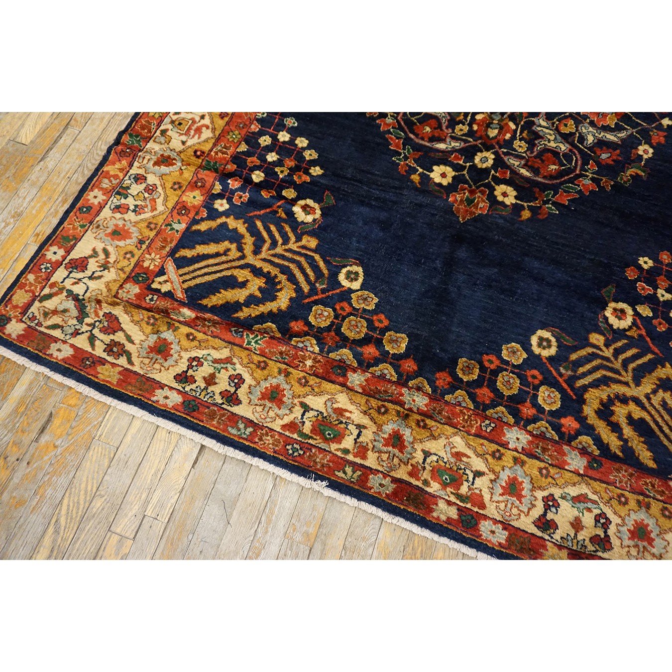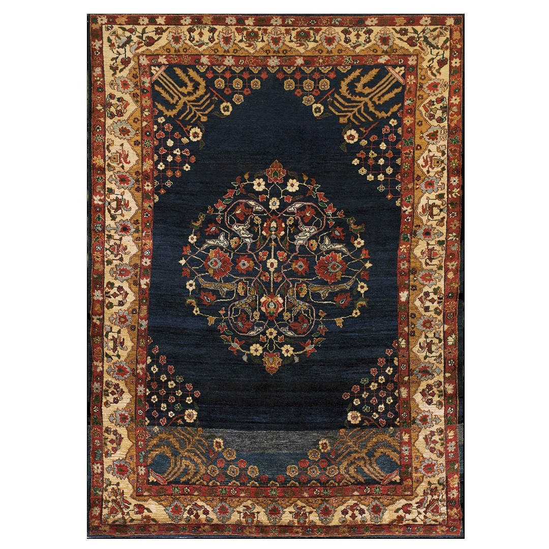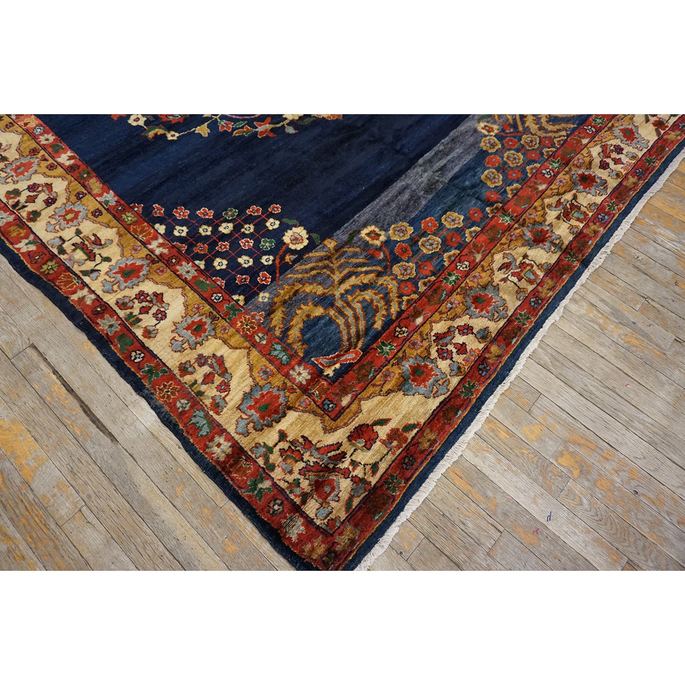 Handmade antique N.W. Persian carpet. Woven circa 1890s (late 19th century). Persian informal rug, Floral central medallion design with trees and floral lattice in corners. Navy background with strong abrash on one end. Ivory major border with rust red minor borders. Hand knotted wool construction.