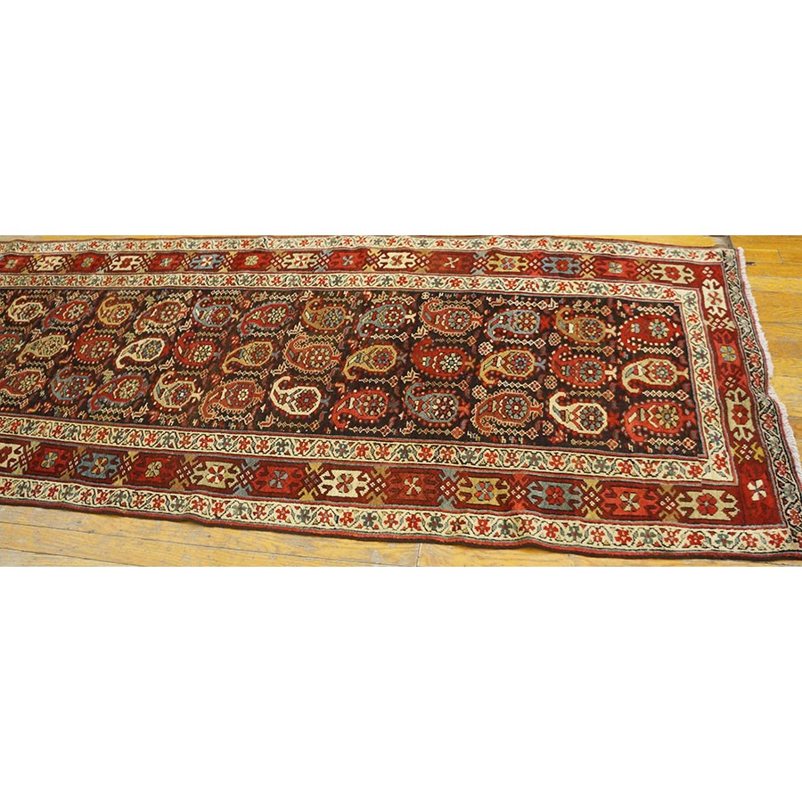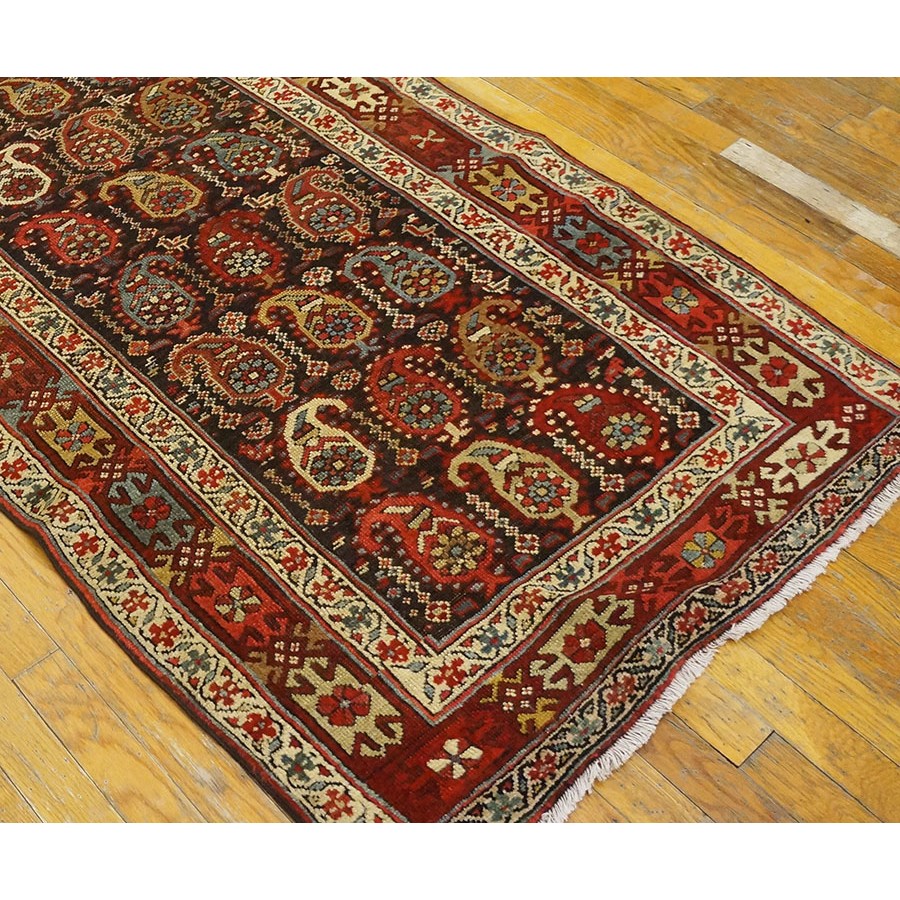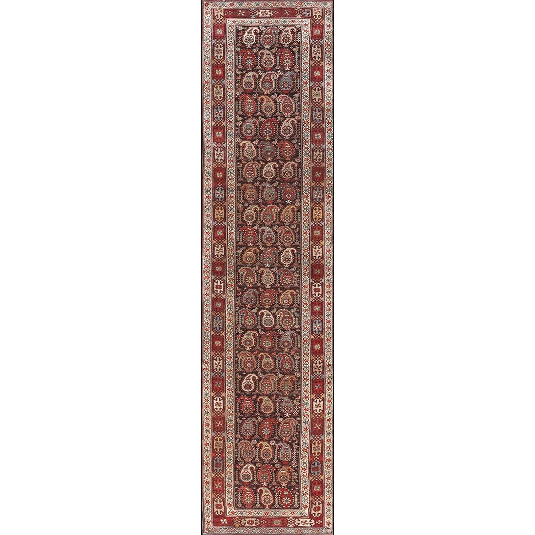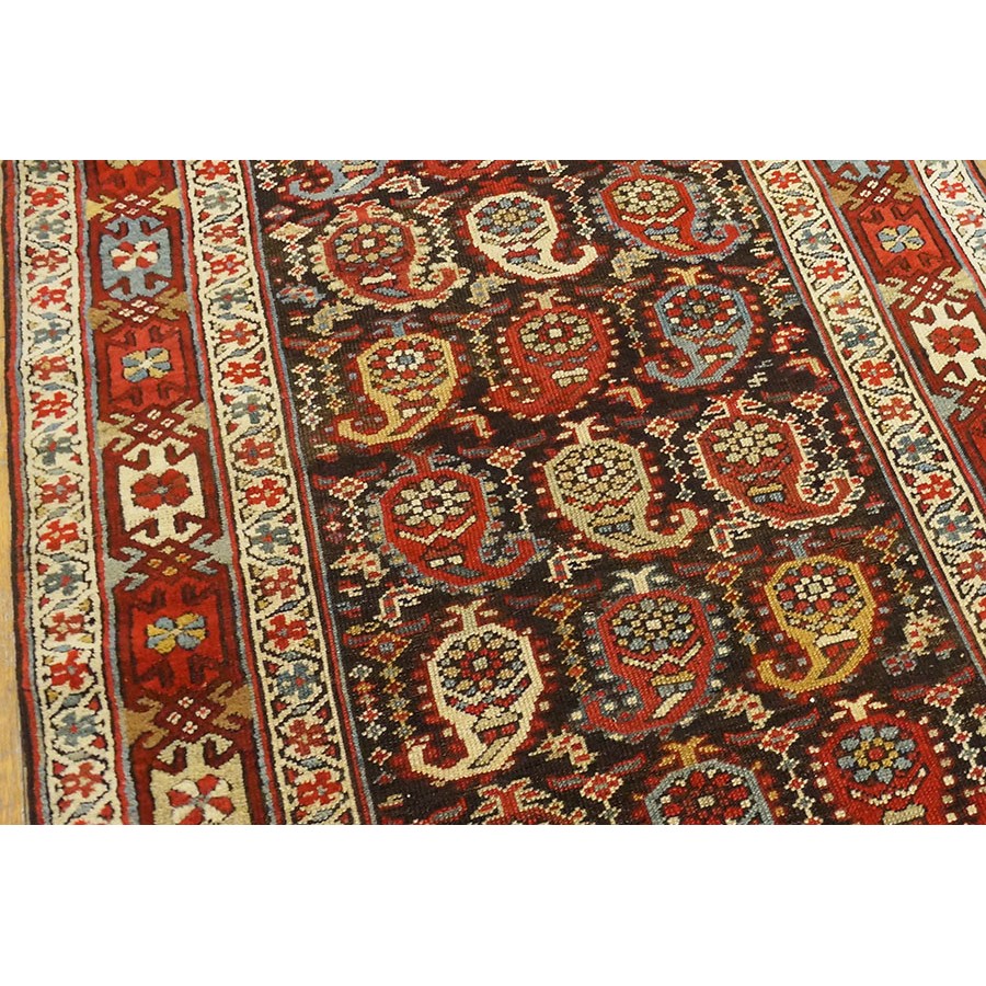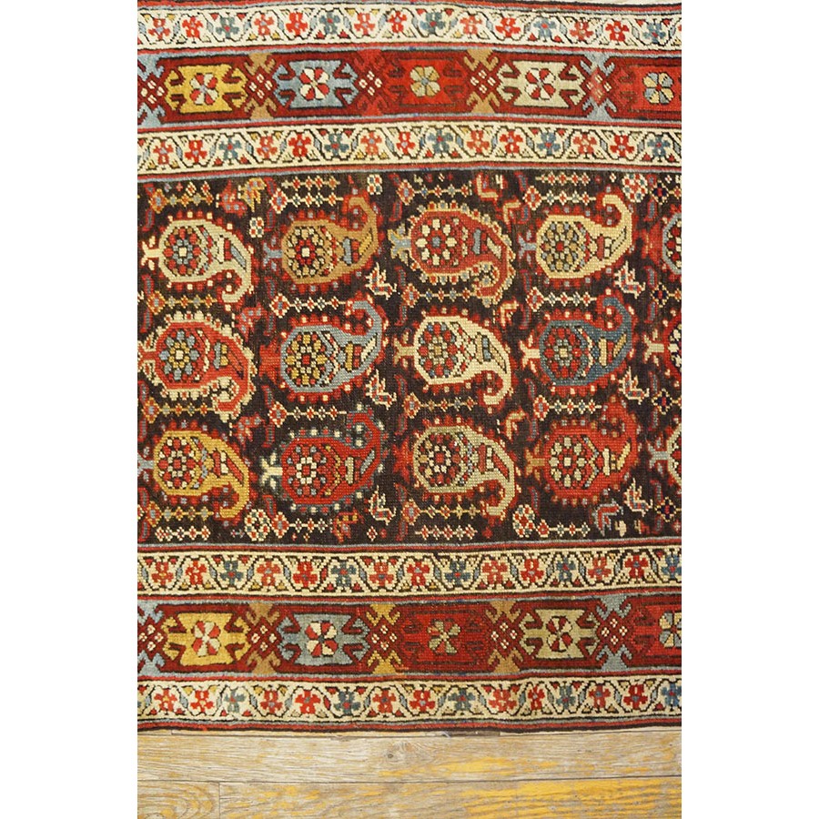 All-over design with rows of boteh and small birds on a brown ground. Interesting main border with linked design elements atop an alternating color background. Hand knotted wool construction.