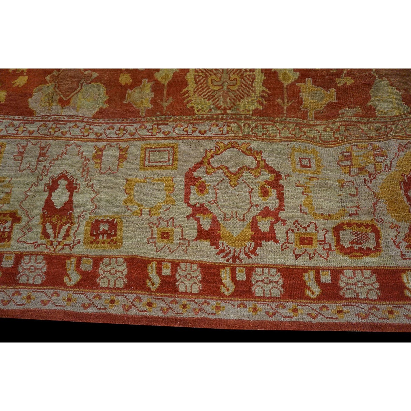 A red field with an orange tinge is the foil for an in and out palmette and coloudband pattern loosely adapted from classical 17th century Indo-Isfahan carpets. The pale green matching border has the same historical roots. The wide proportions are typically Ushak, however, and the lack of an underlying vinery results in a more free-floating pattern for this late 19th century western Anatolian carpet.