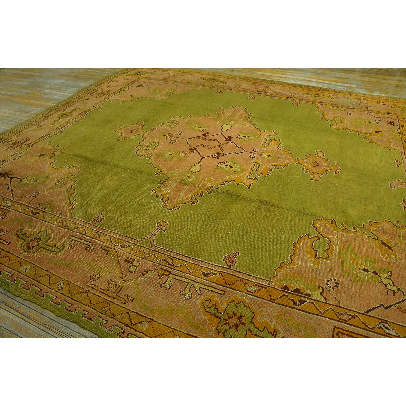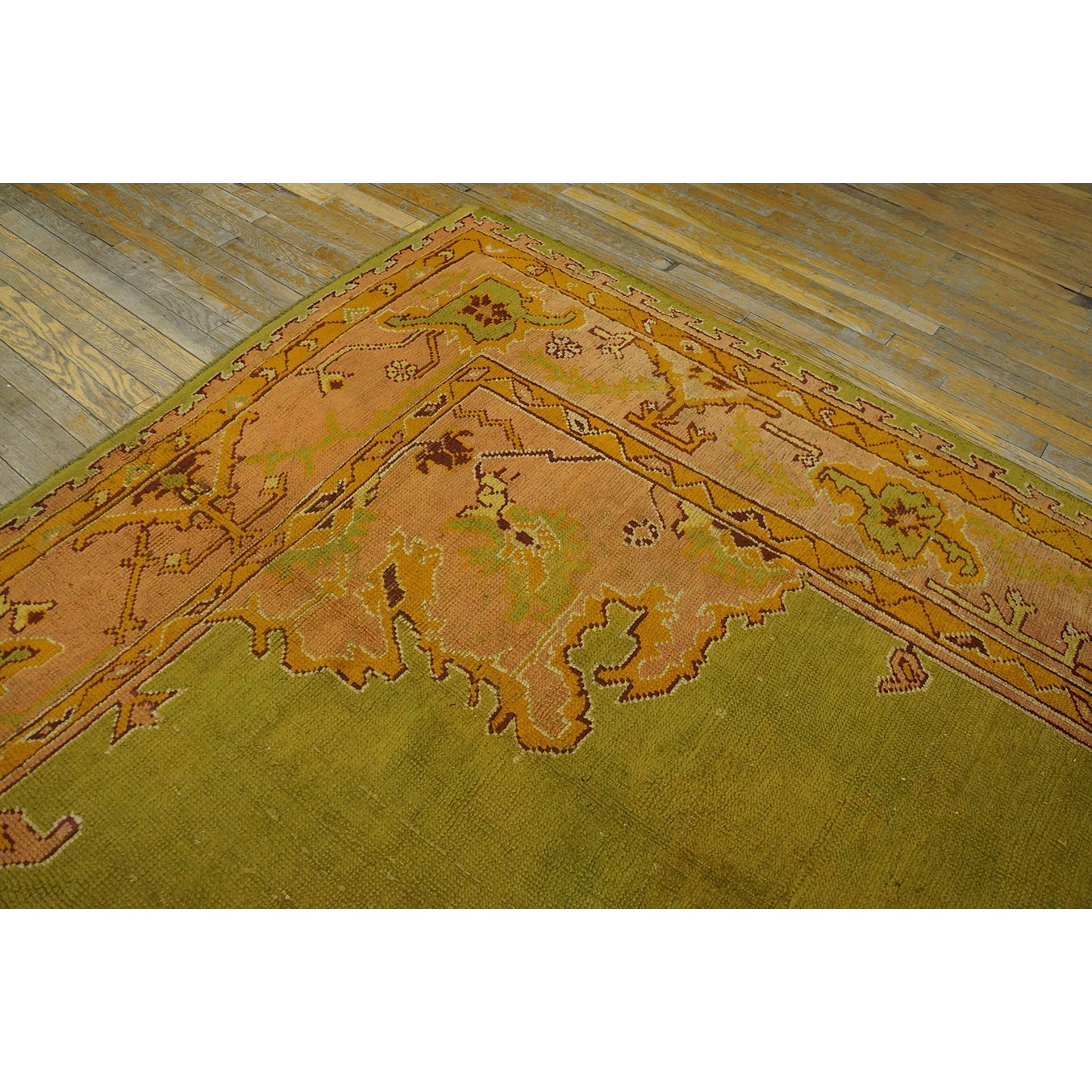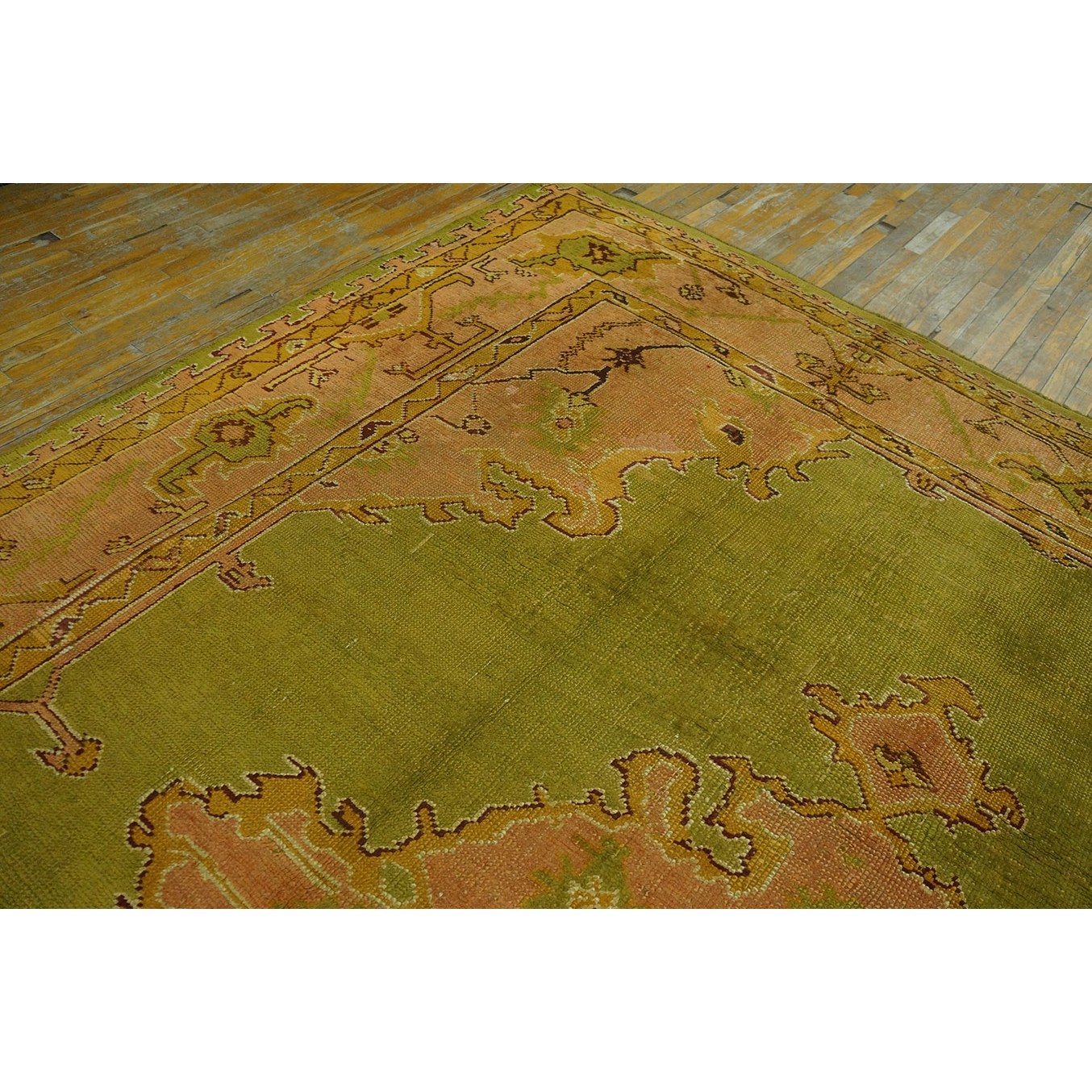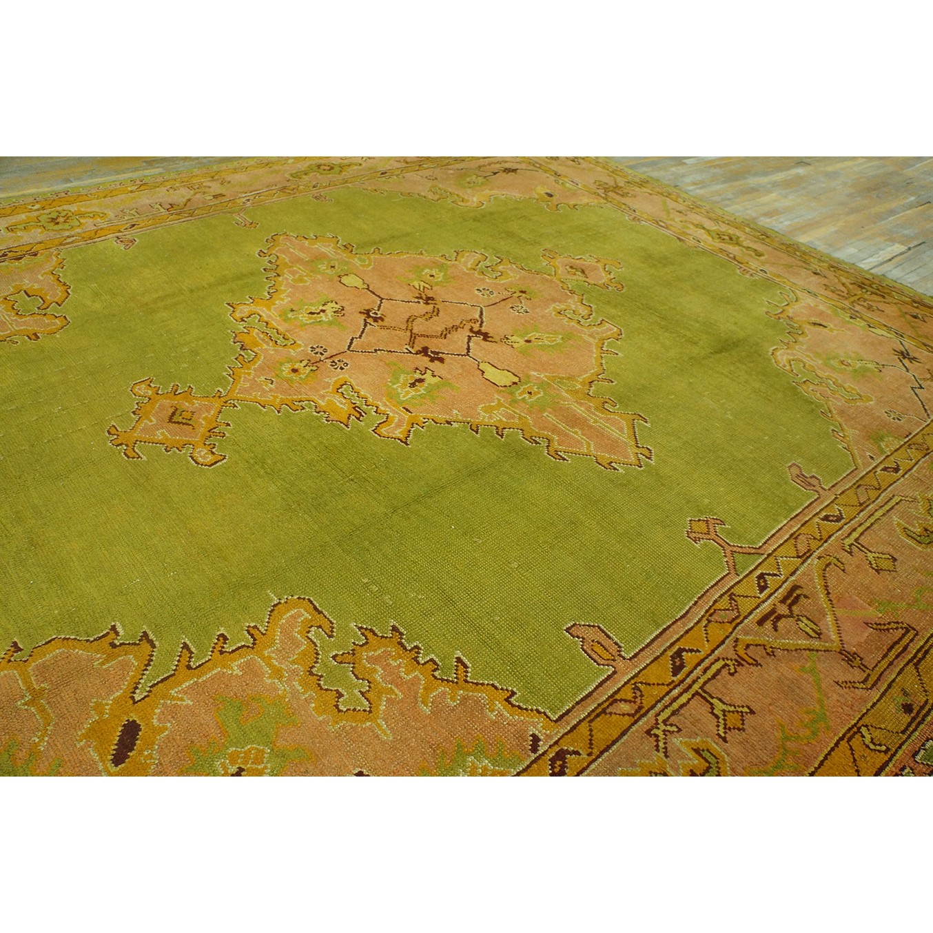 A light lime green open field is centred by a pale salmon medallion and is clasped by en suite quarter corners. The edges of these elements are roughly and irregularly drawn as if the weavers were following their own inclinations. The main border is similarly undisciplined. This circa 1900 carpet has the offbeat colour palette characteristic of the period. The weave is coarse, but the condition is generally quite good.