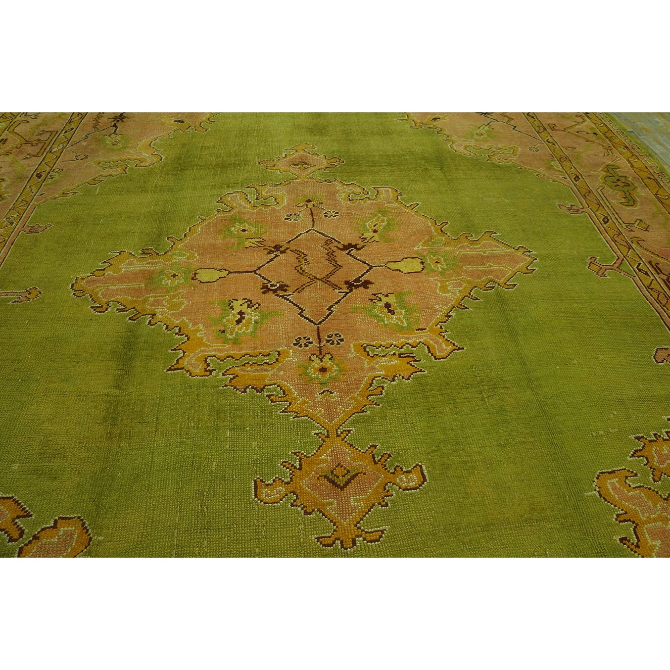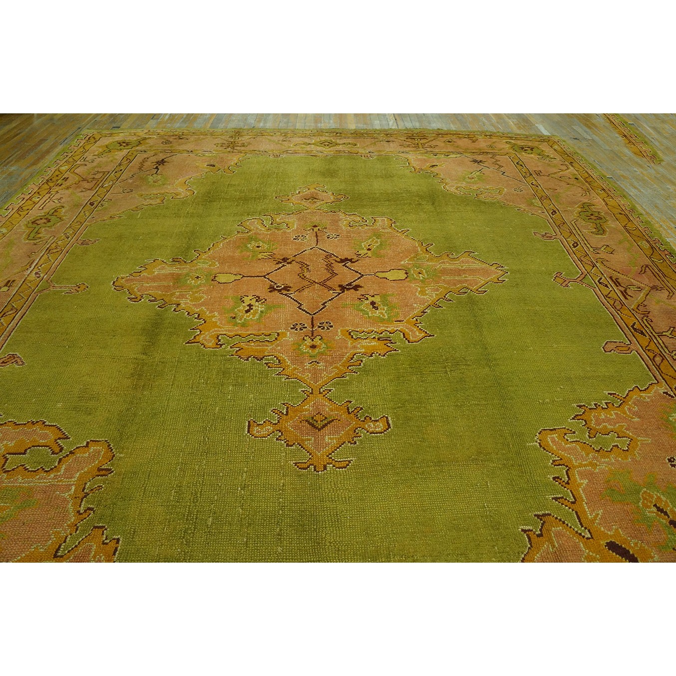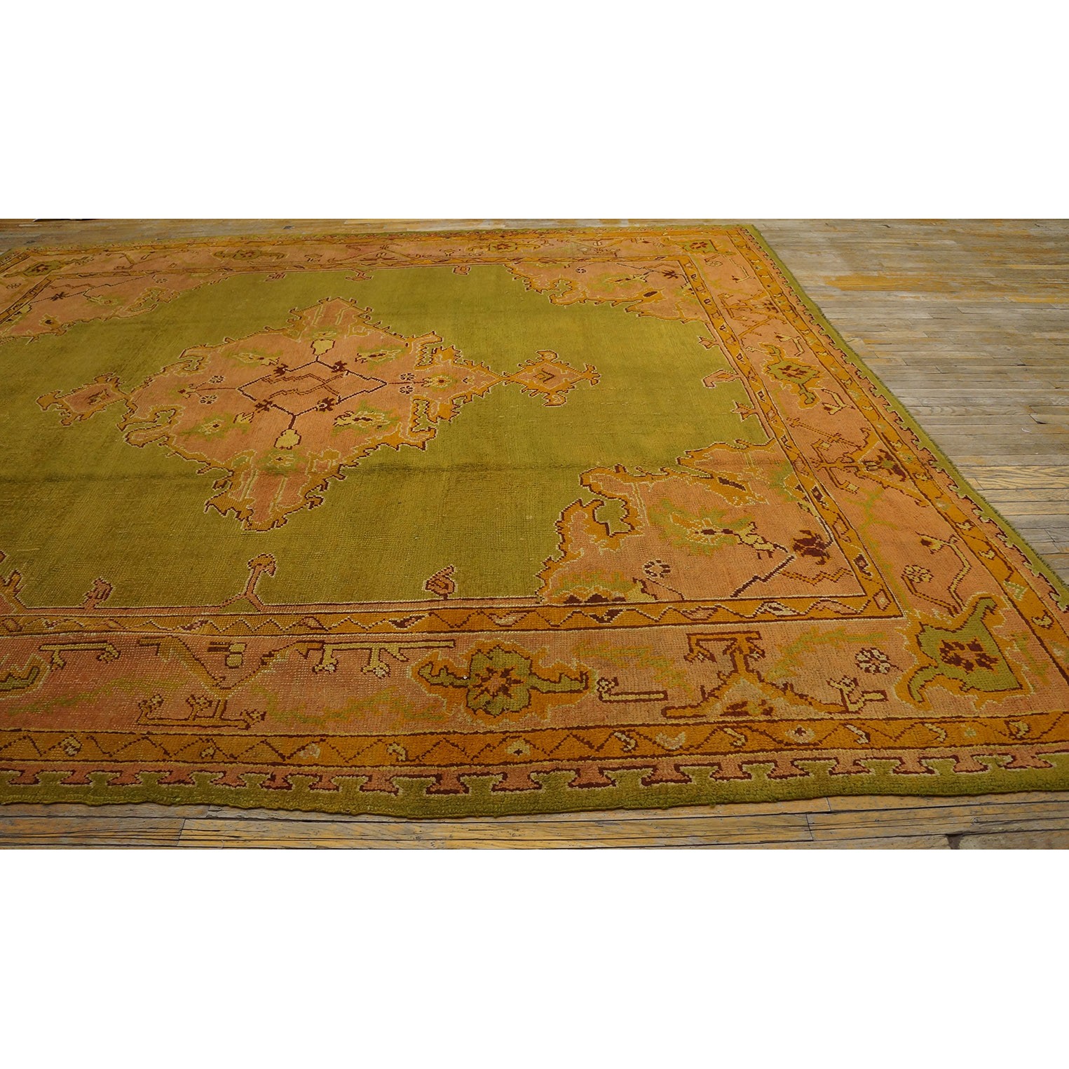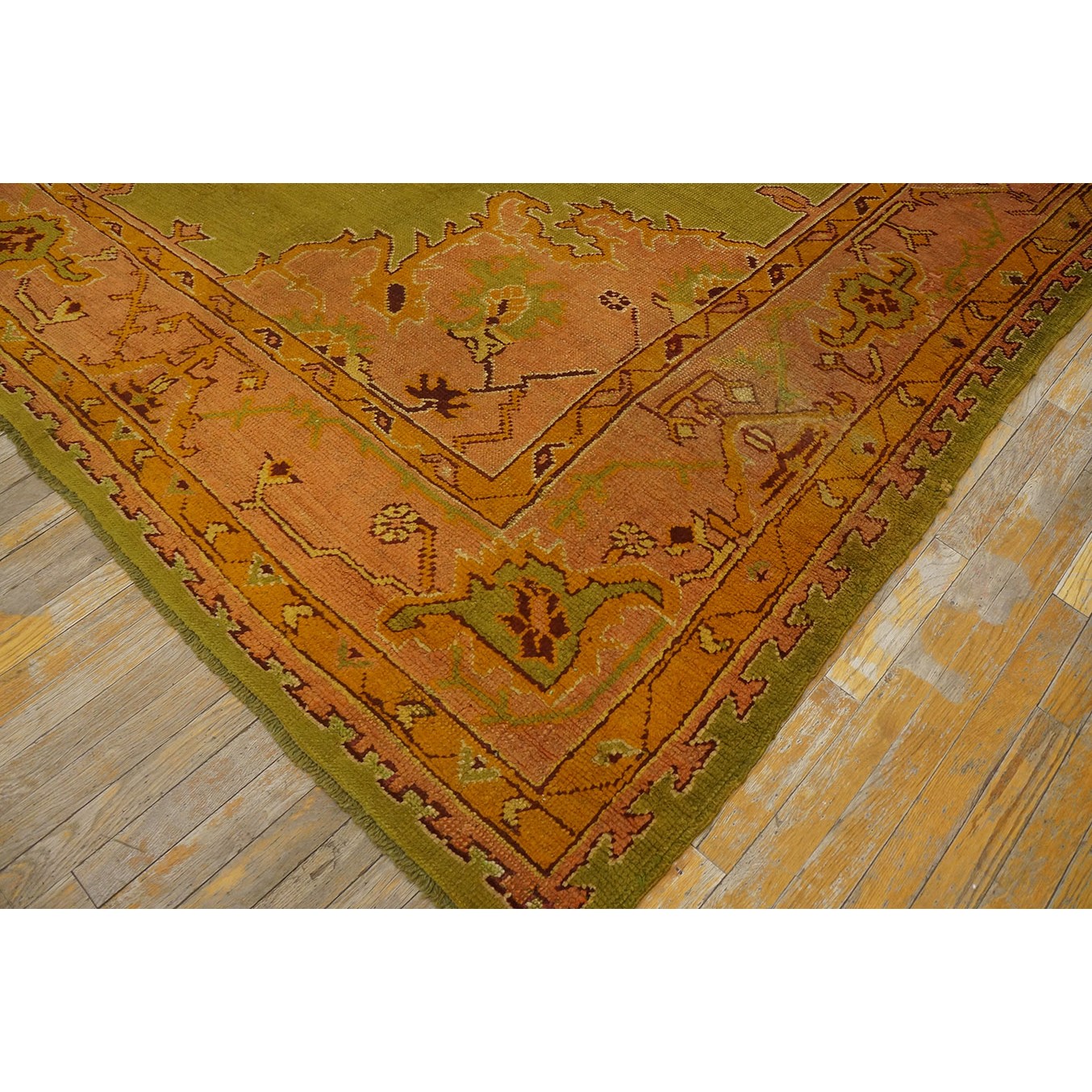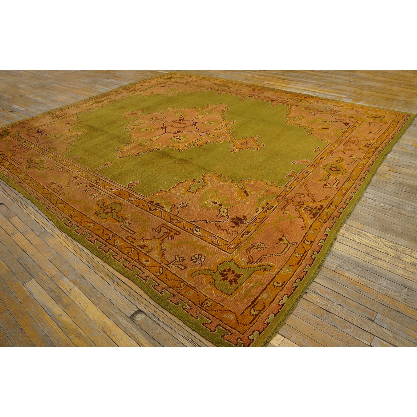 A light lime green open field is centred by a pale salmon medallion and is clasped by en suite quarter corners. The edges of these elements are roughly and irregularly drawn as if the weavers were following their own inclinations. The main border is similarly undisciplined. This circa 1900 carpet has the offbeat colour palette characteristic of the period. The weave is coarse, but the condition is generally quite good.