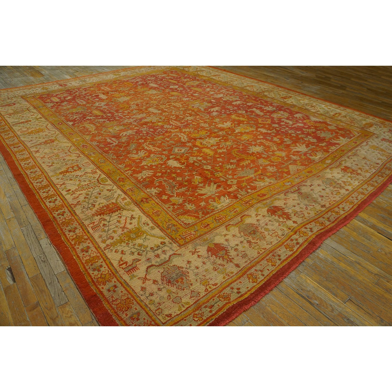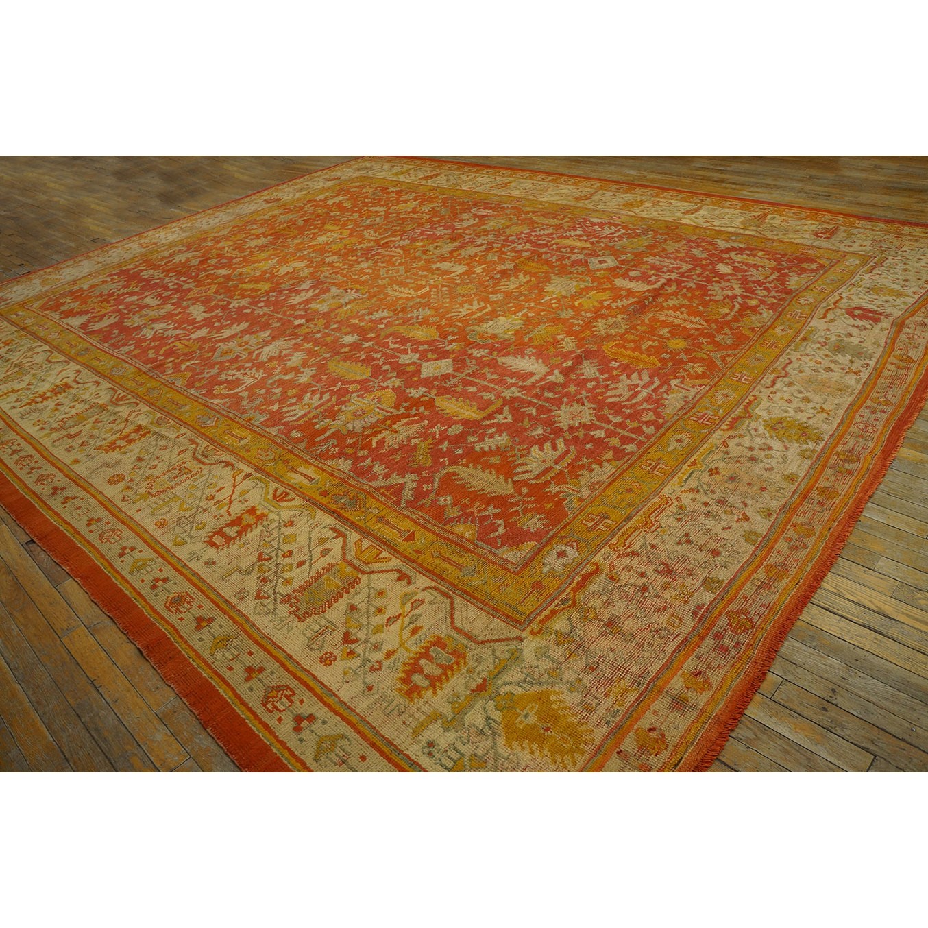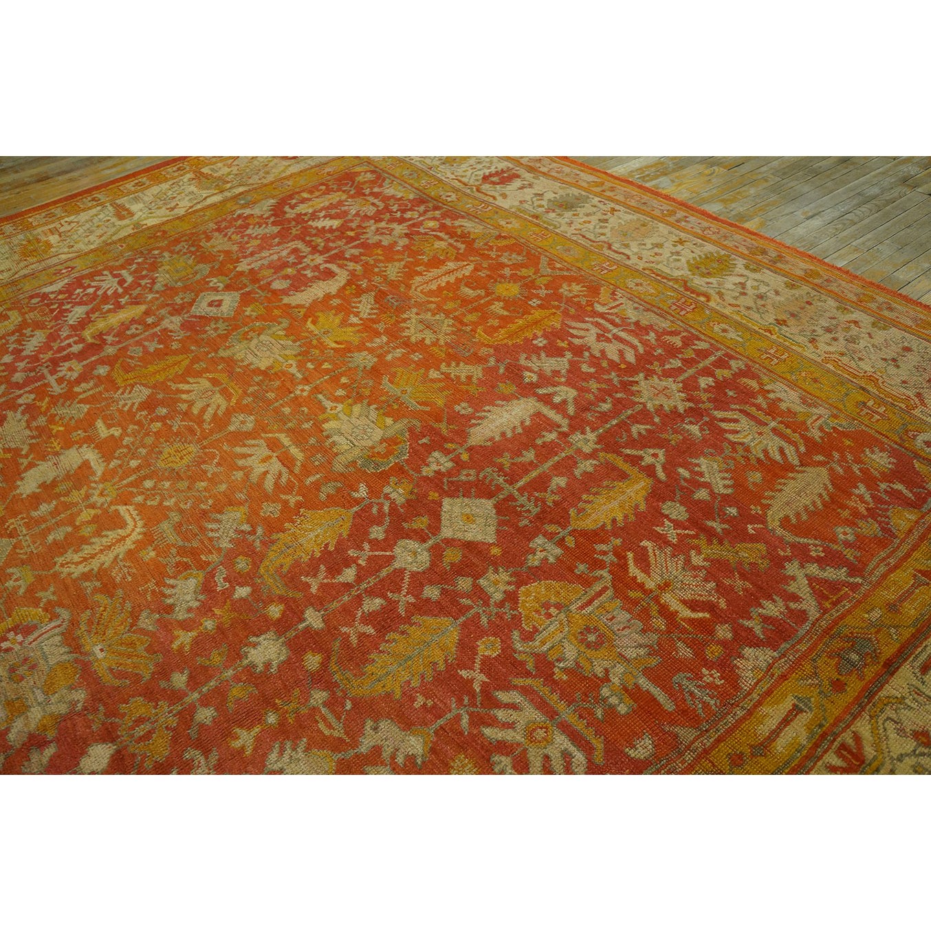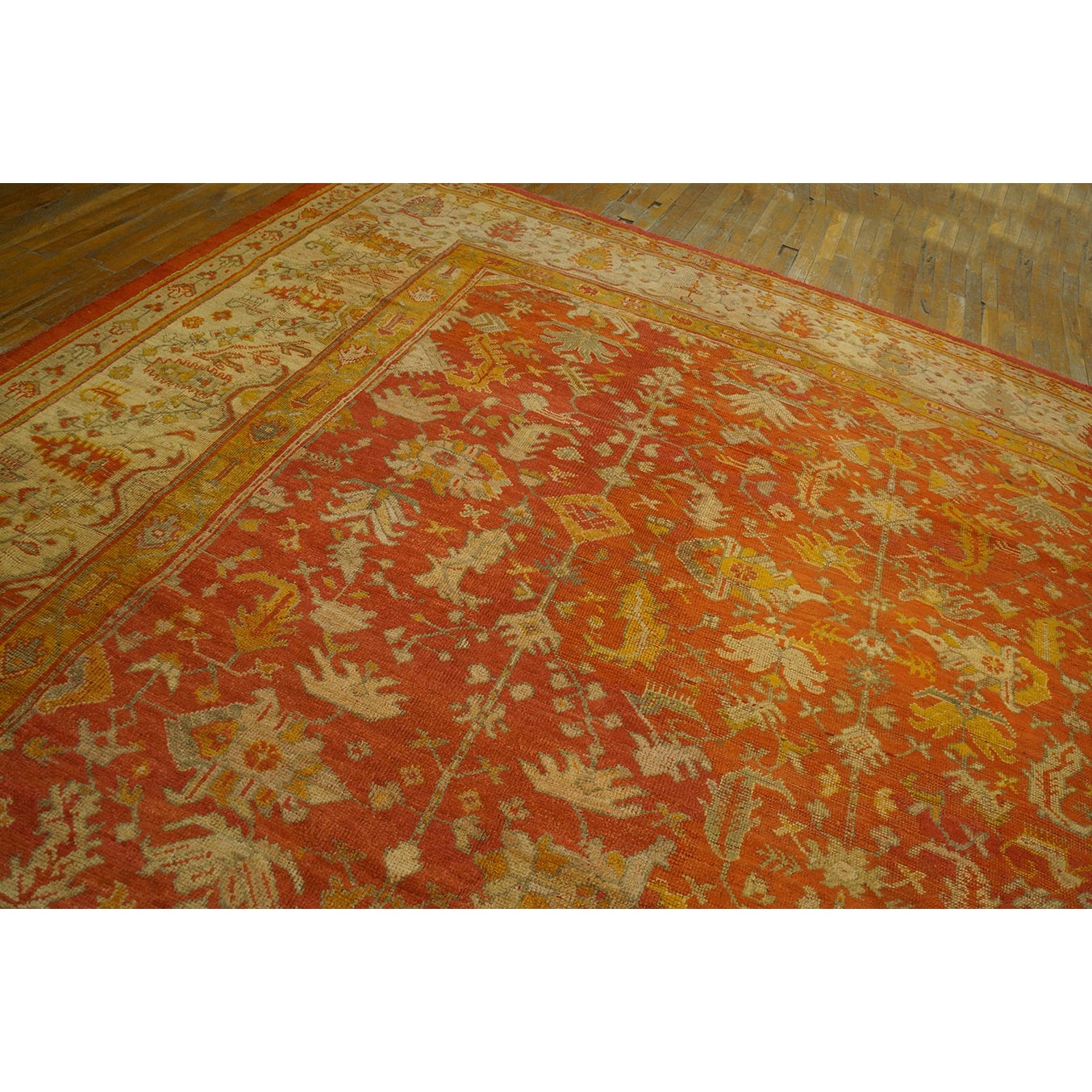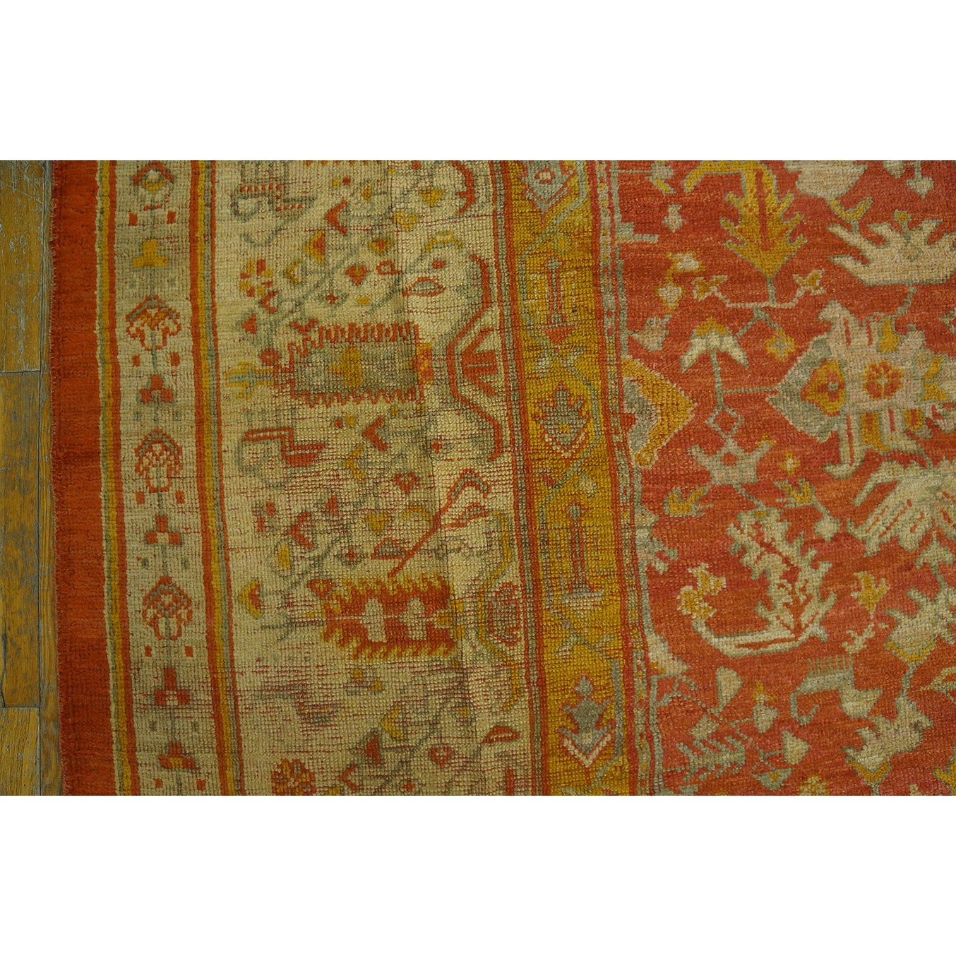 The Turkey red ground works splendidly with the light blue of the palmettes, angular lancet leaves and snippets of floral vines. There is a central organizing axis and two more expicit lateral poles. The wide ivory main border displays two species of cypresses and intervening hyacinth sprays. The bright orange helps to date the rug to the later 19th century. This is an attractive west Anatolian essay at a general Persian style carpet.