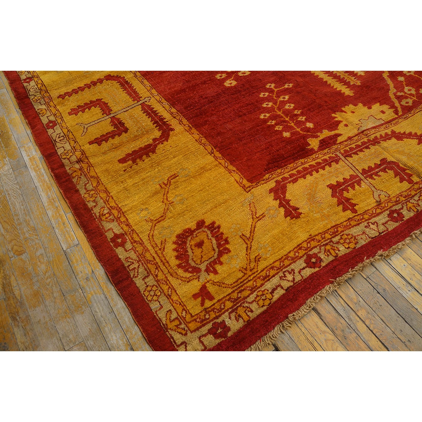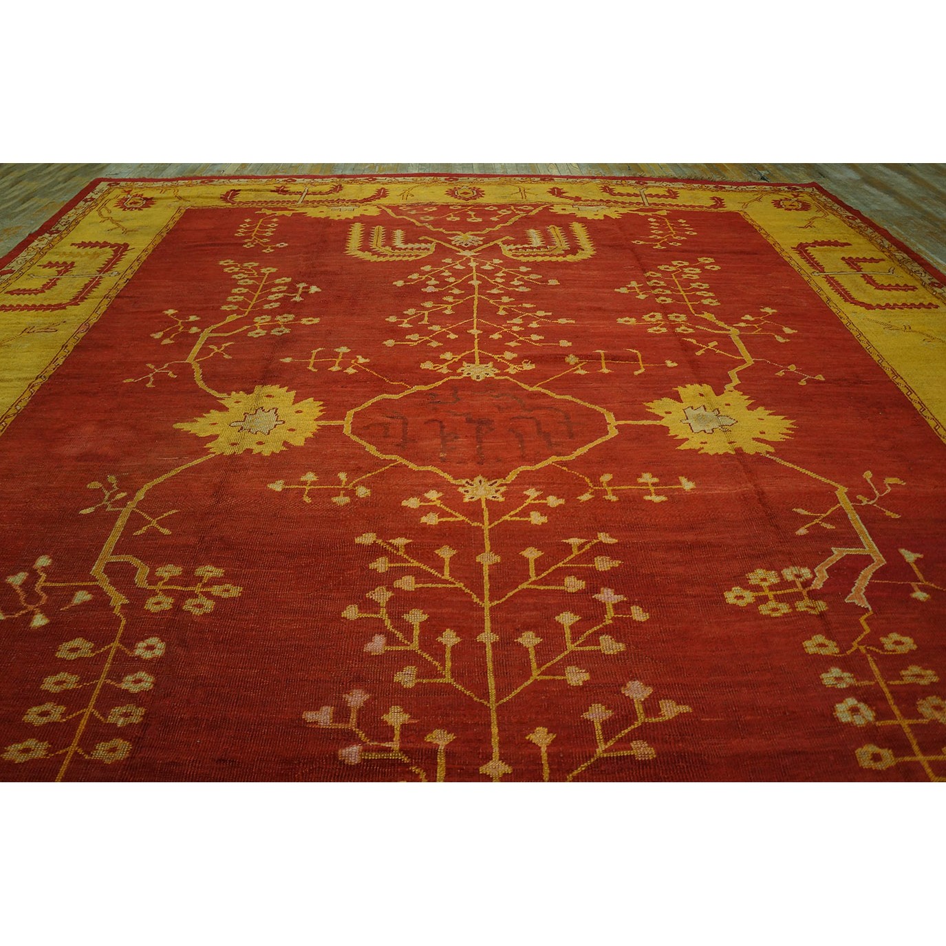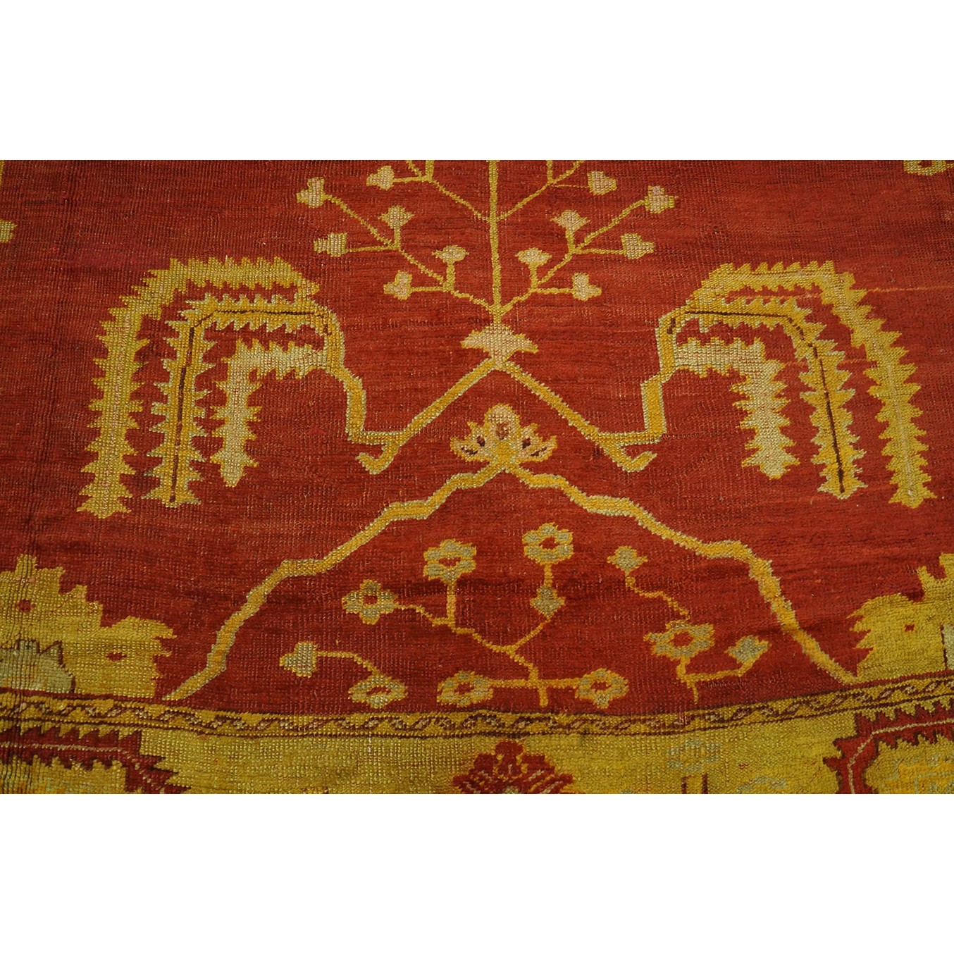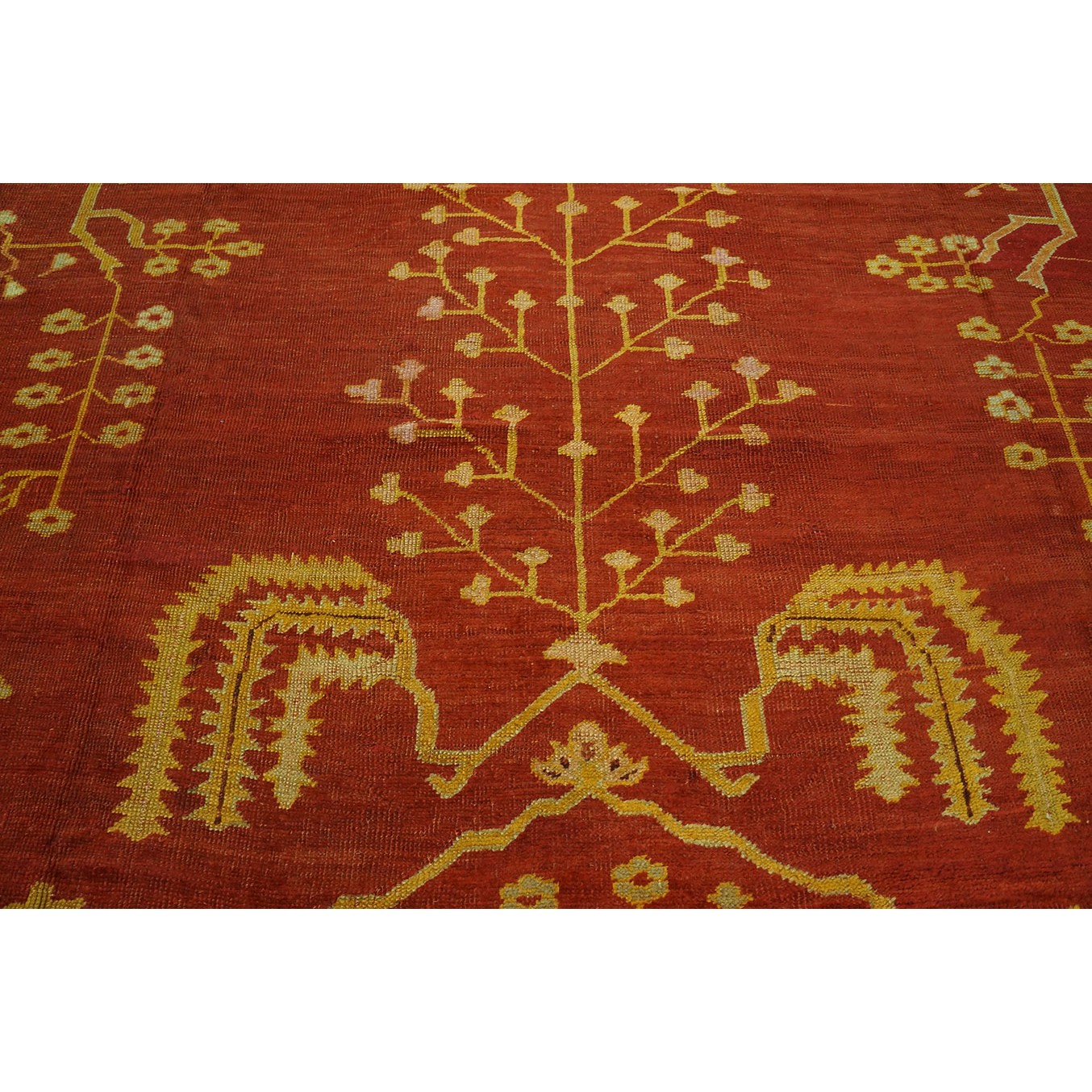 Before English Arts & Crafts carpets copied Oushaks, Oushak did Arts & Crafts, as is abundantly evident in this splendid red circa 1880s rug with wiry flowering vines, abstracted weeping willow elements, and a few large palmettes. The effect is spacious and open, and this generous approach continues with the rich golden main border with more, right angled weeping willows with palmette spacers. The colour scheme is relatively narrow, but the result is gracious and informal.