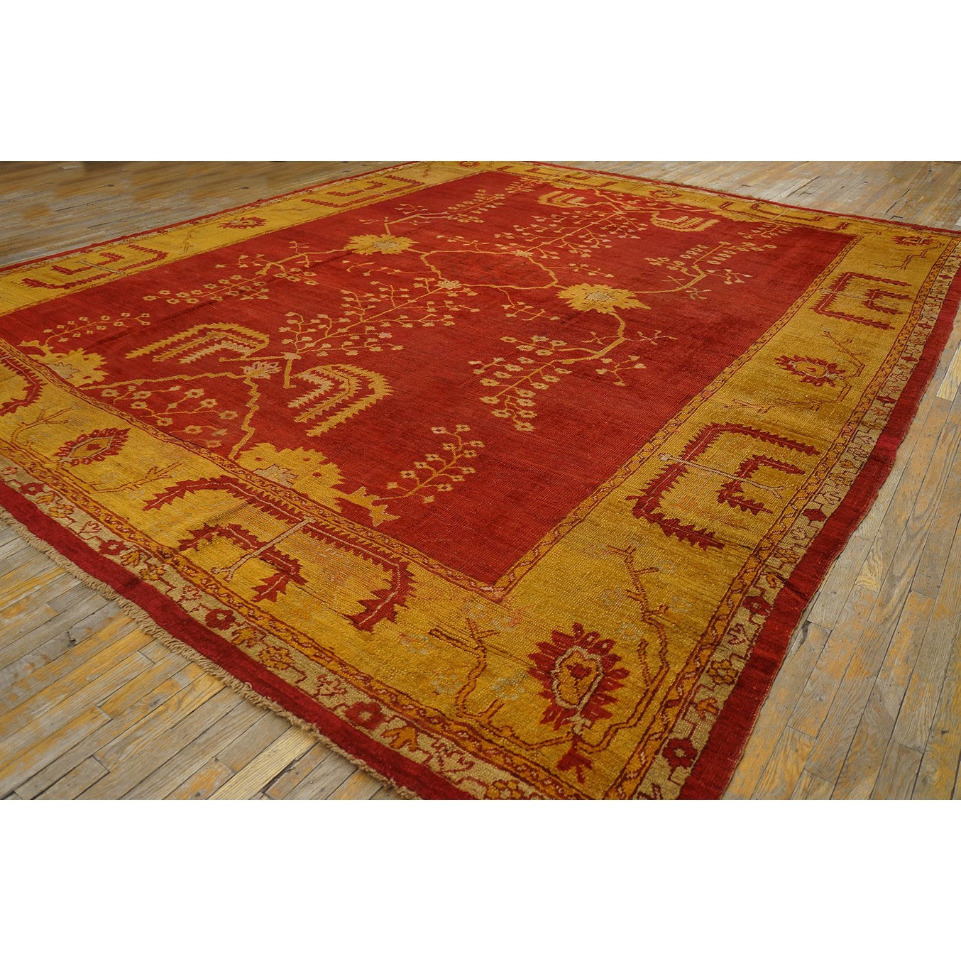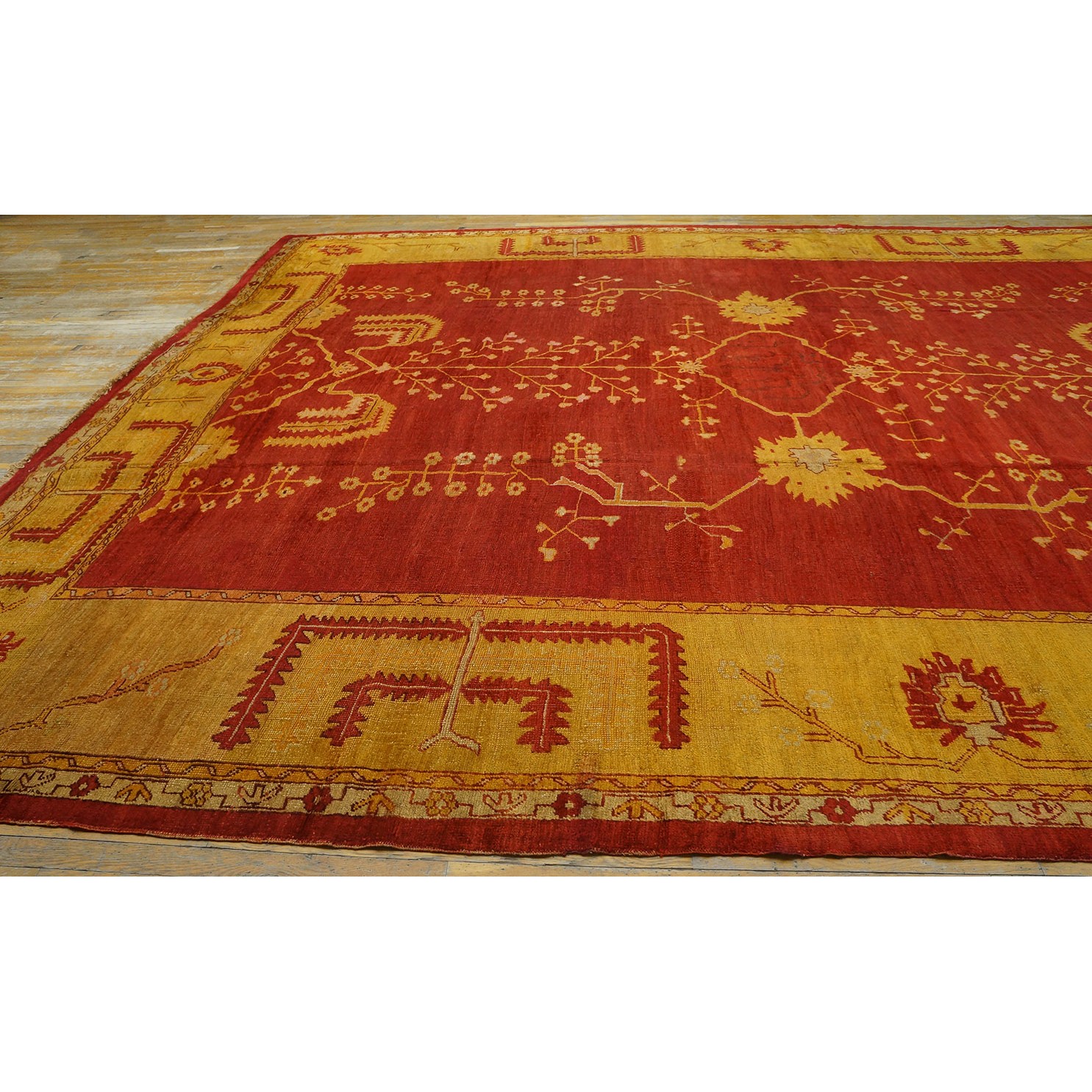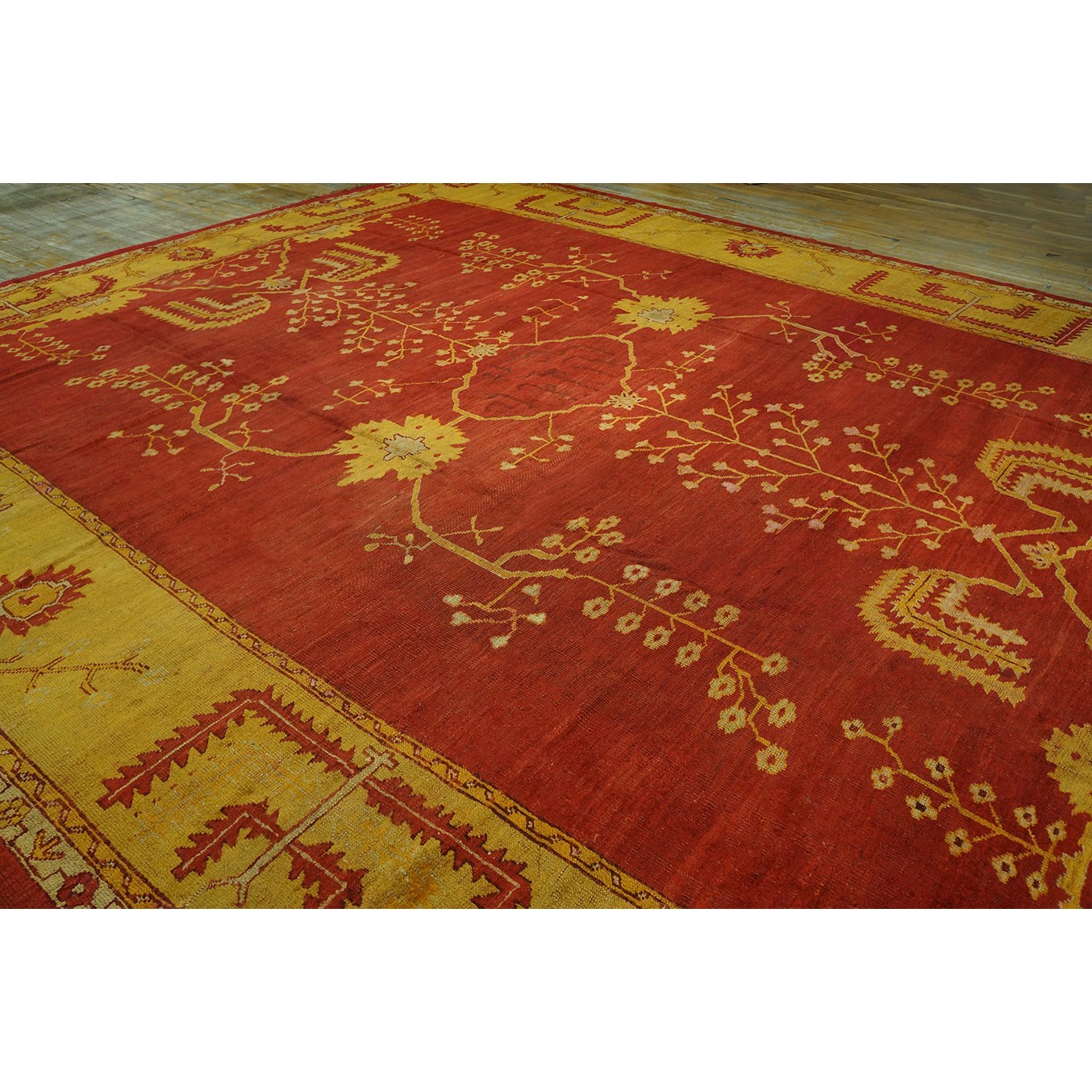 Before English Arts & Crafts carpets copied Oushaks, Oushak did Arts & Crafts, as is abundantly evident in this splendid red circa 1880s rug with wiry flowering vines, abstracted weeping willow elements, and a few large palmettes. The effect is spacious and open, and this generous approach continues with the rich golden main border with more, right angled weeping willows with palmette spacers. The colour scheme is relatively narrow, but the result is gracious and informal.