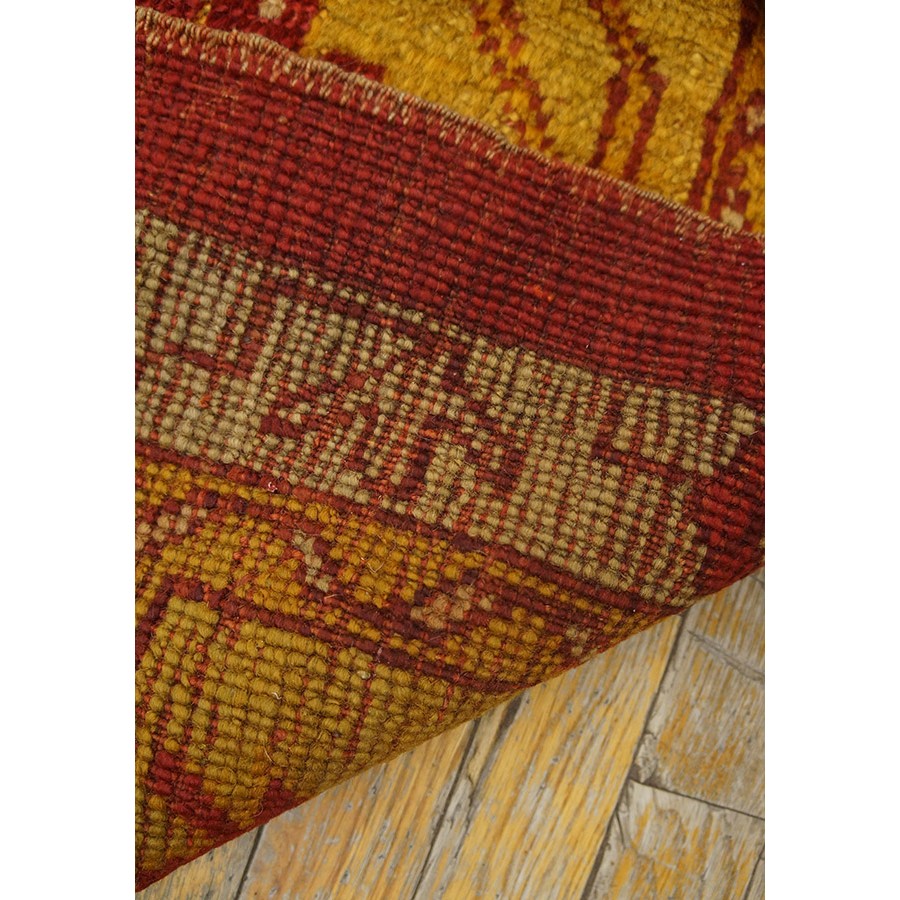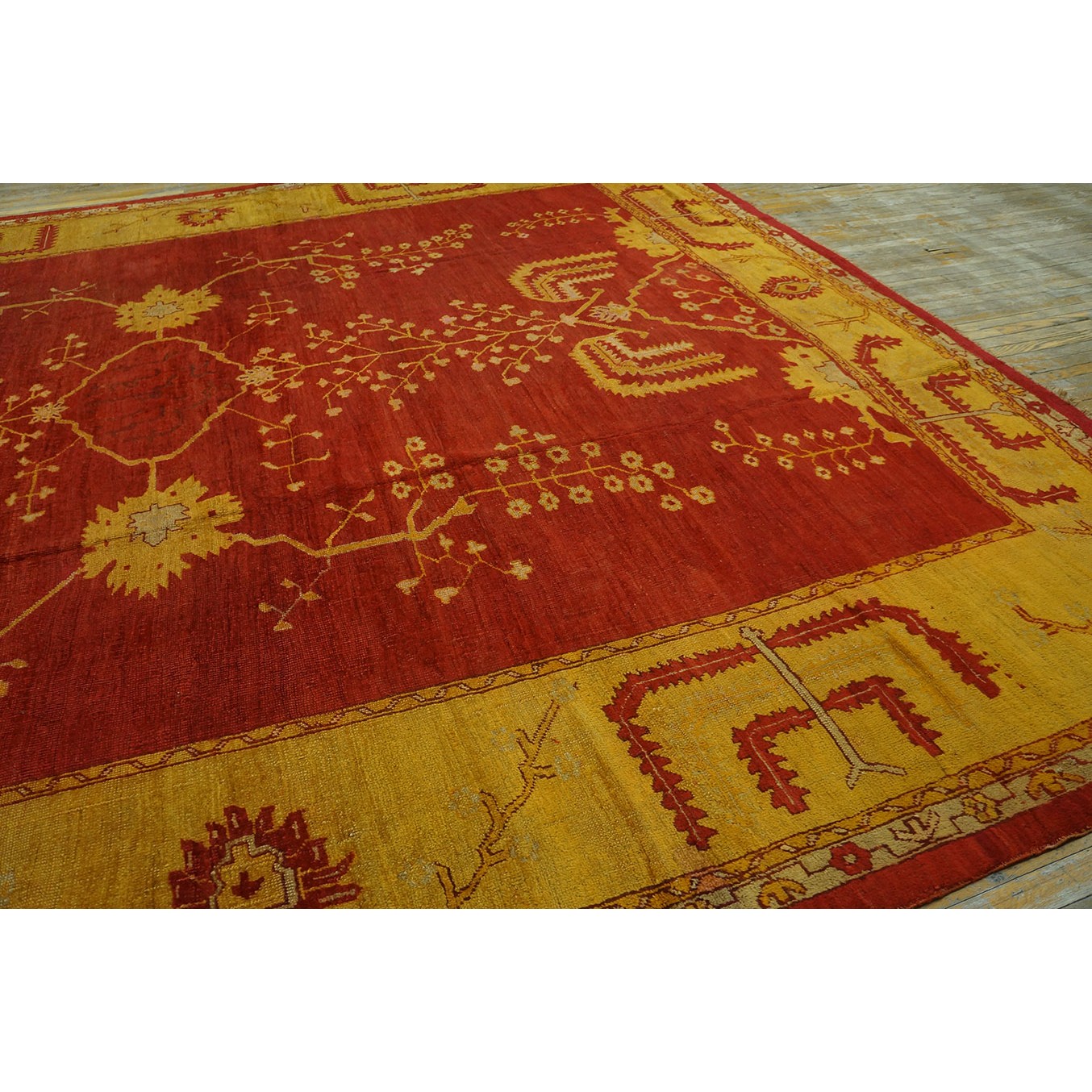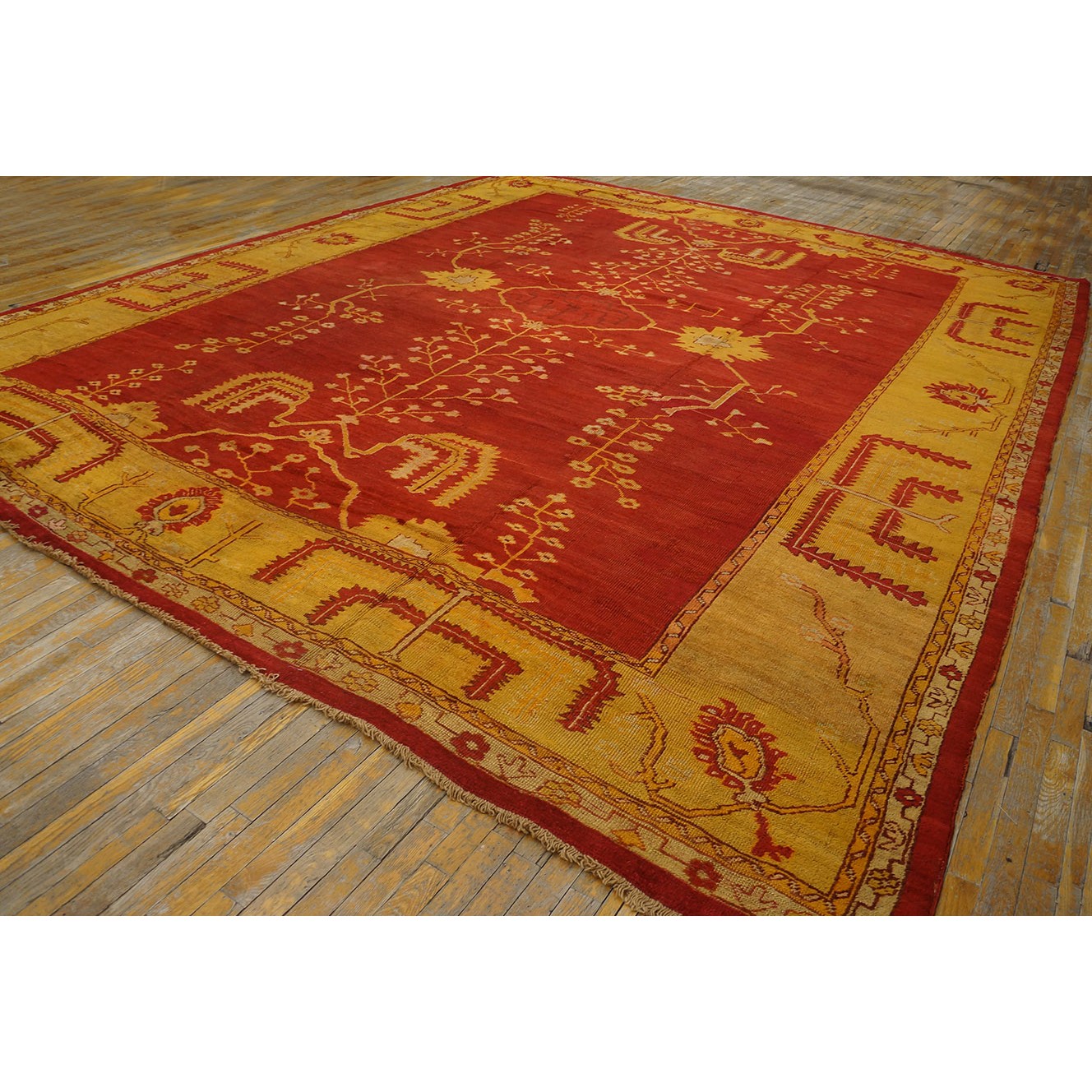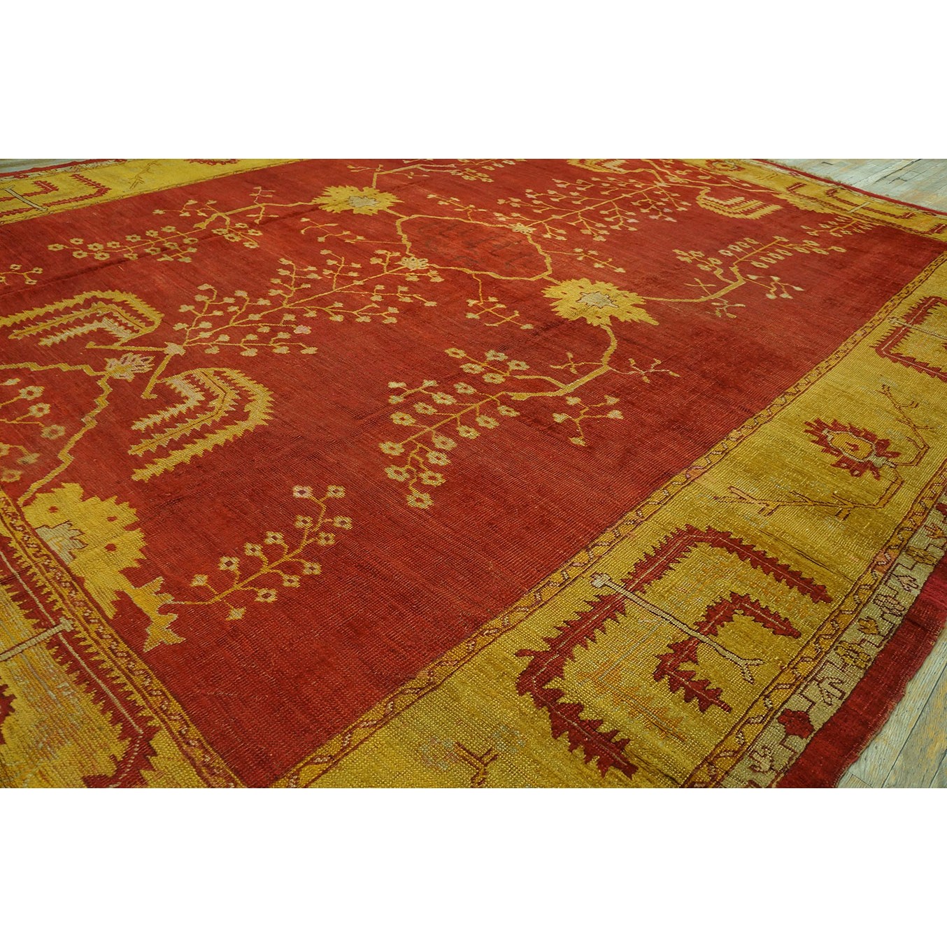 Before English Arts & Crafts carpets copied Oushaks, Oushak did Arts & Crafts, as is abundantly evident in this splendid red circa 1880s rug with wiry flowering vines, abstracted weeping willow elements, and a few large palmettes. The effect is spacious and open, and this generous approach continues with the rich golden main border with more, right angled weeping willows with palmette spacers. The colour scheme is relatively narrow, but the result is gracious and informal.