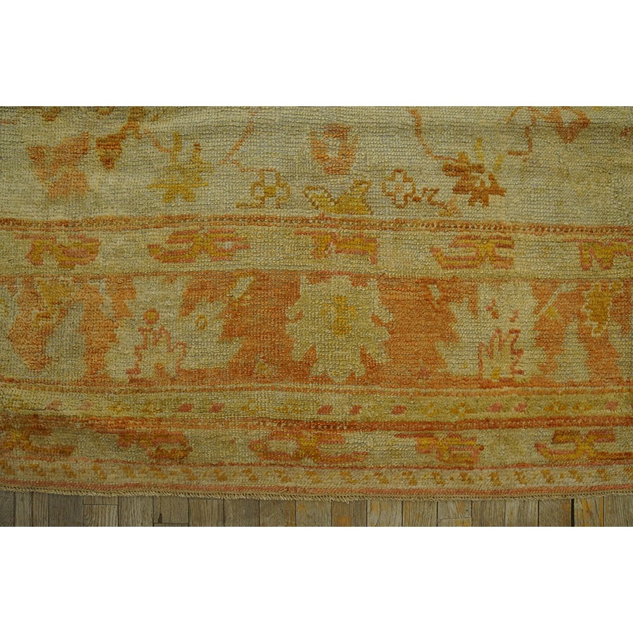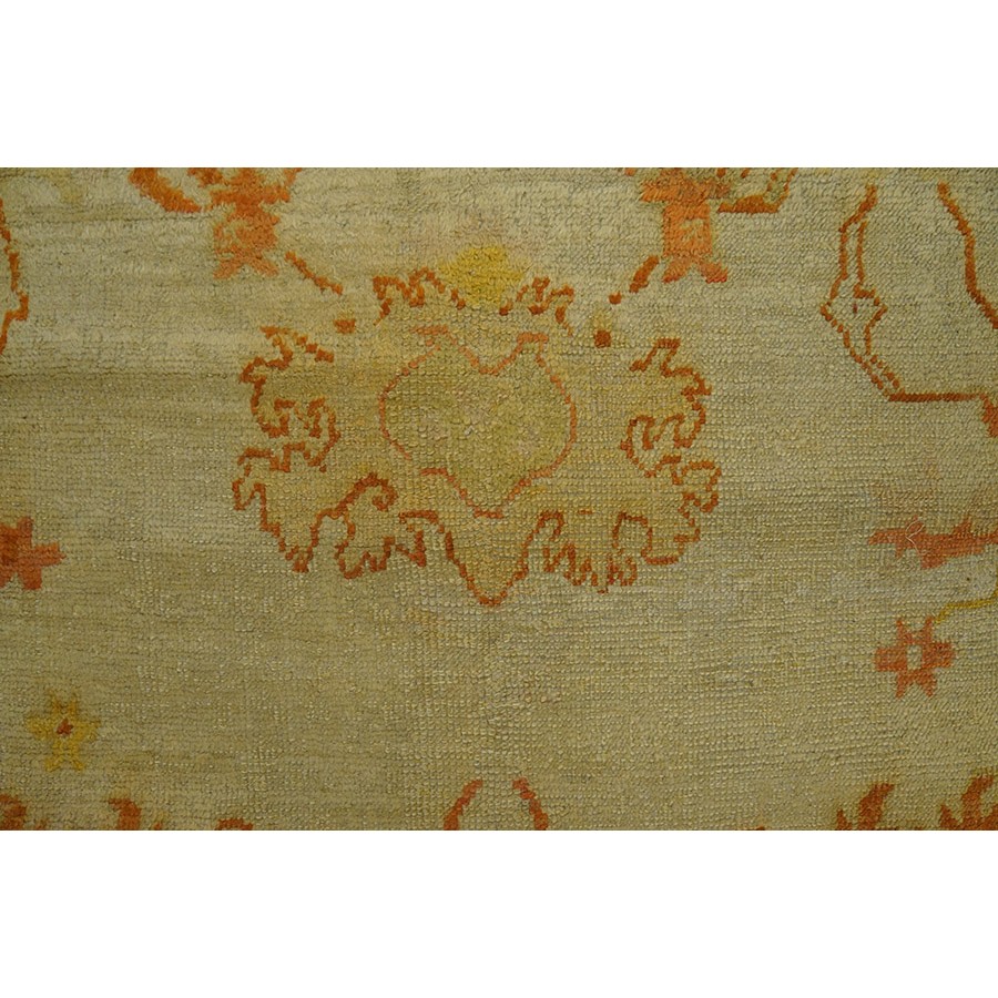 This very good condition antique Oushak shows an open array of ragged palmettes – up, down, lazy and slanted – partially connected by short, angular vinery and accented with yellow, rust-brown, ecru and light green, on the sandy cream field, with a main border of ragged palmettes and cloud band elements. The eccentric, unbalanced pattern makes this Oushak particularly charming while the palette is just light enough for current tastes.