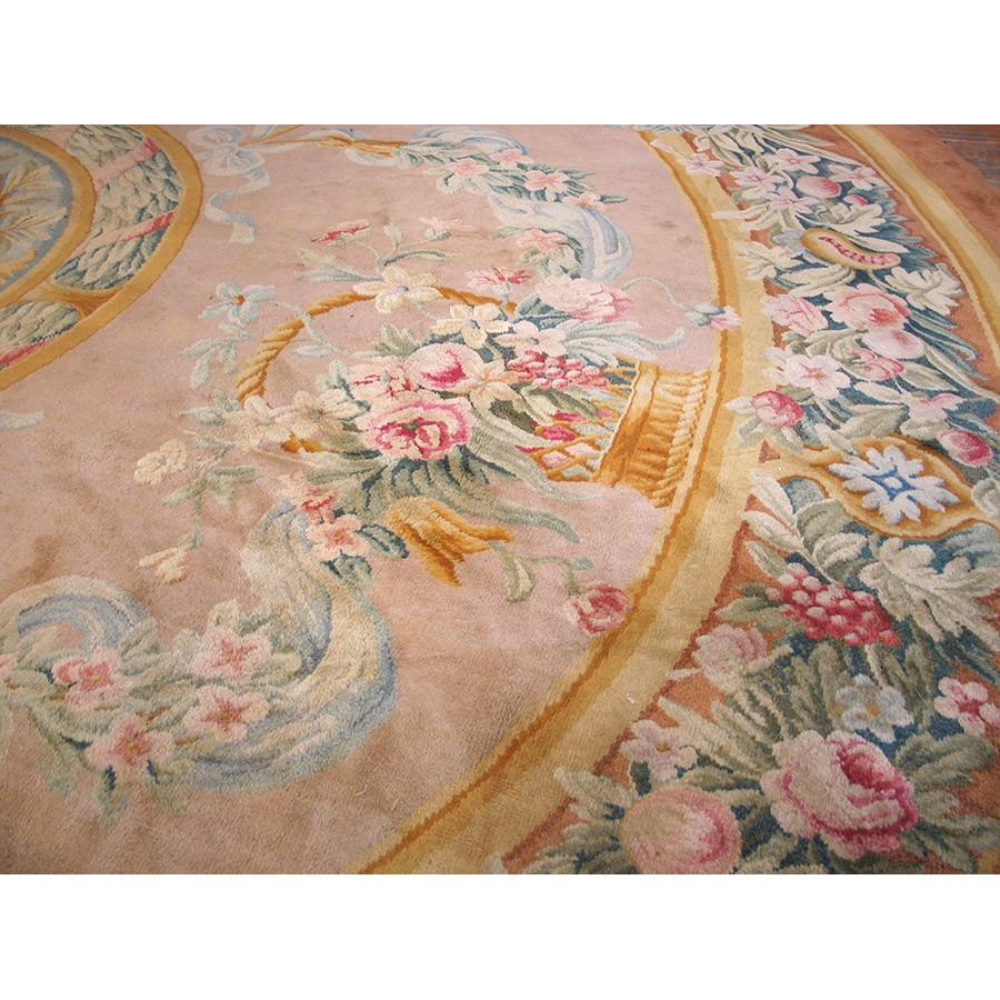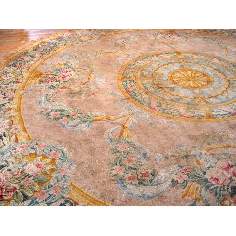 Large, round antique high pile Savonneries carpets are rare. The four-layer round medallion shows a rosette, laurel leaves and ribbons, and loops, on a tan ground decorated with basket-bouquets and flowering garlands. Densely packed wreaths punctuate the composite vegetal border. The border seems more raised, the field lower. Gold, cream and rust are among the many detail tones on this clearly unique antique Savonnerie carpet for a very special room.