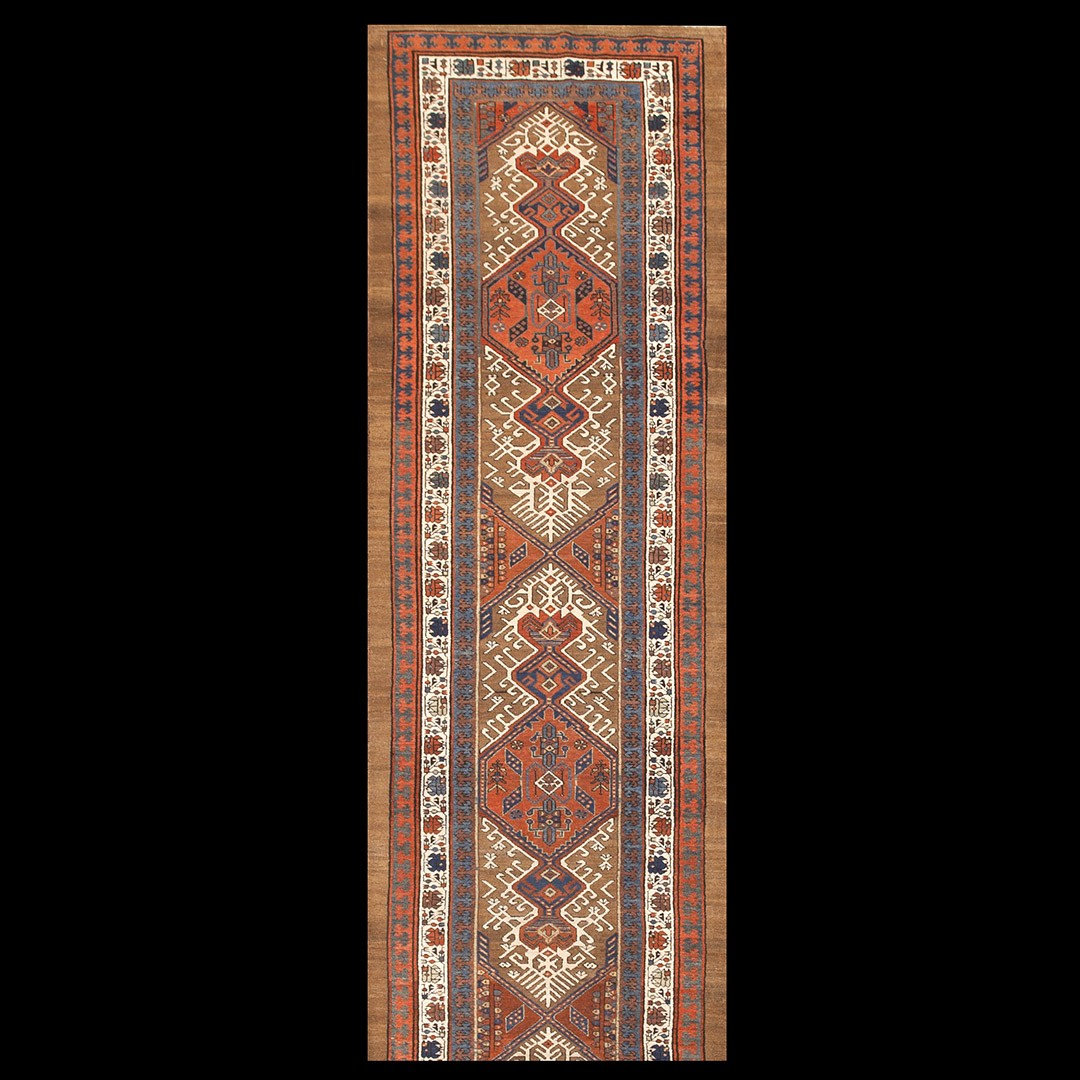 DescriptionSerabThis town on the edge of the Heriz area in Northwest Iran now almost exclusively weave runners in a restricted design range with a major use of camel tones in both field and border. This style and formality can be traced continuously back almost 200 years. Thus 19th century pieces can easily be chronologically located. Older pieces are all wool, but more modern rugs are on a cotton foundation. The pile is of high quality wool, compact. Turkish knotted and long wearing. Serab runners are among the worst recognizable and popular of Persian rugs. | |